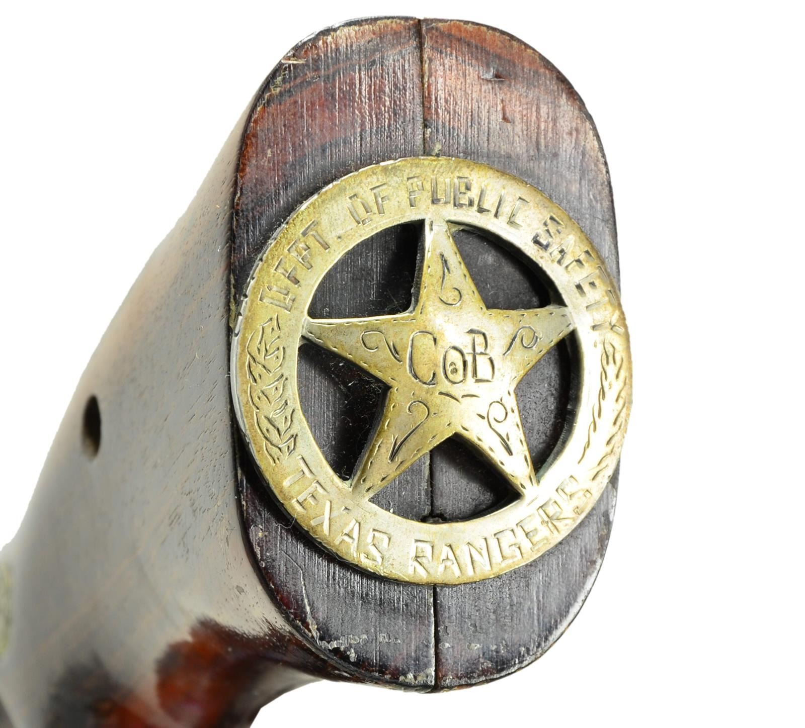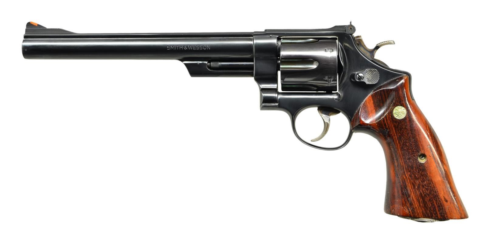 Cal. 44 Mag. S# N122958. Bbl 8 3/8". Mfg.1973. Blued finish. Double action revolver built square butt N frame. Shrouded extractor w/ knurled rod end. Red ramp insert front sight w/ white outline micrometer click adjustable rear sight. 6 shot, fluted & counterbored cylinder. Large spur (.500") target hammer w/ corresponding serrated wide trigger. Smooth hardwood grips w/ gold medallions & 1.56" Texas Ranger star bonded to bottom. CONDITION: Bluing coverage is complete & consistent w/ only slight thinning at muzzle & on a few high spots. Finish appears factory original. Unable to remove grips due to bonded star at bottom. Grips show light wear w/ a few small impressions & scratches. 2 consecutive chambers slightly out of time, so slightly that normal use, in both double & single action should easily overcome it. Bright bore w/ sharp rifling. (22-5782/JZ). MODERN. $1,000-1,500.