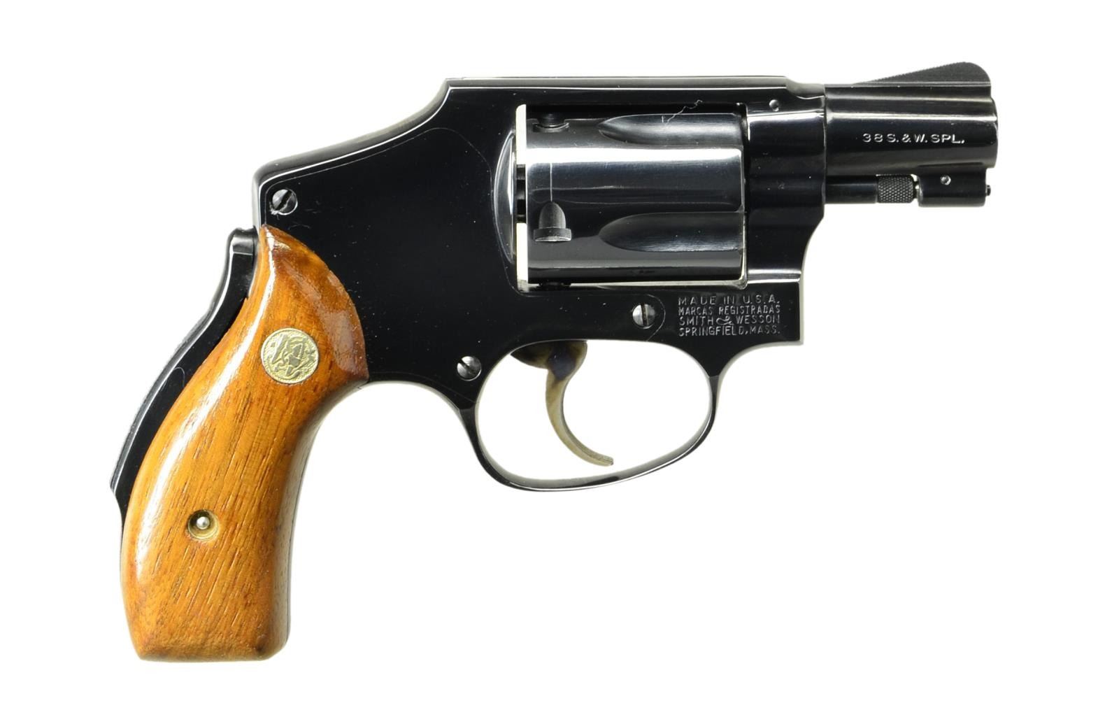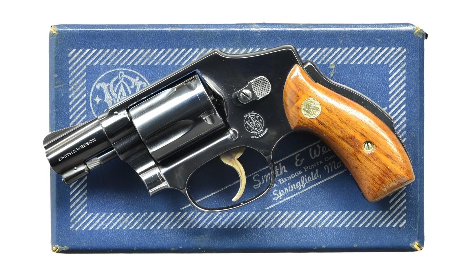Cal. 38 Spl. S# L5849. Bbl. 1 7/8" pinned w/ ramped serrated blade front sight & frame notched rear. Mfg. 1971-1974. Blued w/ matching # smooth rnd. butt walnut grips. Grooved grip safety & case colored grooved faced trigger. UNATTACHED ACCESSORIES: matching numbered blue 2 piece box w/ cleaning kit & paper work. CONDITION: very faint beginning turn line on cyl. from functioning. All other aspects near excellent appearing unfired. (23-391/JZ). MODERN. $600-900.