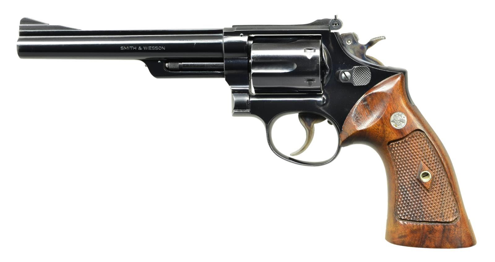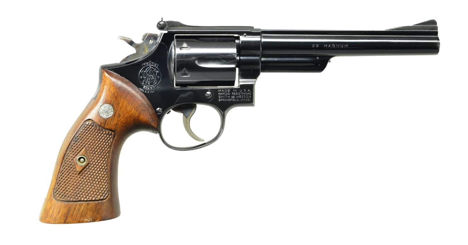 Cal. 22 Jet. S# K474761. Bbl. 6". Mfg.1962. Blued finish double action built on a 4 screw K frame. 6 shot fluted cylinder. 6" ribbed, pinned barrel marked "22 MAGNUM" on right side. Baughman ramp front & micrometer click adjustable rear sights. Checkered hammer spur w/ rimfire / centerfire selector & serrated trigger. 10 groove serrated backstrap & forestrap. Shrouded ejector rod. Checkered target grips w/ diamond at screw hole & S&W medallions. UNATTACHED ACCESSORIES: 6 inserts adapting 22 Jet to 22 LR. CONDITION: Original finish is complete & consistent w/ very few imperfections. Some gentle thinning on a few high spots. Thin, faint drag line on cylinder. Grips are very nice, demonstrating use in the form of some staining & lightly rounded checkering w/ a few tiny chips on left grip below checkered panel. Timing appears correct. Bright bore w/ strong rifling. (23-479/JZ). CURIO. $1,000-1,500.