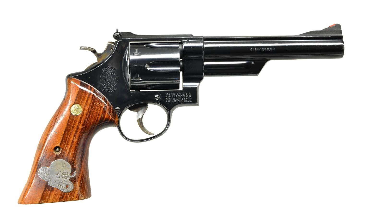 Cal. 41 Mag. S# N125188 Bbl. 6". Mfg.1973. Pinned & recessed model. 6 shot fluted cylinder. Blued finish. Red ramp insert front sight w/ white outlined, adjustable rear sight. Serrated top strap & barrel. Checkered hammer spur & cylinder release. Serrated front & rear straps. Wide serrated trigger. Smooth hardwood grips w/ S&W medallions. Right grip has custom inlay skull & snake. CONDITION: finish coverage is complete & consistent w/ thinning primarily at muzzle & a few small spots typically associated w/ holstering. Red front sight insert is a little loose. Fine drag line around cylinder. Grips have a few scratches but overall are very nice. Custom engraved inlay seated flush w/ grip finish & possesses sharp details under close examination. Slightly out of time on 2 consecutive chambers, so little that standard cocking or utilizing double action nullifies the situation. Bright bore w/ strong rifling. (22-5781/JZ). MODERN. $800-1,200.
