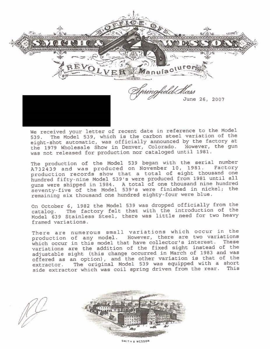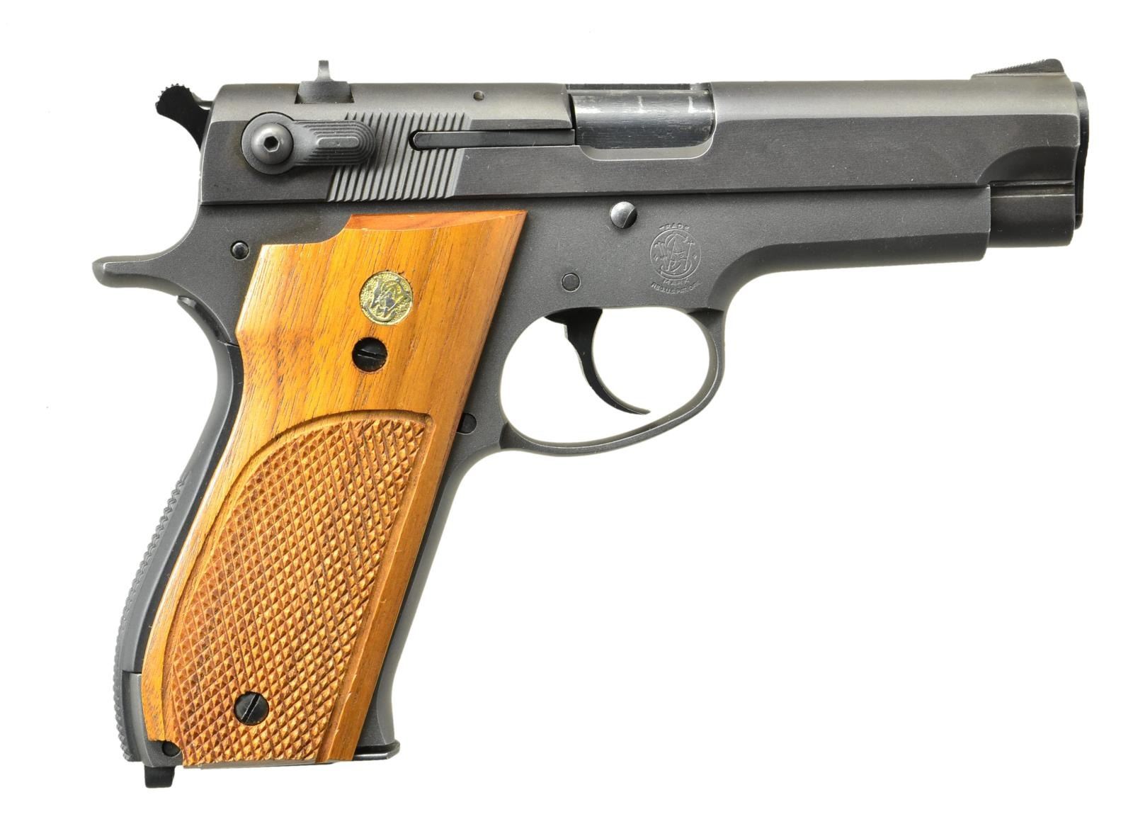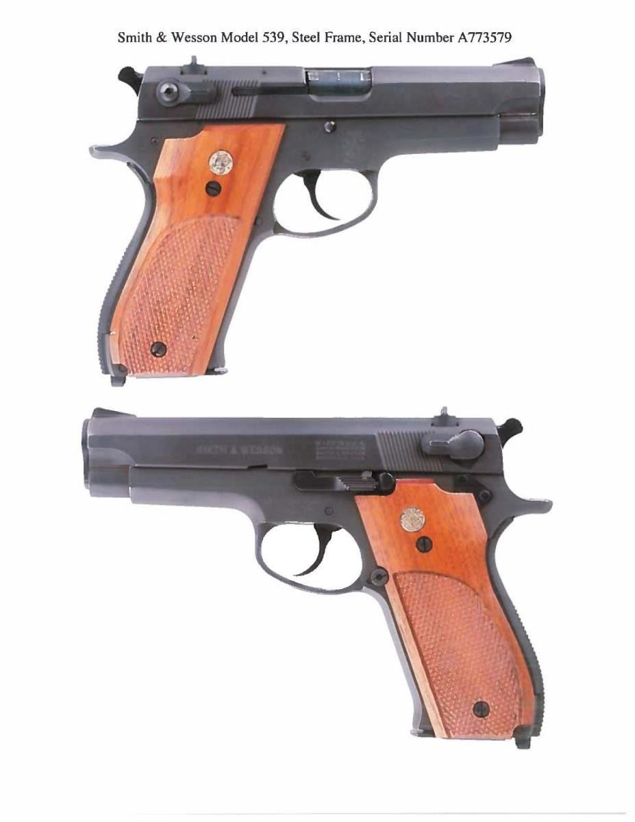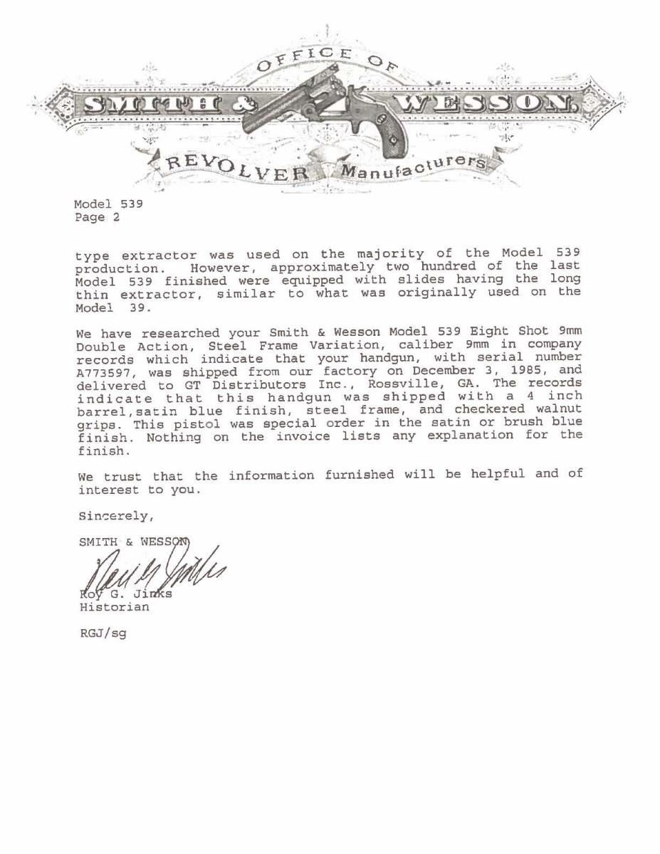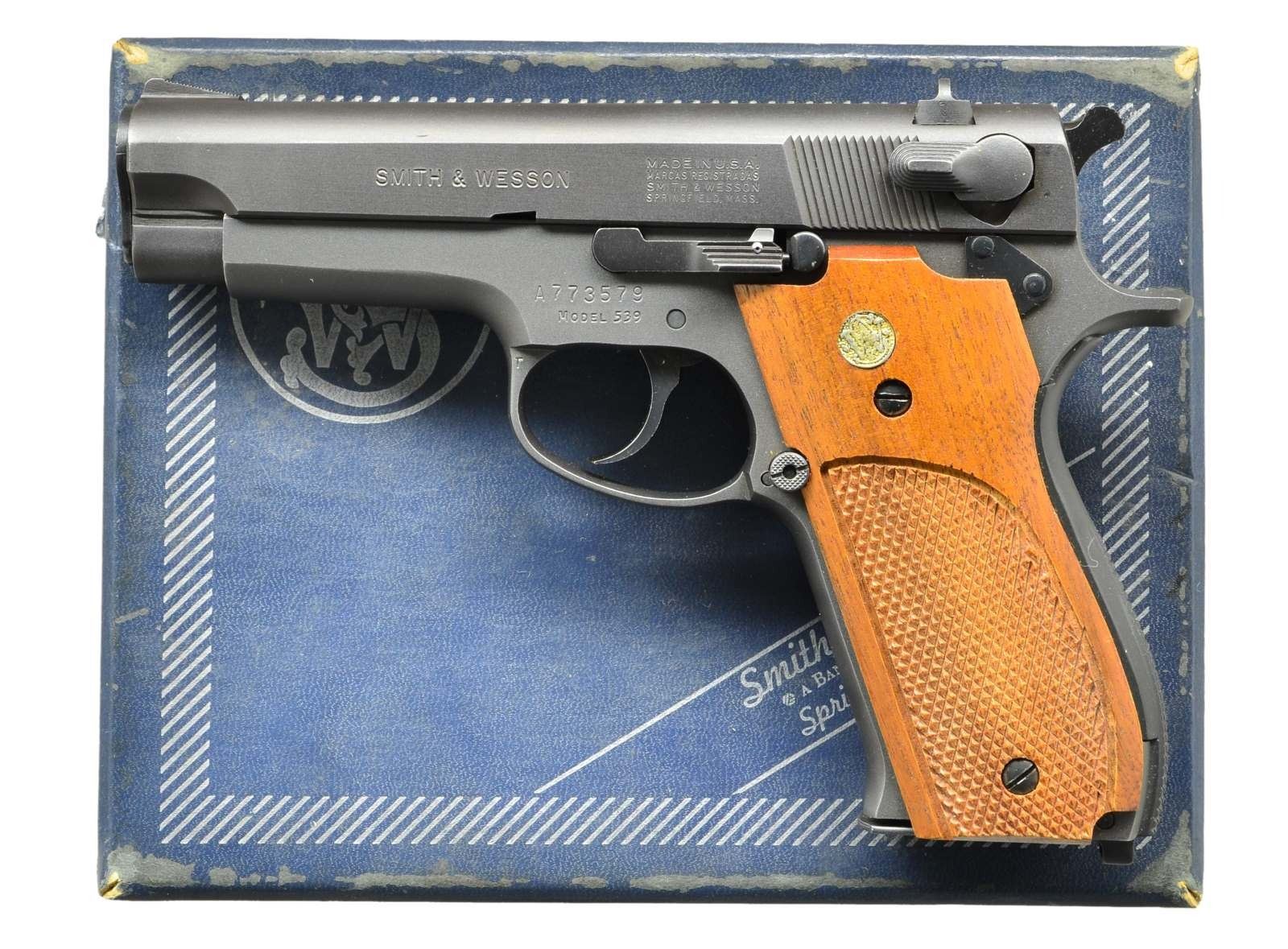 Cal. 9mm Luger. S# A773579. Bbl. 4". Mfg. 1982 and shipped Dec. 3, 1985 to G.T. Distributors of Rossville, GA. per June 2007 factory letter as special ordered pistol; 8159 units 1981-1984. Finishes were 6,184 blued w/ balance nickel; Model 539 canceled with introduction of stainless Model 639. Steel framed version of Model 39 having checkered S&W logo walnut grips, satin finish (special ordered option), checkered backstrap w/ lanyard loop, ambidextrous safety & uncommon fixed rear sight (serrated ramped front) introduced March 1983 as an option. MAGS: 2 factory 8 rd. w/ flat push button bases. UNATTACHED ACCESSORIES: good 2 piece Bangor Punta box w/ corner scuffs & beginning break where beavertail section of frame slid into box slightly cracking base & lid. 2/78 Model 39 manual & paperwork plus cleaning rod & waxed paper. Jinks signed factory letter supporting above info. PROVENANCE: Estate collection of Fred Inganamort. CONDITION: very good plus w/ very minimal high point wear (mostly near muzzle); also has function wear on bbl. at port and lower front right of slide. Near excellent bore & grips. PROVENANCE: Estate collection of Fred Inganamort. (22-1544/NW). MODERN. $600-900.