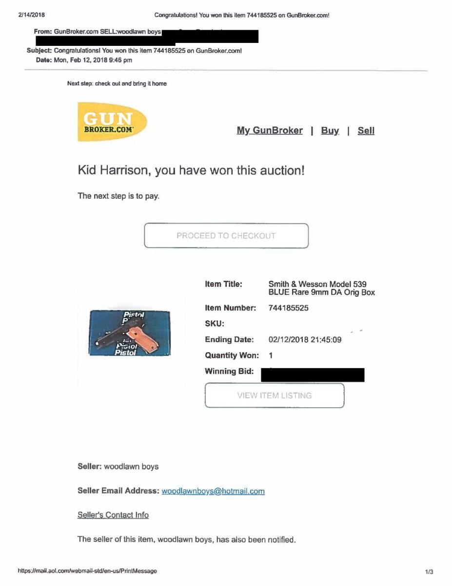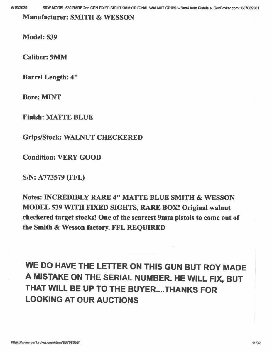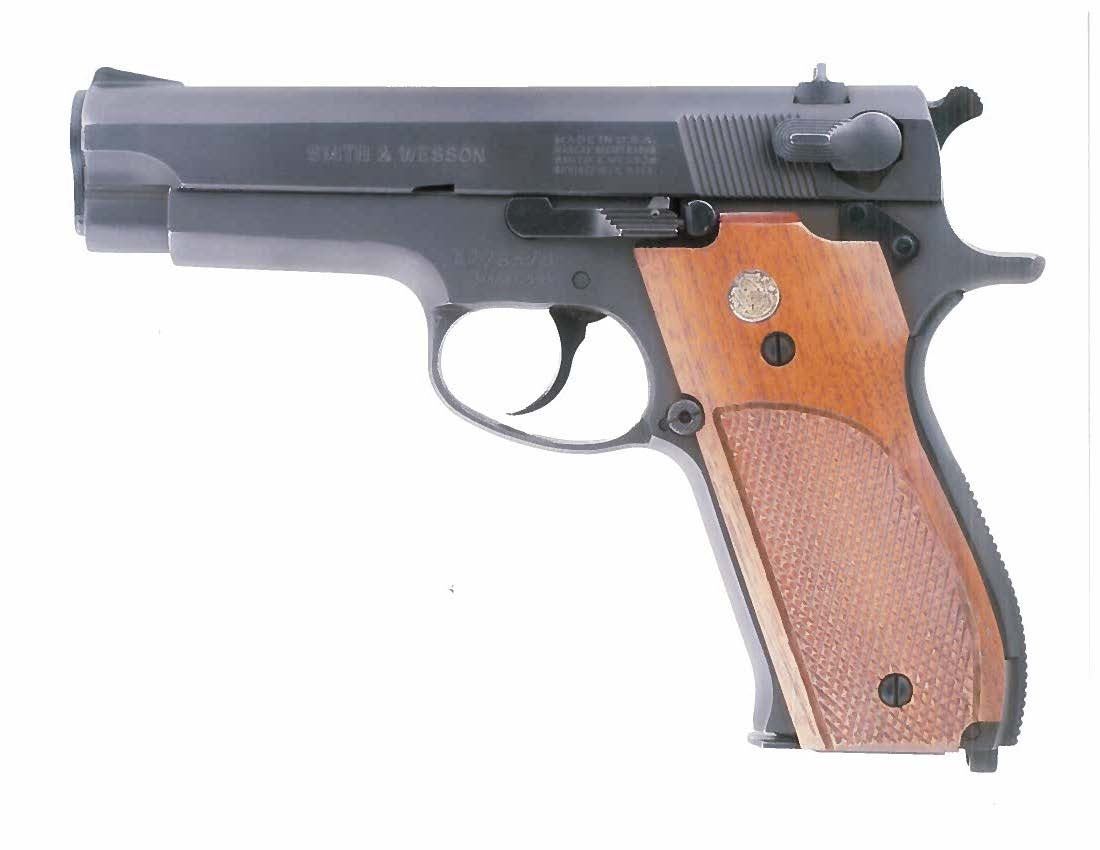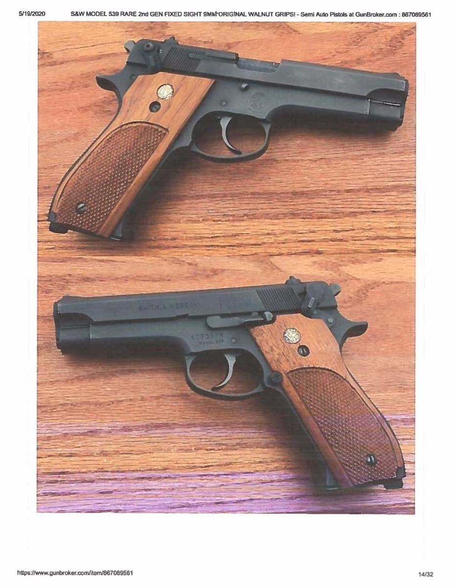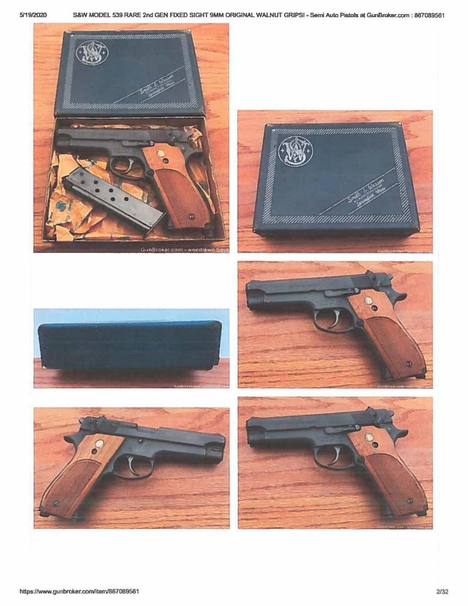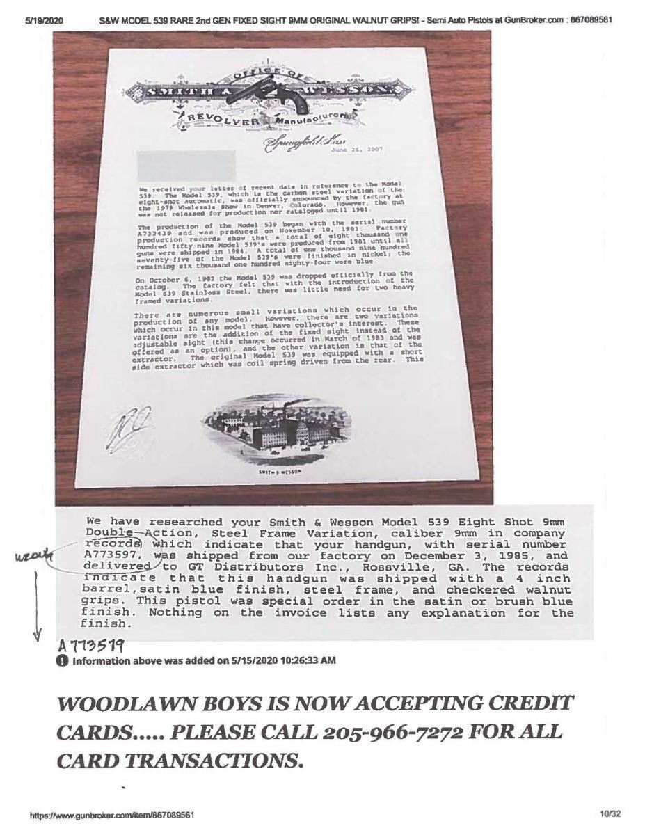 Cal. 9mm Luger. S# A773579. Bbl. 4". Mfg. 1982 and shipped Dec. 3, 1985 to G.T. Distributors of Rossville, GA. per June 2007 factory letter as special ordered pistol; 8159 units 1981-1984. Finishes were 6,184 blued w/ balance nickel; Model 539 canceled with introduction of stainless Model 639. Steel framed version of Model 39 having checkered S&W logo walnut grips, satin finish (special ordered option), checkered backstrap w/ lanyard loop, ambidextrous safety & uncommon fixed rear sight (serrated ramped front) introduced March 1983 as an option. MAGS: 2 factory 8 rd. w/ flat push button bases. UNATTACHED ACCESSORIES: good 2 piece Bangor Punta box w/ corner scuffs & beginning break where beavertail section of frame slid into box slightly cracking base & lid. 2/78 Model 39 manual & paperwork plus cleaning rod & waxed paper. Jinks signed factory letter supporting above info. PROVENANCE: Estate collection of Fred Inganamort. CONDITION: very good plus w/ very minimal high point wear (mostly near muzzle); also has function wear on bbl. at port and lower front right of slide. Near excellent bore & grips. PROVENANCE: Estate collection of Fred Inganamort. (22-1544/NW). MODERN. $600-900.