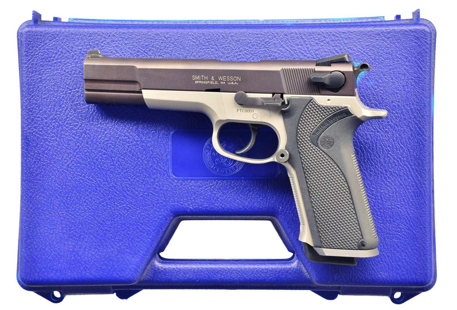 Cal. 40 S&W. S# FTC0001. Bbl. 5" match grade. Mfg. 1997 by Performance Center division of S&W for RSR Distributors as special Model 4006 having product code of 170091; shipped July 17, 1997. Only 150 units produced & numbered FTC00001-FTC00150; this is # 1. Tritium front sight & 2 dot Novak's windage adjustable rear. Matte stainless frame w/ checkered front strap; high cut under trigger guard. One piece checkered black plastic grip w/ integral mag. well funnel. Box cut frame & slide rails for full contact to end of dust cover. Matte blued carbon steel slide balanced for better muzzle control. Ambidextrous safety, extended & enlarged mag. release plus lightweight spur hammer. MAGS: 2 factory 10 rd. w/ extended black plastic bases & yellow followers. UNATTACHED ACCESSORIES: factory letter verifying above info plus matching numbered blue plastic factory case w/ paperwork. CONDITION: all aspects (including bore) near excellent appearing new & unfired. PROVENANCE: Estate collection of Fred Inganamort. (22-1551/NW). MODERN. $1,000-1,500.
