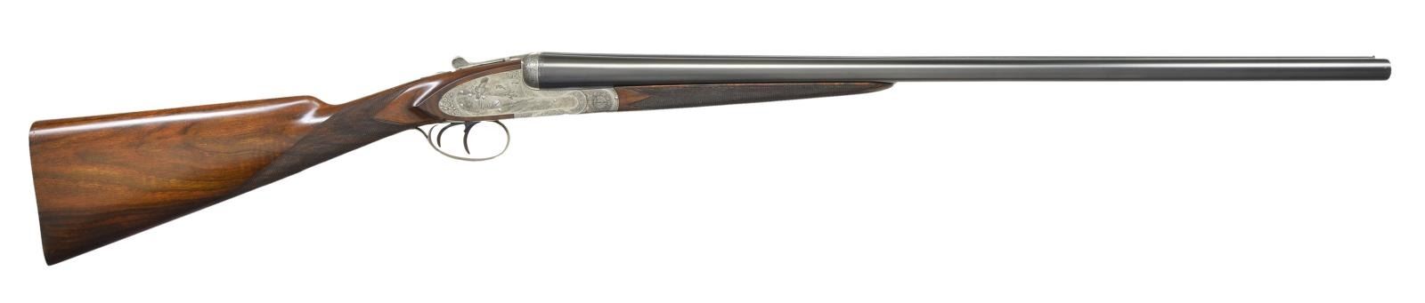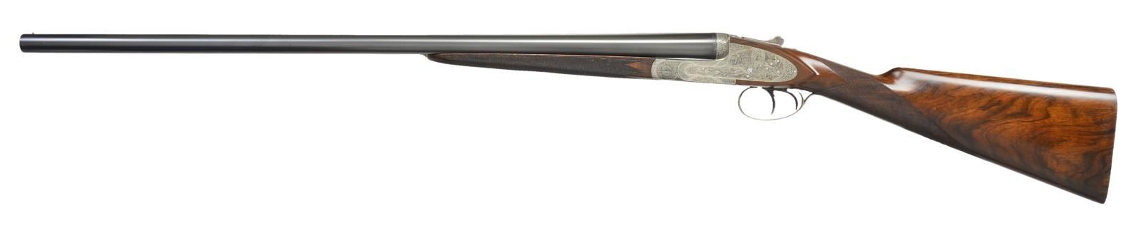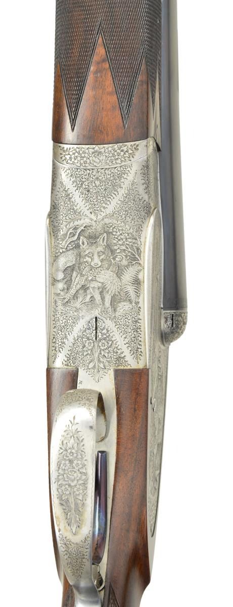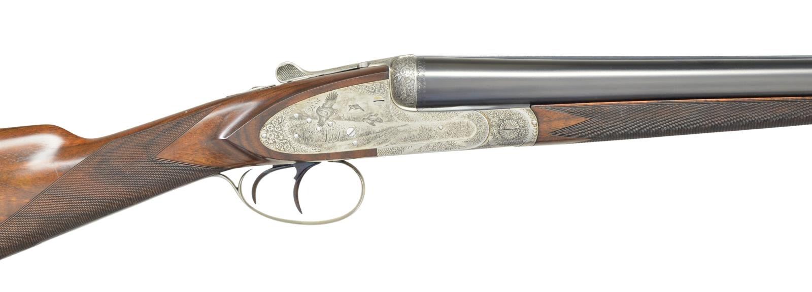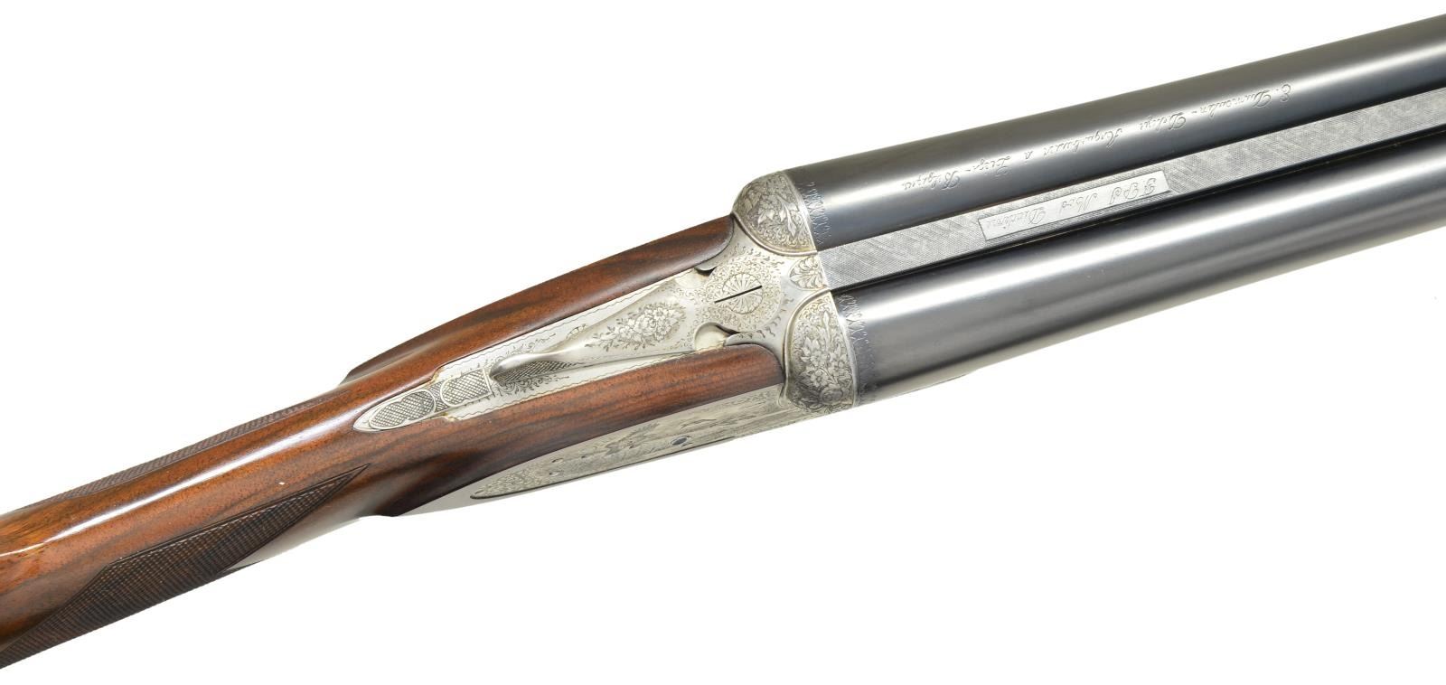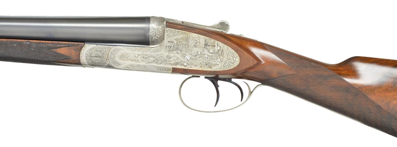 Cal. 12 Ga 2-3/4’’. S# 10042. Bbls. 28-1/2’’. Left bbl. has marking that appears to read “E. Dumolin-Deluge-Arguebruier-a-Liege-Belgique”. Top of rib has marking that appears to be “F.P.J.Mod DIADIME”. Case colored sidelock action w/ exquisite game scene engraving. Scene on right lock plate features flying prairie chickens. Left lock plate shows flushing pheasants. Floorplate shows a fox w/ a pheasant in its mouth. Balance of action & forearm iron are covered w/ fine scroll & floral bouquets. Features include double under lugs, bushed firing pins, cocking indicators & ejectors. Fire blued double triggers, front trigger is hinged. Splinter forearm w/ Anson release & straight hand stock of fancy European walnut w/ rich black & orange tones. Stock & forearm have generous coverage of fine hand engraving. LOP: 14-3/8’’ to a checkered butt. DAC: 1-1/2’’. DAH: 2-3/8’’. Stock has approx. 1/4’’ cast off. Bore diameter: RT .730, LT .729. Choke constriction: RT 019, LT .031. Minimum wall thickness: RT .023, LT .032. WEIGHT: 6 lbs, 15 ozs. CONDITION: 98% reblackened bbl. finish. Action has an attractive cleaned gray appearance. Wood has very good finish showing small marks w/ spots in finish around butt. Gun is tight & on face w/ top lever sitting properly right of center. Bright near excellent bores. (23-652/DS). CURIO. $2,500-3,500.