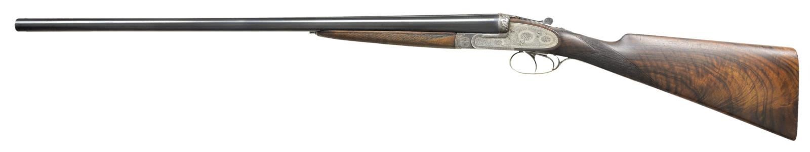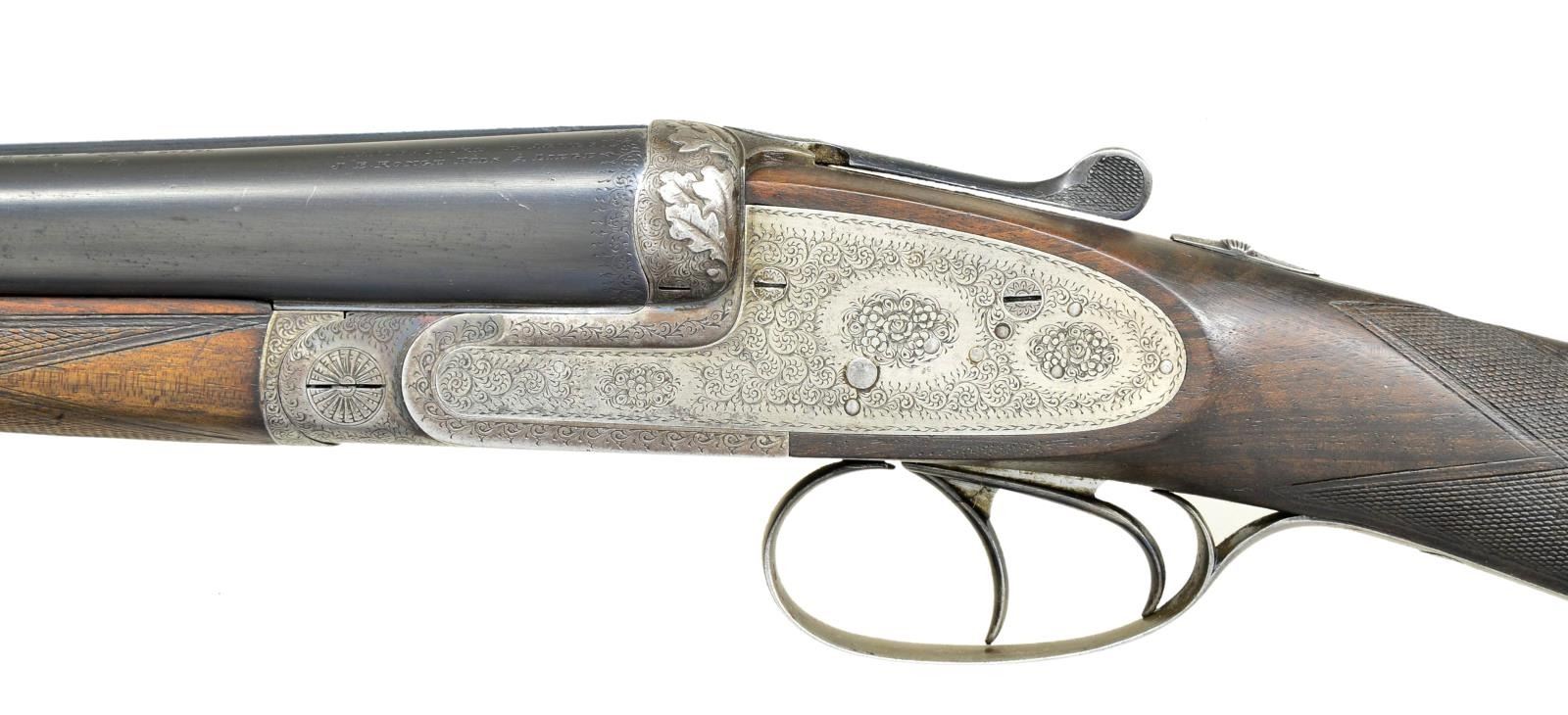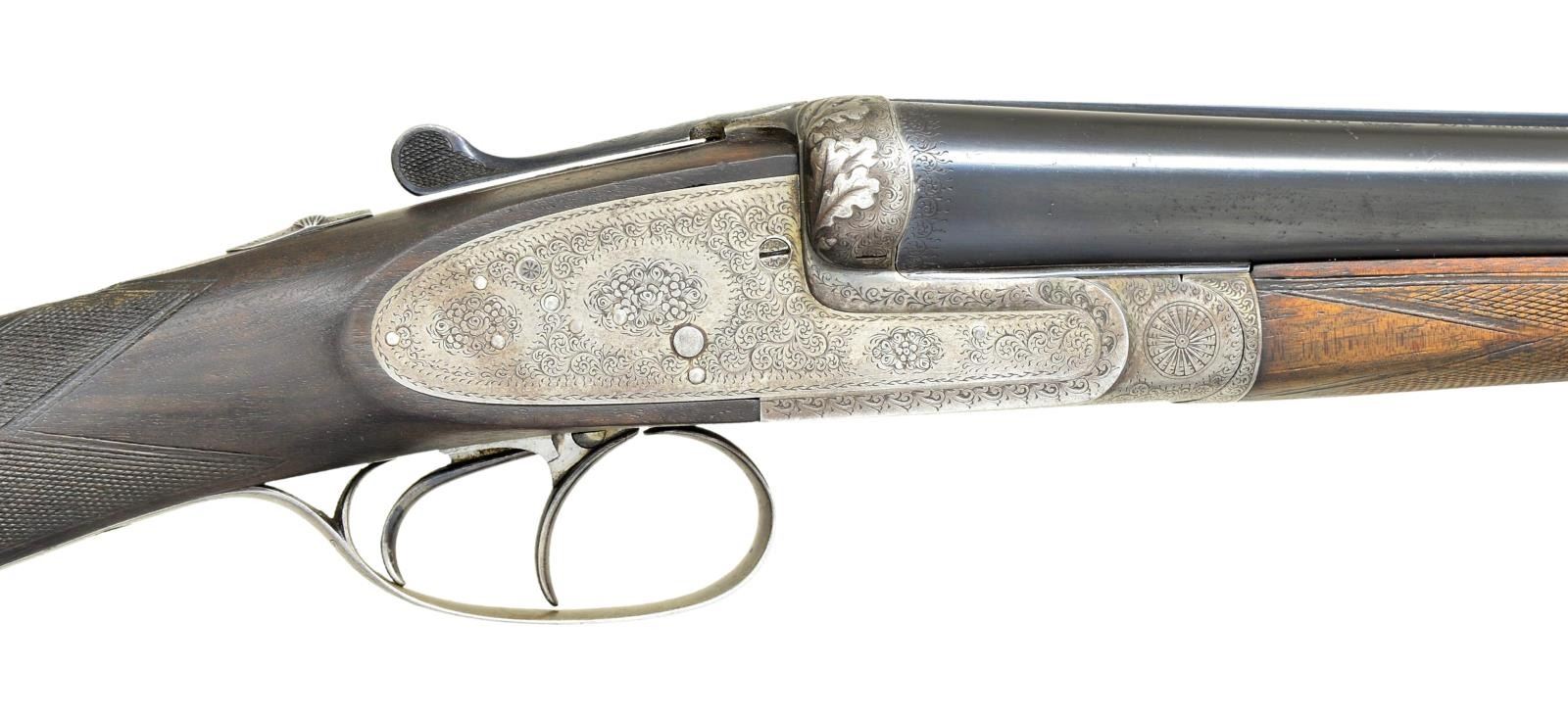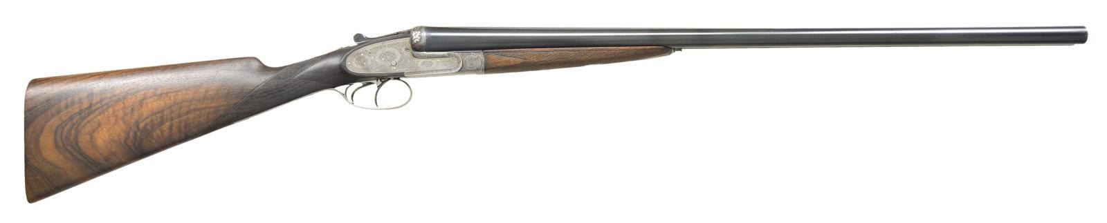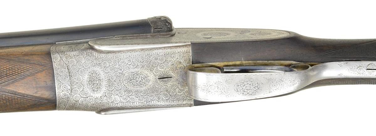 RONGUE OF LIEGE. Cal. 12 Ga., 2 3/4". S# 42135. 27 1/2" Dovetailed bbls. with matted game rib are marked with steel type on top, maker's name and address are on upper left side of left bbl. Bbl. flats are stamped with 1925 Belgian Nitro proofs for 2 3/4" chambers. Case hardened sidelock action is stocked to the fences and features non automatic safety, hidden third fastener, bushed strikers and double triggers (front articulated). Action and lockpaltes are engraved with near full coverage British style rose and scroll. Fences are relief carved with oak leaves in small scroll background. Nicely crotch figured and well marbled European walnut straight grip buttstock measures 15" over checkered wood butt. Point pattern checkering is on semi diamond hand. Matching splinter ejector forend with Anson release has inlet silver shield in center of checkering pattern. MEASUREMENTS: BBLS: Bore Diameter: R .727", L .724". Restriction: R .010" (IC), L .037" (FULL). Min. Wall Thickness: R .023", L .028". STOCK: DAH: 2 3/16". DAC: 1 1/4". LOP: 15". CAST: neutral. WEIGHT: 7 lb. 4 oz. CONDITION: fair to good as partially refinished. Bbls. retaining nearly all of an old reblack with some light scratches. Action retains perhaps as much as 20% original case hardening color. Lockplates are cleaned to silver gray. Stocks appear to have been stripped of finish and have numurous light marks overall. Checkering has not been recut. Bores are bright with frosting toward breech ends and evidence of a few minor pings, mostly in left bbl. Action is tight. Ejectors are in time. (22-4502/MGM). CURIO. $1,000-1,500.