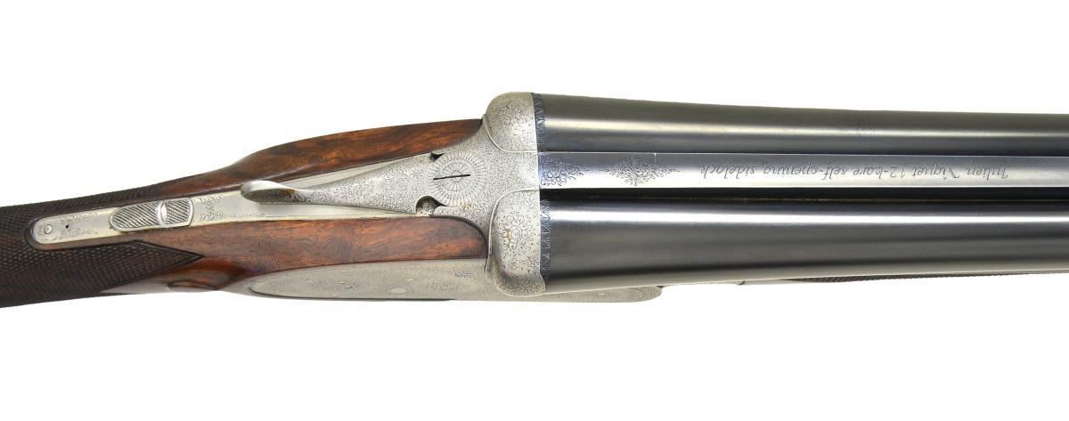 NIQUET WITH PURDEY TYPE ACTION. Cal. 12 ga. 2 1/2". S# 1284. The 27 5/8" dovetailed bbls. are engraved "Julien Niquet 12 Bore Self-Opening Sidelock" on slightly raised game rib. Bbl. flats are stamped with pre-1927 Belgian Nitro proofs for 2 1/2" chambers. Coin finished self opening sidelock action has safety button deactived, hidden third fastener, bushed strikers, side clips, and double triggers (front articulated). Action is engraved with 80% coverage well cut rose and scroll. Bottom of action is engraved "J. Niquet" " a Liege". Newer straight grip buttstock of well figured dark European walnut measures 14 1/4" over checkered wood butt. Stock features drop points and point pattern checkering. Matching splinter Defourney ejector forend as Anson release, central escutcheon is gold inlaid with a count's crown. MEASUREMENTS: BBLS: Bore Diameter: R .728", L .728". Restriction: R .020" (MOD), L .034" (FULL). Min. Wall Thickness: R .030", L .030". STOCK: DAH: 2 1/2". DAC: 1 1/2". LOP: 14 1/4". CAST: approx. 1/4" on. WEIGHT: 6 lb. 14 oz. CONDITION: good as refurbished. Bbls. retaining nearly all of a very high quality reblack. Engraving recut. Action with extensive cleaning to coin finish has engraving considerably thinned. Trigger guard engraving also recut. Newer stocks retain nearly all of their original oil finish. Checkering with little wear. Bores are shiny with evidence of polishing over some light pitting and are without any major repairs. Action is tight. Bbls. are on face. Ejectors are in time. (22-4477/MGM). CURIO. $2,000-3,000.