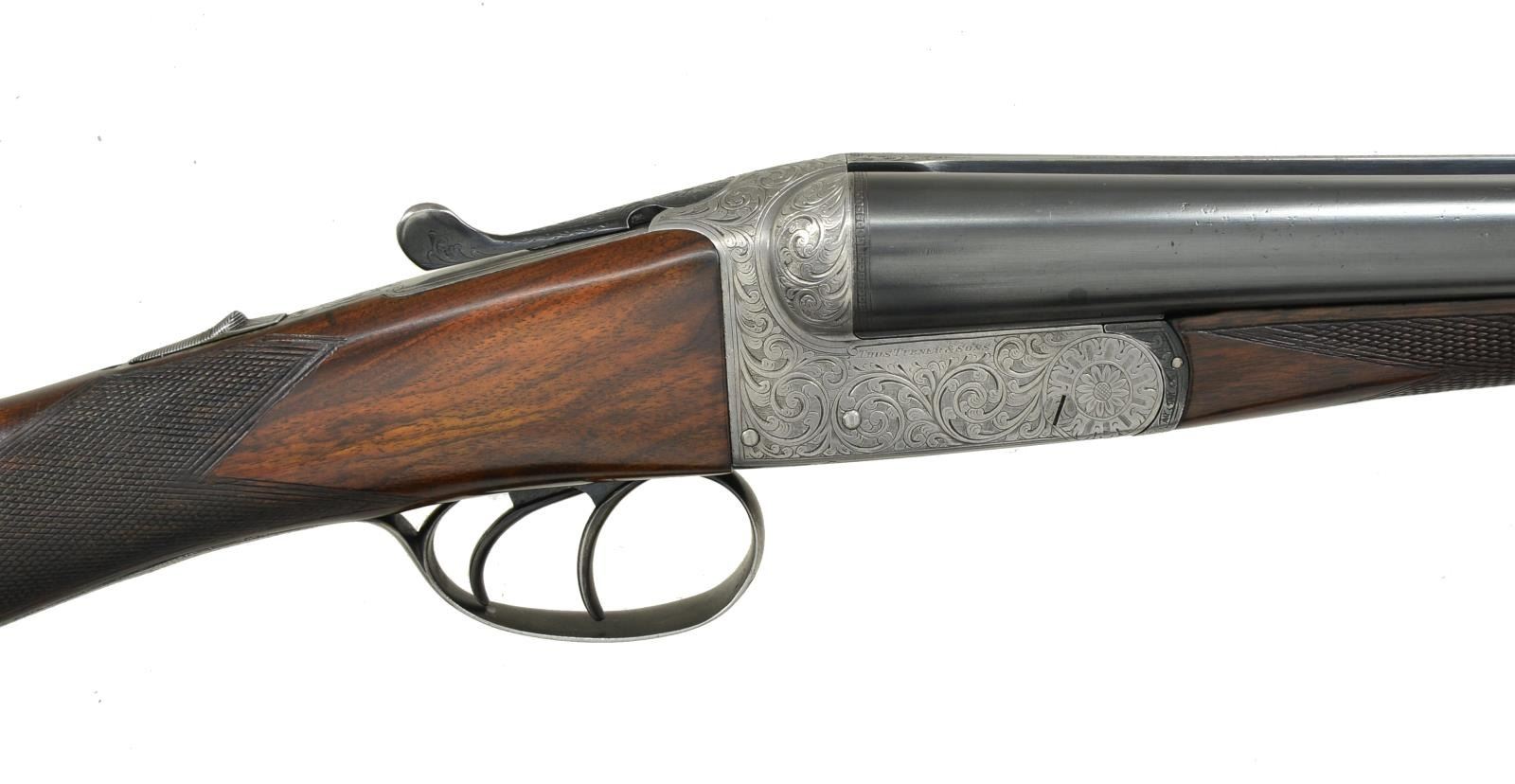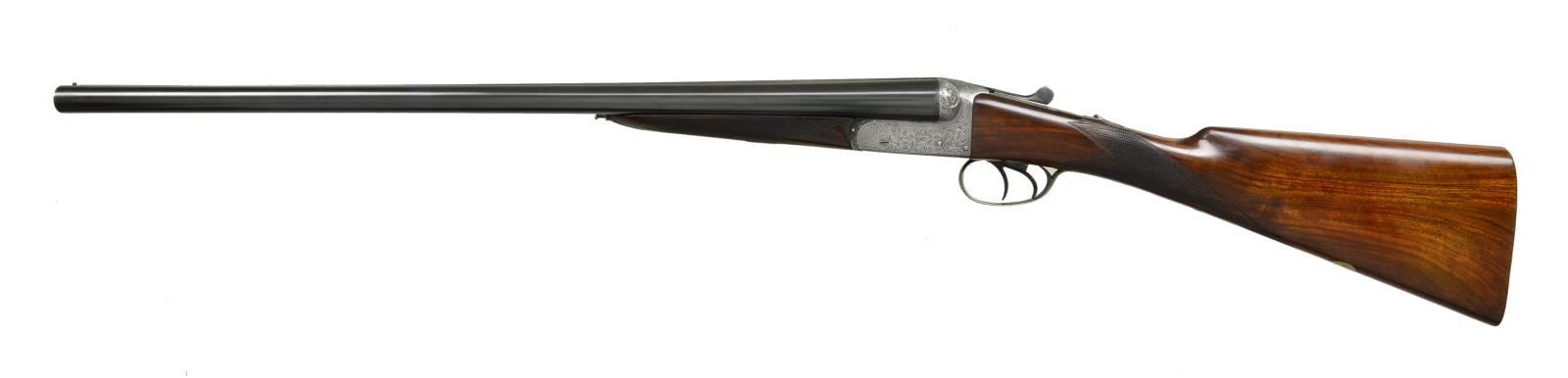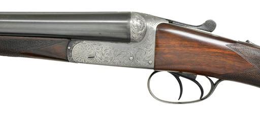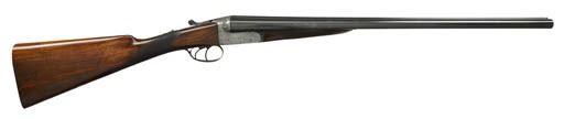 SHOTGUN. Cal. 12 Ga. 2 1/2". S# 3052 (Ca 1960. the highest recorded number is 2634 in 1940). An employee relates that 20-30 guns were built after the war, but their numbers were not recorded. The 25" dovetail bbls. are engraved "Thos. Turner & Sons Reading, Newbury & Basingstoke" on unmatted Churchill type rib. Bbl. flats are stamped w/ Birmingham nitro proofs for 2 1/2" chambers. Serial number is on splinter. Coin finished boxlock action features automatic safety ("SAFE" engraved) & dbl. triggers. Top lever, floorplate & trigger guard are blued. Action & other parts are engaved w/ near full coverage, fairly deep lg. shaded scroll which is rather attractive. Maker's name is on both sides. Engraving on fences approaches semi-relief. Serial number is on trigger guard tang. Nicely streaked European walnut straight grip buttstock measures 15" over checkered wood butt. Point pattern checkering is at grip & a lg. silver oval on toeline is engraved w/ monogram "GA". Matching splinter ejector forend has Anson release. MEASUREMENTS: BBLS: Bore Diameter: R .733", L .732". Restriction: R .004" (IC), L .034" (FULL). Min. Wall Thickness: R .020", L .017". STOCK: DAH: 2 1/8". DAC: 1 1/2". LOP: 15". CAST: approx. 5/8" off. WEIGHT: 6 lb. 4 oz. CONDITION: fine as refinished. Bbls. retaining over 90% of an old reblack w/ some subsequent silvering on rib & around muzzles. Action cleaned to a bright coin finish, engraving remains sharp. Secondary parts show subsequent silvering to their reblue. Engraving somewhat softened. Stocks retain nearly all of a glossy oil finish w/ some marks & scratches. Checkering partially recut. Bores are shiny, but show some fairly deep pits, mostly in right bbl. 8-12" behind muzzle. Action is tight, ejectors are in time. (22-3842/MGM). CURIO. $1,500-2,500.