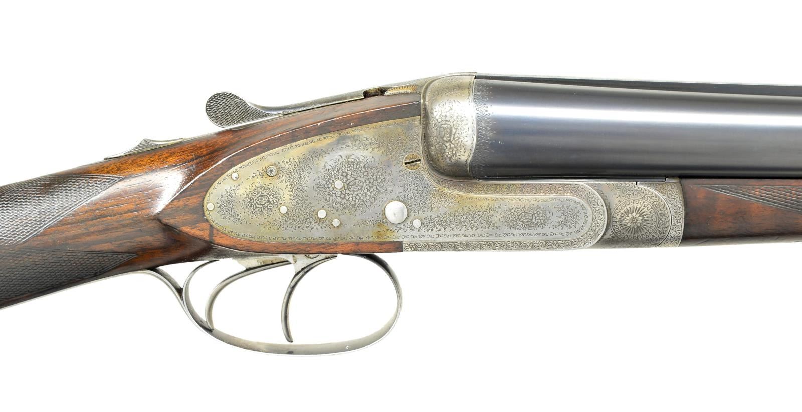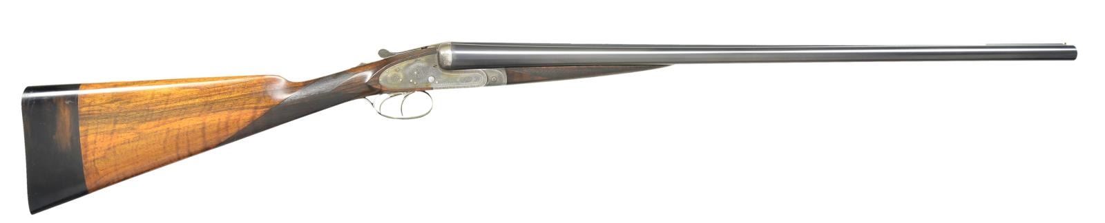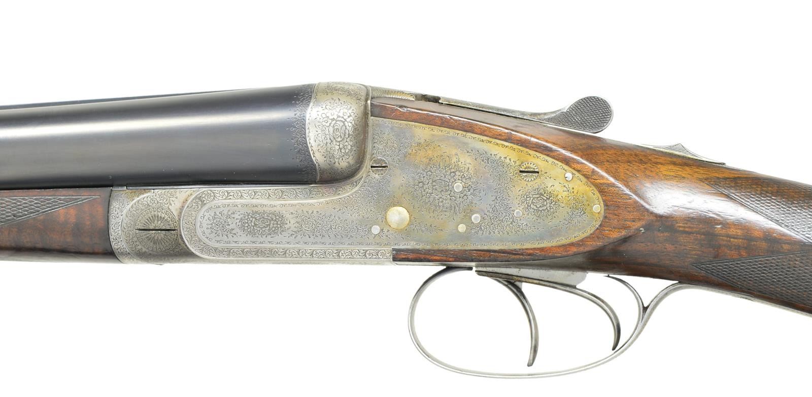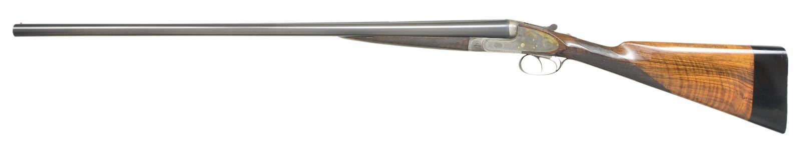 BORE SIDELOCK GAME GUN. Cal. 12 Ga., 2 3/4". S# 221. Made w/ 29” fluid steel bbls. of chopper lump construction w/ high flat plain rib & brass front bead. Breech end lightly scroll engraved w/ gold inlaid “2” on top rib. Bbl. flats w/ proper French proof marks & makers name ”A. Chapu / Paris”. Splinter forend checkered in point pattern w/ diamond at center has rose & scroll engraved iron & made w/ Anson type push button release. Interior of iron finely blued w/ engraved screw. Purdey sidelock action w/ side clips is very finely rose & scroll engraved & looks just like an early Purdey. Gun made w/ dbl. triggers, (front trigger articulated), auto ejectors, non auto safety. Top of action w/ beaded bbl. bolsters & blued top lever which are all nicely rose & scroll engraved. Top lever w/ gold ”2” & gold inlaid “S” in front of safety button & top tang are nicely scroll engraved. Diamond shaped straight hand English butt stock is checkered in point pattern through the wrist w/ rose & scroll engraved trigger guard. Butt w/ 2 1/4” black in color wood extension which is checkered at butt. Measurements: Right: .726", choke .047(extra full). Left: .729", choke: .021"(light mod). Minimum wall thickness: Right: .021", left: .016". DAC: 1 1/4”. DAH: 1 1/2”. Weight: 6 lbs., 14 oz. CONDITION: excellent as partially restored. Bbls. retain almost all of a competent professional rust blue finish. Forend is very good, checkering thinned but mostly all present w/ a sm. chip at muzzle end of left side otherwise sound. Case hardened action retains 40% of its original color. Buttstock is sound & retains most of a professional finish w/ checkering thinned at grip area. Bores are mostly bright & shiny. Mechanics are crisp though the gun does have a very slight hint of looseness at the hinge. Very interesting copy of Londons most famous maker which at first glance absolutely appears to be a Purdey. (22-1114/JSL). CURIO. $1,500-2,250.