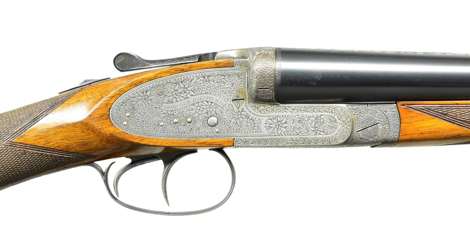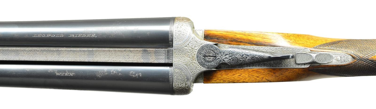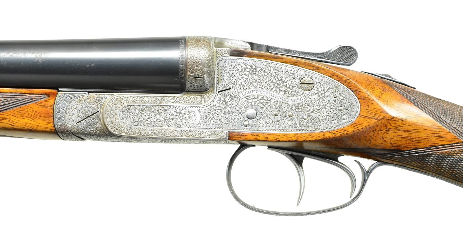 LEOPOLD BIEDER OF VIENNA. Cal. 12 Ga., 3". S# 1115. The 27 5/8" chopper lump barrels with matted game rib are engraved with maker's name and address on tops. Barrel flats are stamped with 1930 Belgian nitro proofs for 2 3/4" chambers. Bottoms of barrels are stamped "Demi Bloc" and with steel type. Coin finished square back side lock action features non automatic safety, hidden third fastener, bushed strikers and double triggers. Action and lockplates are very finely engraved with full coverage Viennese style scroll with edelweiss blooms and leaves as accent. A scrolled ribbon on each lockplate is engraved "LEOPOLD BIEDER WIEN" (name not found in Heer). This treatment extends to blued top lever and trigger guard. Straight grip buttstock with some dark marbling measures 14 1/8" over brown leather covered pad. Point pattern checkering is at grip. Matching splinter forend has Anson release. MEASUREMENTS: BBLS: Bore Diameter: L .727". R .725". Restriction: L .015" (mod). R .004" (IC). Wall thickness: L .025". R .025". STOCK: DAH: 2 5/16". DAC: 1 3/8". CAST: about 1/2" off. LOP: 14 1/8". WEIGHT: 6 lb. 13 oz. CONDITION: fine as partially refinished. Barrels retaining over 80% of rust reblue with some evidence of having been tank blued at an earlier time (solder receeding at muzzles), with a good amount of cleaned subsiquent rust mostly on tops. Action retains most of what appears to be its original bright polish with areas cleaned and darkened on fences and bottom. Stocks retain nearly all of an oil refinish, checkering shows wear. Bores are bright and shiny. Action is tight, ejectors are in time. A fine quality gun with truly beautiful engraving. (22-5611/MGM). CURIO. $1,500-2,500.