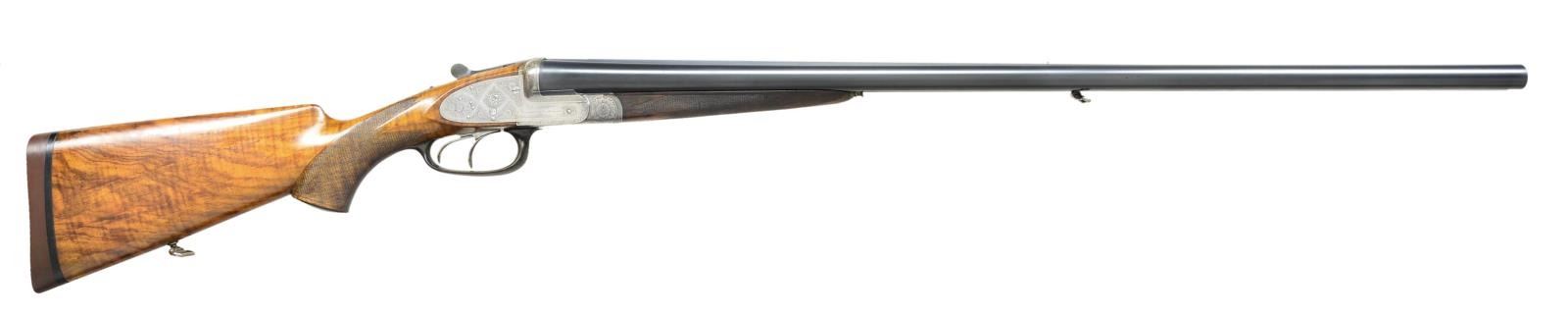 WITH PURDEY/BEESLEY SELF OPENING ACTION. Cal. 12 ga. 2 3/4". S# 10720. The 30" dovetailed bbls. are fitted with slightly raised flat matted rib engraved "2" at breech end; "2" also appears on top lever and forend iron, indicating this gun was the second gun of a pair. Retailer's name and address are engraved on tops of bbls. Bbl. flats are stamped with Imperial German Nitro proofs for 12 ga. without date. Coin finished sidelock action features non automatic safety ("SICHER" inlaid in gold), hidden third fastener, bushed strikers, arrowhead tumbler end cocking indicators and double triggers (front articulated). Interior inspections reveal locks are indeed of Purdey type and ejector system is also similar to the famous Wem ejector used on Purdey guns; drop is replacable. Action and lockplates are engraved with about 80% coverage nicely cut scroll surrounding small rose bouquets, all within small scroll, geometric and floral borders. "O. Geyger & Co. Berlin" is on each lockplate. Geyger number "2786" is on top of action in front of top lever. Trigger guard is horn. Horn capped pistol grip buttstock of well fiddle figured and nicely marbled European walnut measures 14 1/4" over solid brown basketweave "Pachmayr" pad. Stock features shadowline right hand cheekpiece, point pattern grip checkering and a sling loop matching the one screwed to bottom rib. Matching splinter ejector forend has Anson release. MEASUREMENTS: BBLS: Bore Diameter: R .720", L .720". Restriction: R .010" (IC), L .023" (MOD). Min. Wall Thickness: R .030", L .030". STOCK: DAH: 2 9/16. DAC: 1 1/2". LOP: 14 1/4". CAST: very slightly off. WEIGHT: 6 lb. 14 oz. CONDITION: very good as refinished, bbls. retaining about 90% reblue with some sharp edgewear and a few light marks. Action is cleaned to coin finish. Engraving remains good with traces of remaining case hardening color on floorplate and under toplever. Stocks retain nearly all of an oil refinish with a few scattered marks. Checkering shows considerable wear and has not been recut. Horn of trigger guard remains good without damage. Bores are bright and shiny with some leading in right bbl. Action is tight, bbls. are off face. Drop is good. Mechanically good. An interesting German gun, possibly actually built by Purdey. (22-4509/MGM). CURIO. $2,000-3,000.