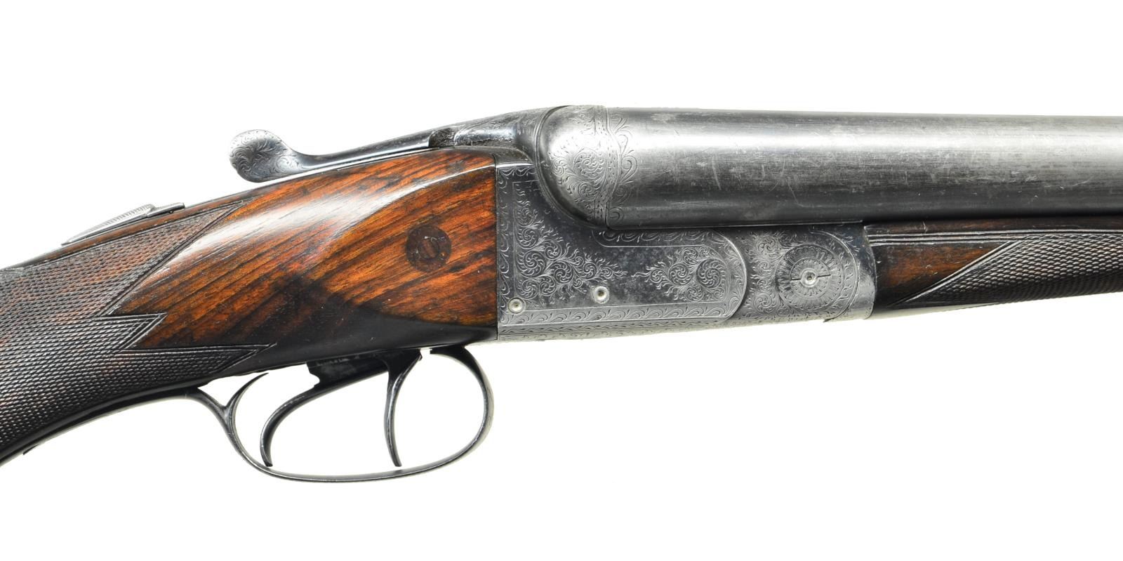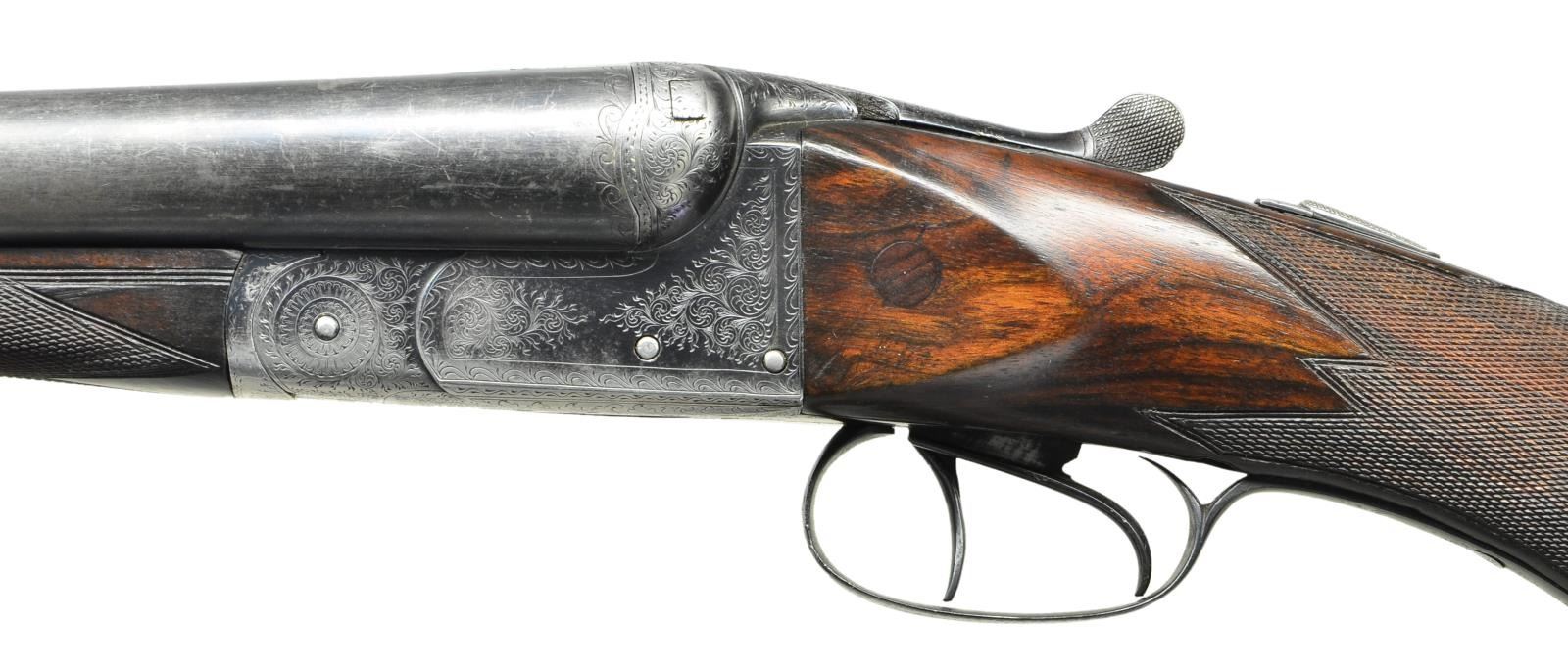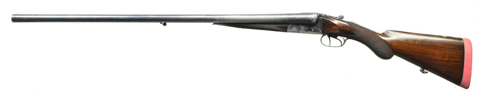 BARCELONA. Cal: 16 Ga., 2 1/2" (.644" groove diameter). Shotgun.: 12 Ga., 2 1/2". S# 9095. Bbls. 26 5/8" chopperlump, double rifle, are fitted w/ 2 folding v-notch rear sights in slightly raised matted game rib. E. Schilling & P. Paguaga information is on top of each bbl. Bbl. flats are stamped for 16 bore & what appear to be pre-1927 Barcelona proofs. E. Schilling's running boar logos are also stamped. Number "4867" is on bottom of left bbl. Double shotgun bbls. w/ same markings on tops are fitted w/ deeply sunken ribs which are essentially only a web between bbls. Bbl. flats are stamped w/ 12 ga. proofs which are of the same type as rifle bbls. Flats are also stamped w/ Rigby double R logos & "MONOBLOC", even though bbls. do not appear to have been sleeved. The pair of bbls. appear to made of a single solid piece of steel (monobloc does mean "one piece"). Front sight mounting block & sling eye are soldered in. Blued boxlock action features automatic safety, square crossbolt third fastener, side clips, & dbl. triggers. Action is engraved w/ 80% coverage varying size scroll within scroll borders. Top lever & trigger guard are also scroll engraved. Round knob pistol grip buttstock of lightly streaked European walnut measures 14 3/8" over Silver type pad. Point pattern checkering is at grip & a sling loop is on toeline. Silver oval at rear of comb is engraved "Polin". Each bbl. set has its own splinter forend w/ numbers matching that found on bottoms of bbls. Forend releases are of roller friction type. MEASUREMENTS: RIFLE BBLS: Groove Diameter: .644", 2 1/2" chambers. SHOTGUN BBLS.: Bore Diameter: R .732", L .734". Restriction: R .018" (MOD), L .030" (FULL). Min. Wall Thickness: R .022", L .015". STOCK: DAH: 2 3/4". DAC: 1 3/4". LOP: 14 3/8". CAST: neutral. WEIGHT: 6 lb. 7 oz. WEIGHT W/ RIFLE BBLS: 8 lb. 2 oz. UNATTACHED ACCESSORIES: extra bbl., S# 4867. CONDITION: good. Shotgun bbls. retain most of what appears to be their original blue. Rifle bbls. retain most of a good quality rust blue w/ engraving softened. Action retains about 30% of what appears to be original blue. Stocks refinished. Checkering recut. New pad. Cheeks pinned. Bores are shiny w/ some scattered light pitting & very deep pitting at throats. Rifle bores are good, fairly shiny w/ strong rifling throughout, but lightly pitted throughout. Action is tight w/ both bbl. sets. Rifle bbls. do not fit well. Top lever will not come fully to center & bbls. are slightly undersized at breech. (22-4465/MGM). CURIO. $1,000-1,500.