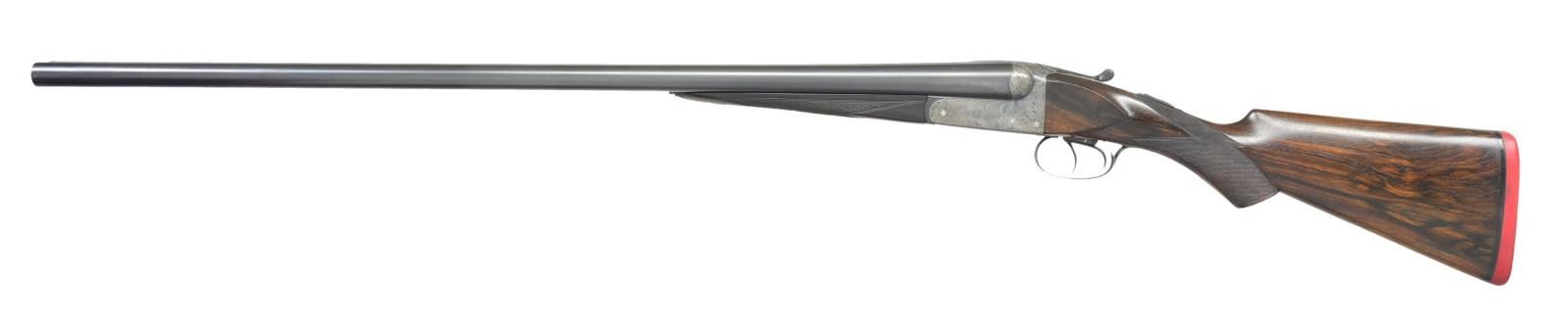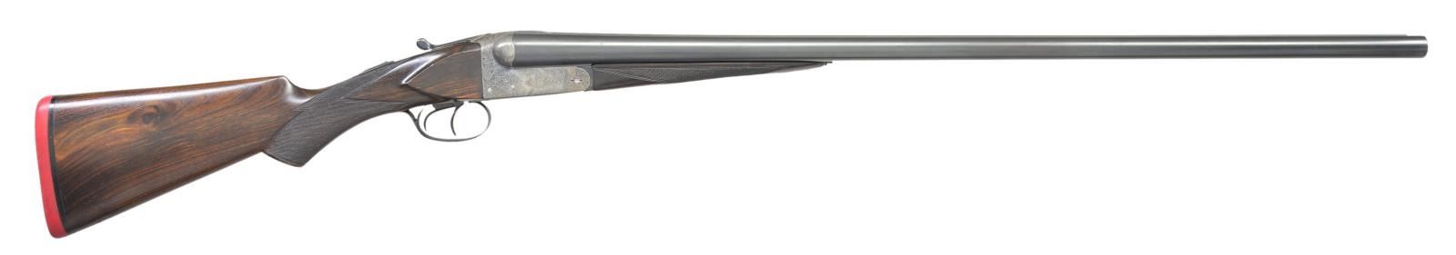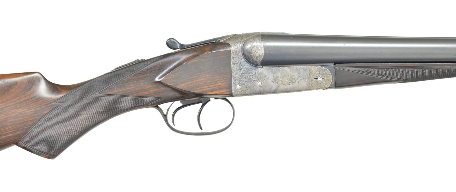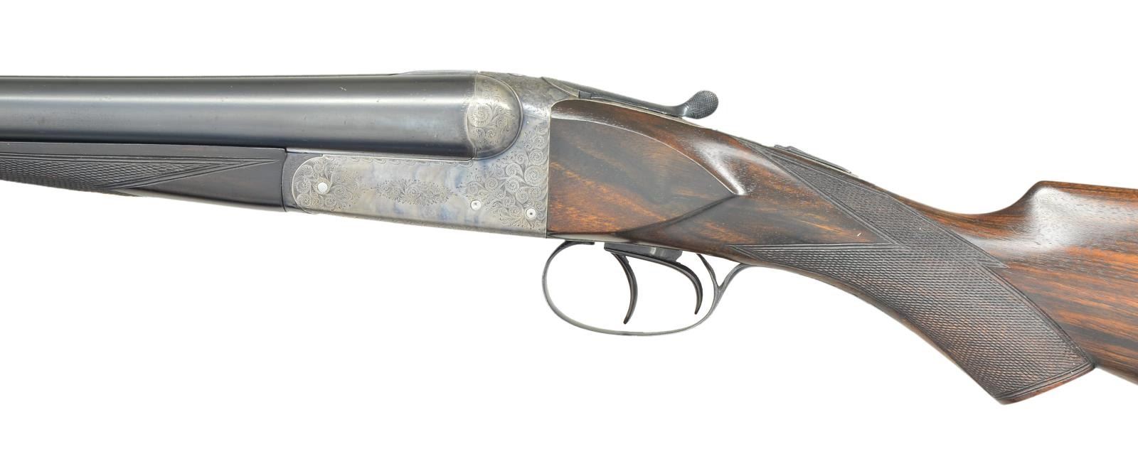 Cal. 12 Ga 2-3/4’’. S# 12031. Bbl. 30’’ w/ sunken rib. Case colored boxlock action w/ double under lug & doll’s head locking having side clips. Action has generous coverage of arabesque scroll engraving. Splinter forearm w/ Anson release & flat knob pistol grip stock of fancy European walnut w/ point pattern hand checkering. Forearm has a brass diamond inlay w/ initials “SIM”. LOP: altered to 13-3/4’’ over a solid rib pad. DAC: 1-1/2’’. DAH: 2-1/4’’. Bore diameter: RT .732, LT .732. Choke constriction: RT .039, LT .040. Minimum wall thickness: RT .027, LT .028. WEIGHT: 7 lbs. CONDITION: action retains 90% lightly faded case colors. Bbls. have over 97% reblacked finish showing handling marks w/ weakened markings. Refinished wood has freshened checkering. Action is tight & on face. Bores show scattered pitting. (23-654/DS). CURIO. $1,000-1,500.