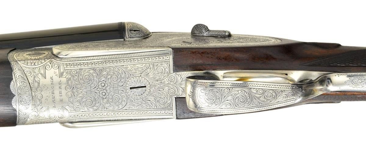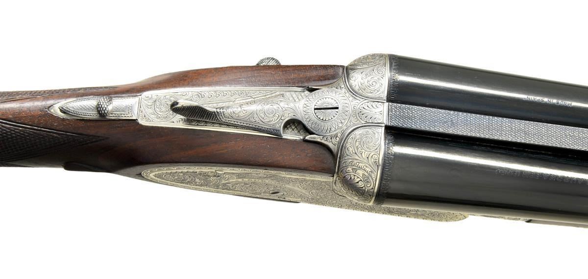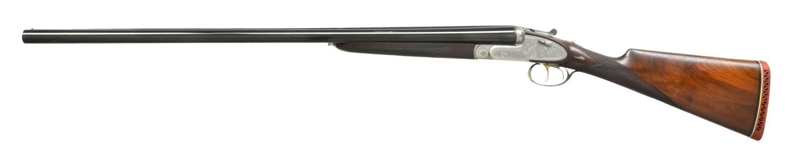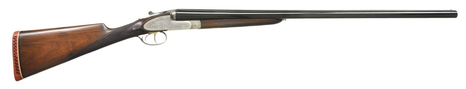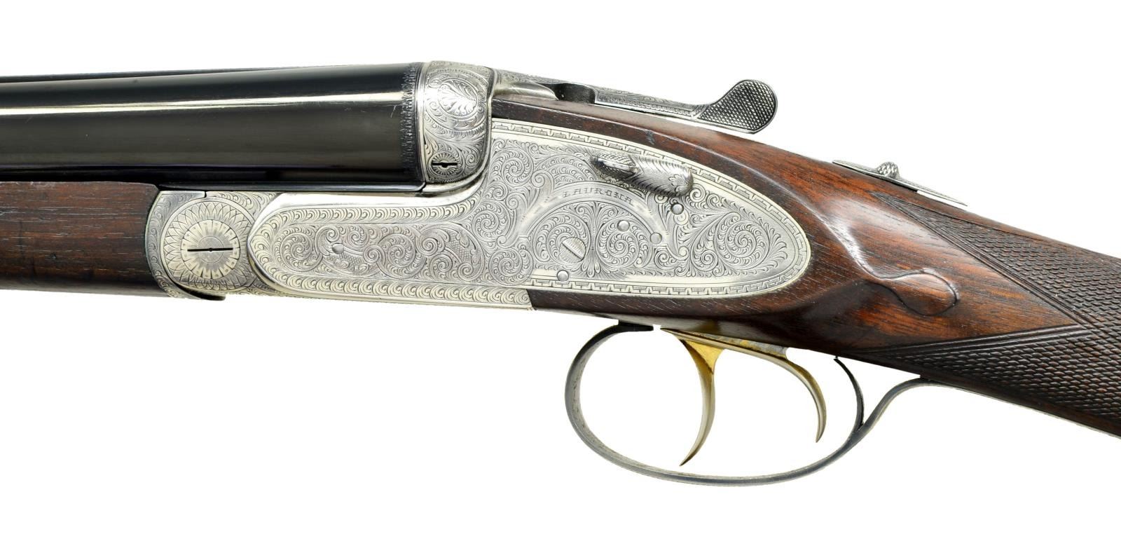 Cal. 12 ga. 2 3/4". S# FM147096. Similar to the recent Model 502, but of higher quality, this gun has 27 3/4" chopperlump bbls. fitted with slightly raised flat matted rib. "Laurona" name and address and "Made in Spain" are marked on top. Bbl. flats are stamped with 1963 Spanish Nitro proofs for 2 3/4" chambers. Coin finished sidelock action features nonautomatic safety, hidden third fastener, bushed strikers, H&H hand detachable locks, raised rib tumbler end cocking indicators and gold plated triggers (front articulated). Action and lockplates are engraved with near full coverage nicely hand cut large shaded scroll within geometric borders. "Laurona" is on arched device on each lockplate and "LAURONA" "EIBAR" is on bottom of action. Trigger guard with scroll on bow has serial number on tang. Straight grip buttstock of relatively plain European walnut measures 14 3/4" over red "Whiteline" pad. Stock features usual drop points and point pattern checkering. Matching splinter ejector forend has Anson release and a gold losenge engraved "SB" is in central uncheckered diamond. MEASUREMENTS: BBLS: Bore Diameter: R .726", L .726". Restriction: R .016" (MOD), L .026" (MOD). Min. Wall Thickness: R .023", L .027". STOCK: DAH: 2 5/16". DAC: 1 1/2". LOP: 14 3/4". CAST: neutral. WEIGHT: 6 lb. 14 oz. UNATTACHED ACCESSORIES: gun is housed in good quality relatively new oak and leather case with brass corners lined in olive green cloth. Case contains a key. CONDITION: fine, bbls. retaining over 95% original blue. Action retains nearly all of its bright coin finish with some light cleaning. Stocks retain most of what appears to be their original oil finish with some added oil on butt with installation of newer pad. Triggers retain traces of their gold plate. Bores are bright and shiny without any noted problems. Action is tight. Mechanically good. Case is very fine, close to new. (22-4533/MGM). MODERN. $2,000-3,000.