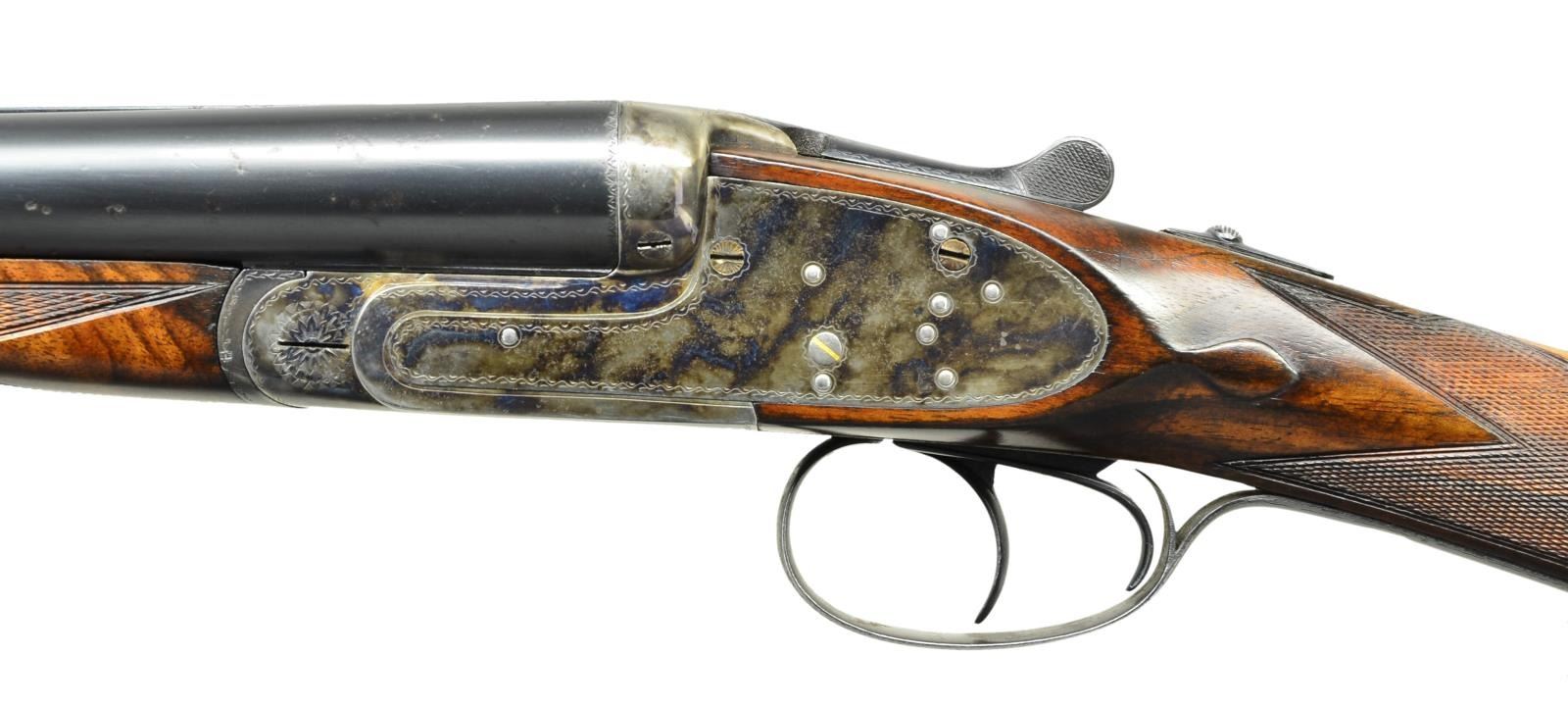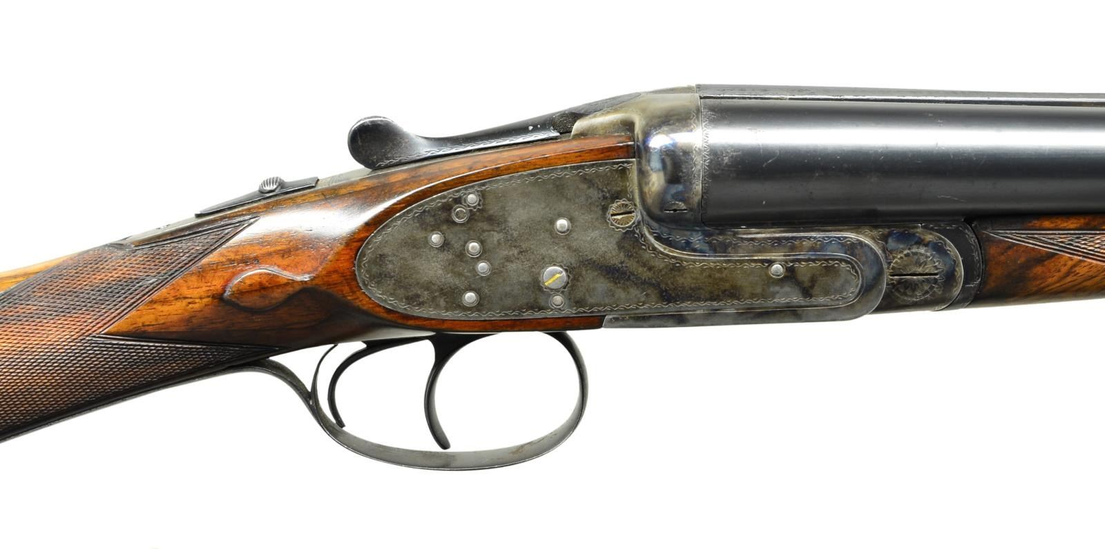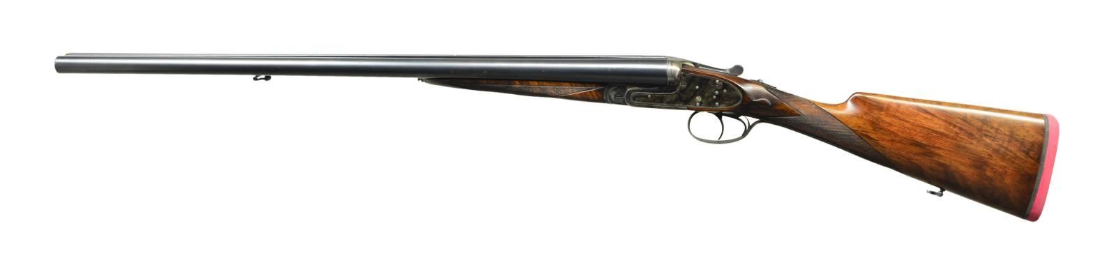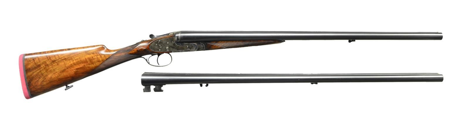 SHOTGUN. Cal. 12 Ga 2-3/4’’. S# 88065. Case colored sidelock action w/ borderline engraving. Features include gold bar cocking indicators, extractors & double triggers, front trigger is hinged. Splinter forearm w/ Anson release & straight hand walnut stock having point pattern checkering & tear drop points. Stock & both bbls. have sling swivels. LOP: 14-1/4’’ over a solid red pad. DAC: 1-1/4’’. DAH: 2-1/8’’. Stock has approx. 1/4’’ cast off. Both bbls. are chopper lump construction w/ hand matted concave solid ribs. (Bbl. No. 1) Length: 26’’. Date code indicates 1947 mfg. Bore diameter: RT .727, LT .727. Choke constriction: RT cyl. bore, LT .031. Minimum wall thickness: RT .034, LT .033. (Bbl. No. 2) Length: 30’’. Bbl. date code indicates 1946 mfg. Bore diameter: RT .726, LT .724. Choke constriction: RT .005, LT .038. Minimum wall thickness: RT .031, LT .035. WEIGHT w/ 26’’ bbl: 7 lbs. 1 ozs. CONDITION: action shows 75% lightly faded case colors. Both bbls. have reblacked finish showing scattered small spots of remaining pitting & some surface corrosion. Bbl. no. 1 shows some light pitting. Bbl. no. 2 shows some plastic residue forward of chambers. Wood has very good refinish w/ freshened checkering. Action is tight & on face. (23-686/DS). CURIO. $1,500-2,000.