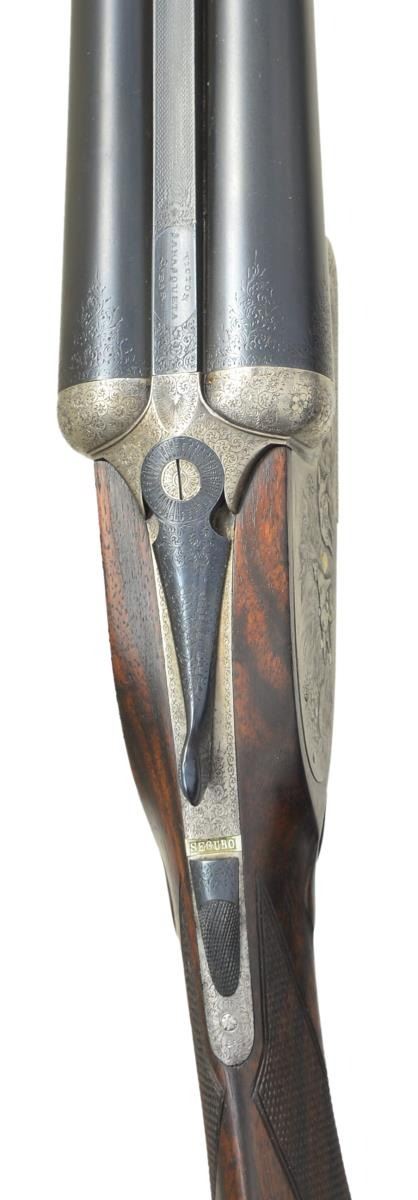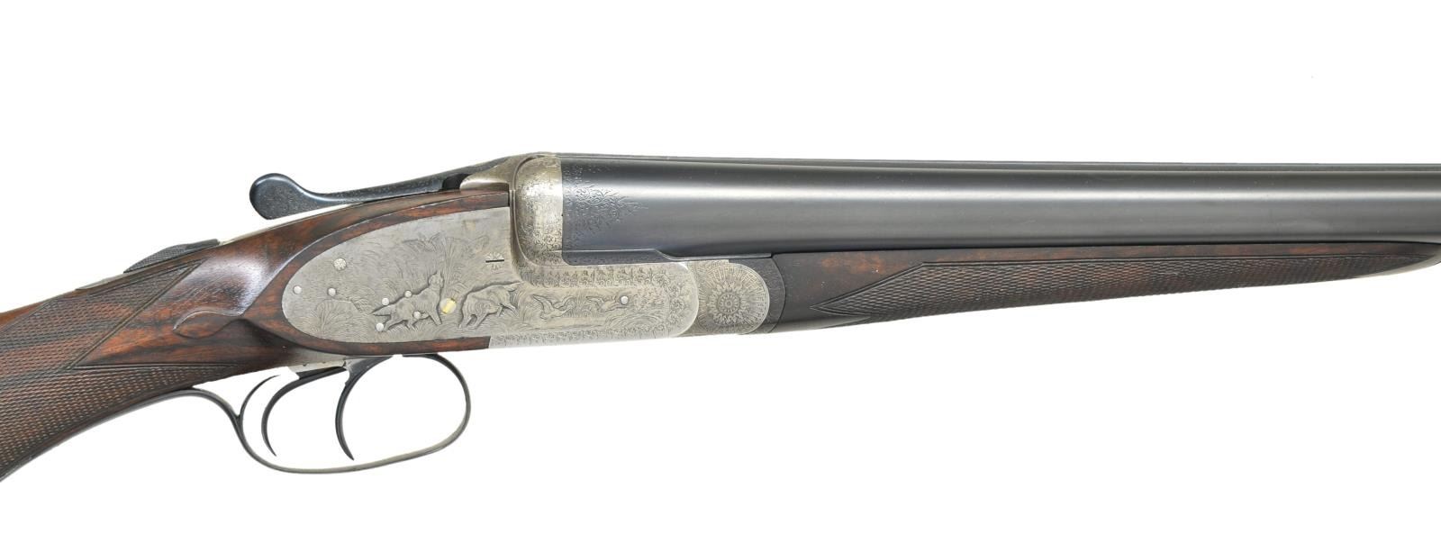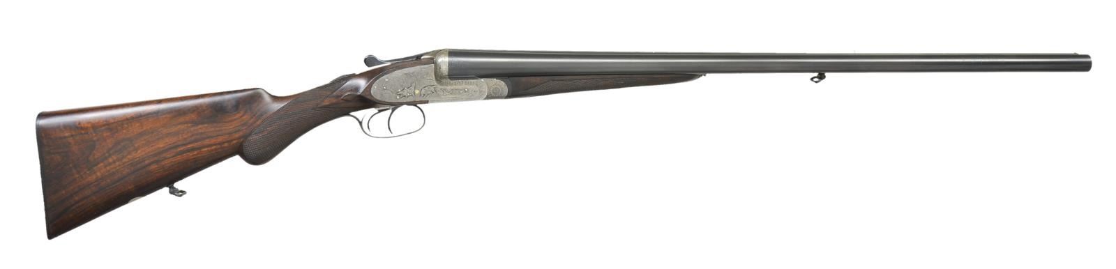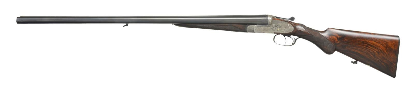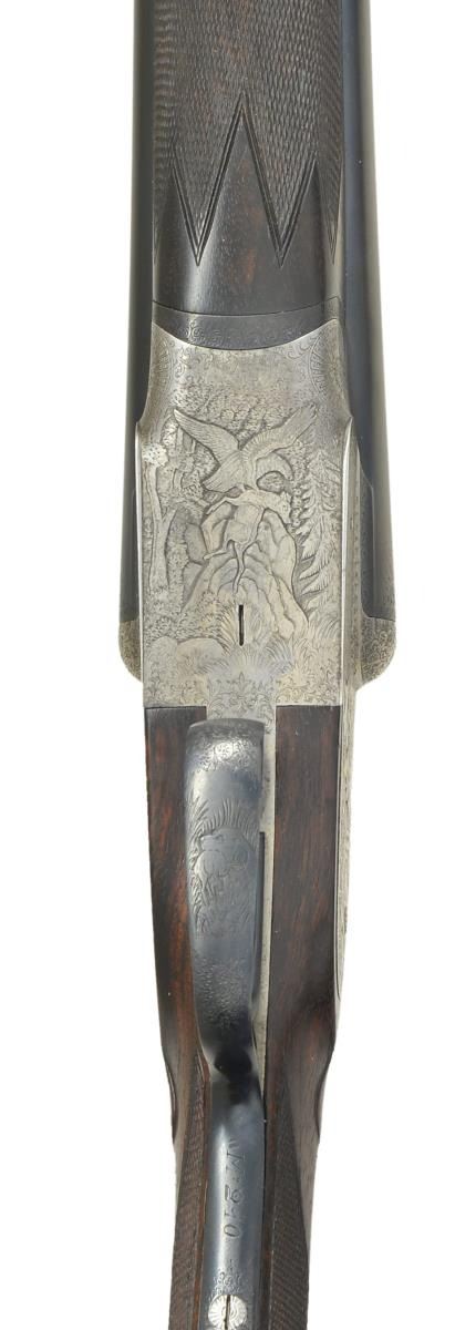 SHOTGUN. Cal. 12 Ga 2-3/4’’. S# 22082-14986. Bbl. 27-1/2’’ chopper lump w/ concave rib & brass bead. 7 pin sidelock action w/ double under lug & third bite locking. Exquisite game scene engraving. Right lock plate shows marsh scene w/ setters & flushing mallards. Left lock plate shows upland scene w/ pointing dogs & pheasants. Floorplate has a striking scene of an eagle taking a fawn. Trigger guard bow pictures a dog retrieving a rabbit. Balance of action has fine arabesque scroll w/ sunburst patterns around hinge pin. Engraving extends to forearm iron & breech end of bbls. Action features include pin type cocking indicators w/ gold bars, extractors & double triggers. Right trigger is hinged. Splinter forearm w/ Anson release. Round knob stock of fancy European walnut having point pattern checkering w/ tear drop points. Stock & bbl. have swing swivels. Toe line of stock has a German silver oval nameplate. LOP: 13-7/8’’ over original buttplate. DAC: 1-9/16’’. DAH: 2-9/16’’. Neutral cast. Bore diameter: RT .731, LT .731. Choke constriction: RT .012, LT .033. Minimum wall thickness: RT .023, LT .022. WEIGHT: 6 lbs, 15 ozs. Mfg. in Eibar, Spain prior to 1927. CONDITION: action finish has faded to a mild gray showing strong intact engraving. Bbls. are reblackened, iron fittings are reblued showing minimal engraving wear. Wood has a very good oil type refinish w/ freshened checkering. Pitting present in bores. Action is slightly off face w/ top lever sitting barely left of center. (23-694/DS). CURIO. $2,000-3,000.