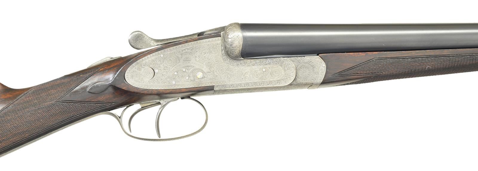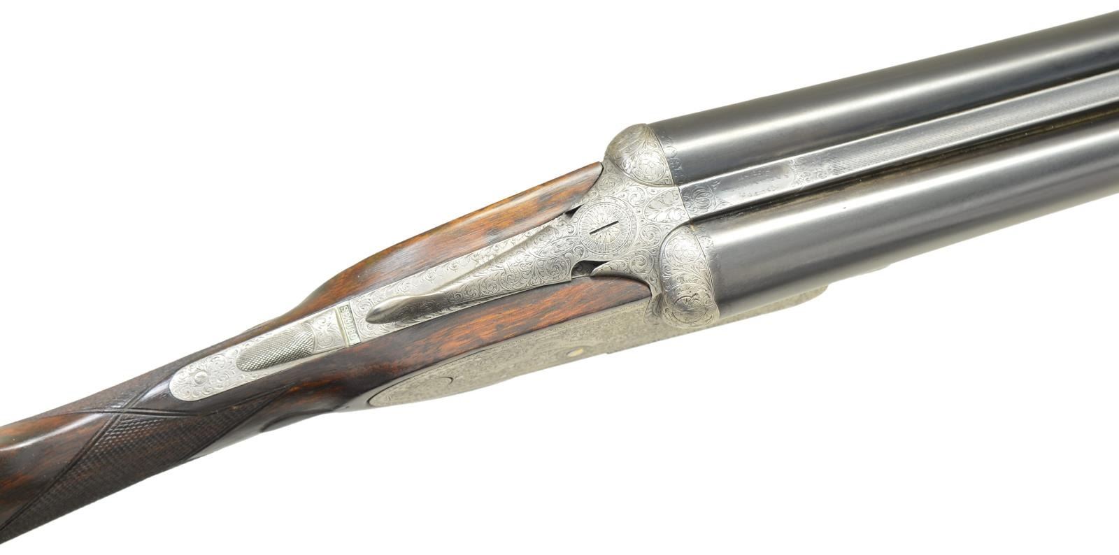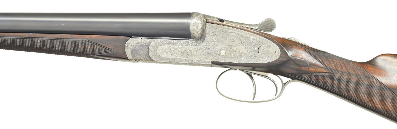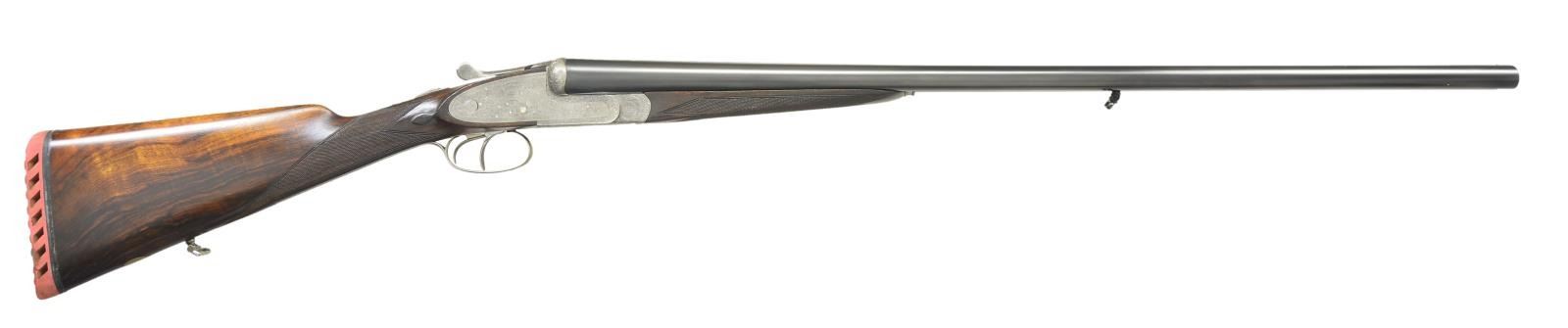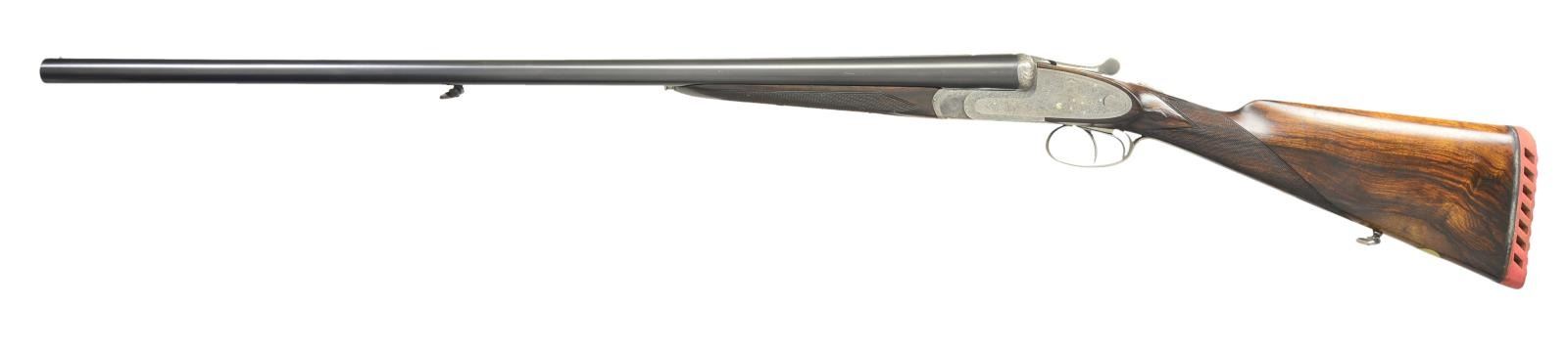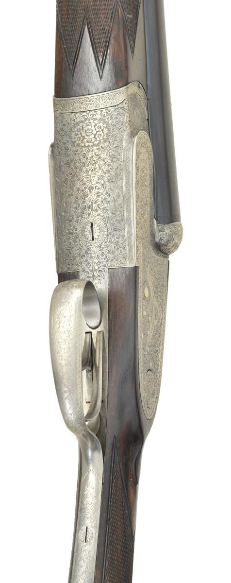 SIDELOCK SHOTGUN. Cal. 12 Ga 2-3/4’’. S# 21296. Bbl. 29-3/4’’ w/ concave solid rib. Hand detachable sidelock action. Features include double under lug & third bite locking w/ side clips & gold bar cocking indicators. Selective ejectors, double triggers, front trigger is hinged. Action has full coverage of arabesque scroll engraving w/ floral bouquet on floorplate. Splinter forearm w/ Anson release & straight hand stock of fancy European walnut. Features include hand checkering, tear drop point & oval nameplate at toeline. Bbl. & stock have sling swivels. LOP: altered to 13-5/8’’ over a red ventilated “DEL VALLE” pad. DAC: 1-1/2’’. DAH: 2-3/8’’. Stock has approx. 3/8’’ cast off. Bore diameter: RT .730, LT .732. Choke constriction: RT .035, LT .039. Minimum wall thickness: RT .031, LT .026. WEIGHT: 7 lbs, 3 ozs. CONDITION: action has a soft gray cleaned appearance & retains strong engraving. Bbls. have 97% reblacked finish. Bores show some light pitting. Wood has good refinished w/ freshened checkering. Action is tight & on face. (23-702/DS). CURIO. $2,000-3,000.