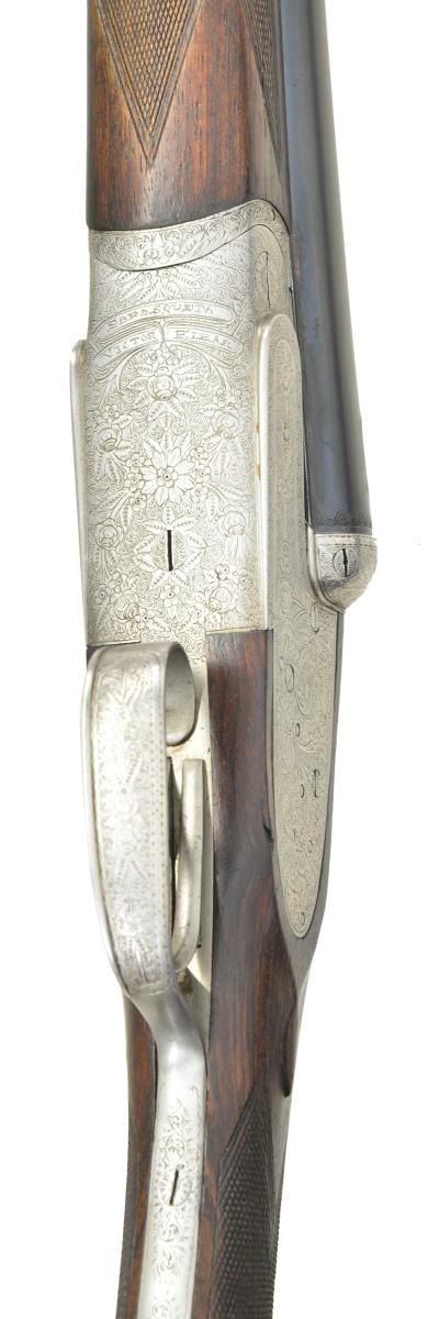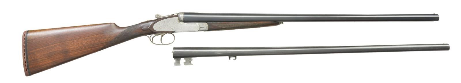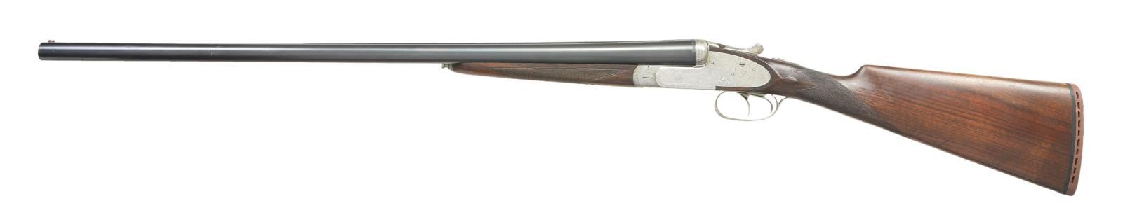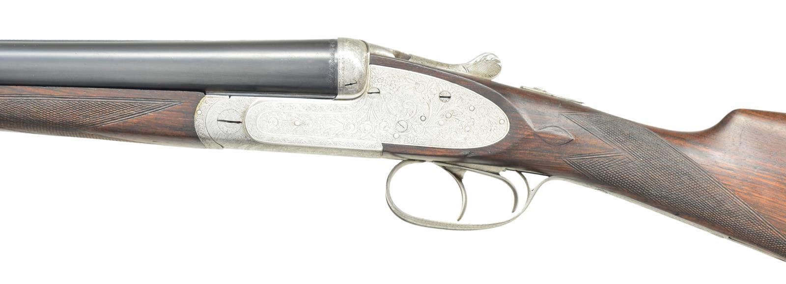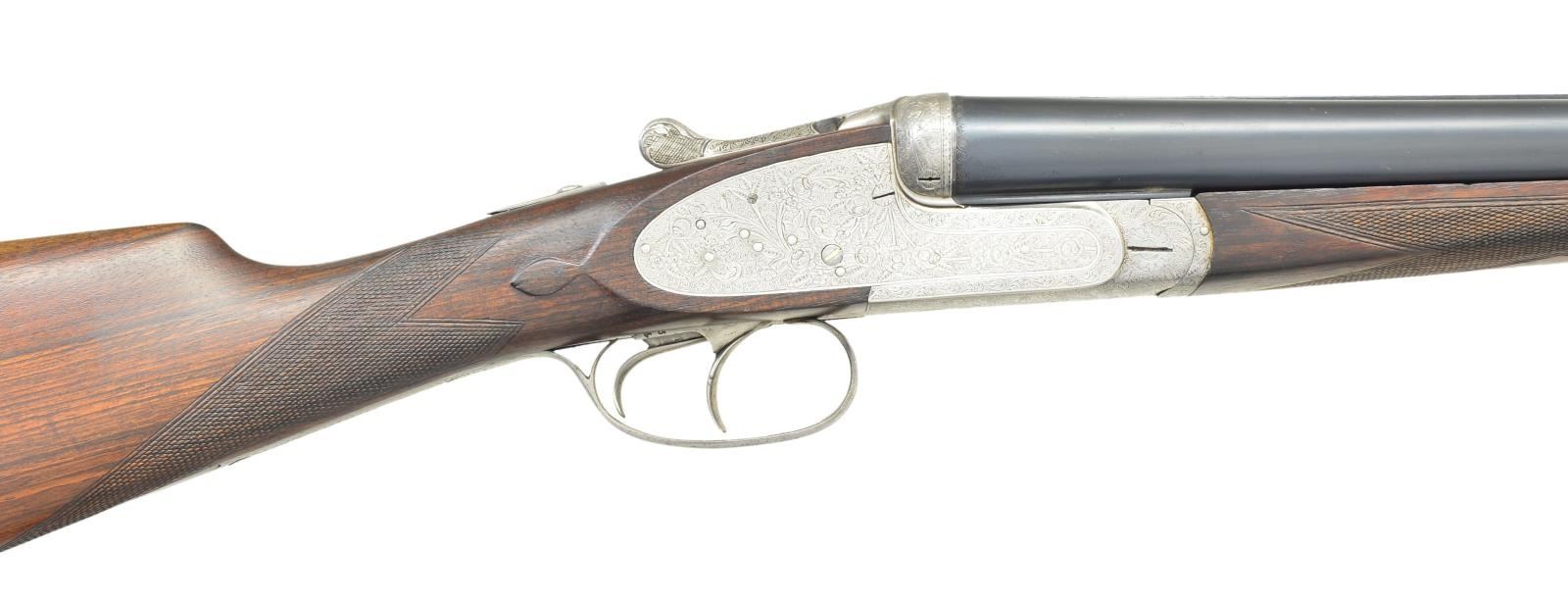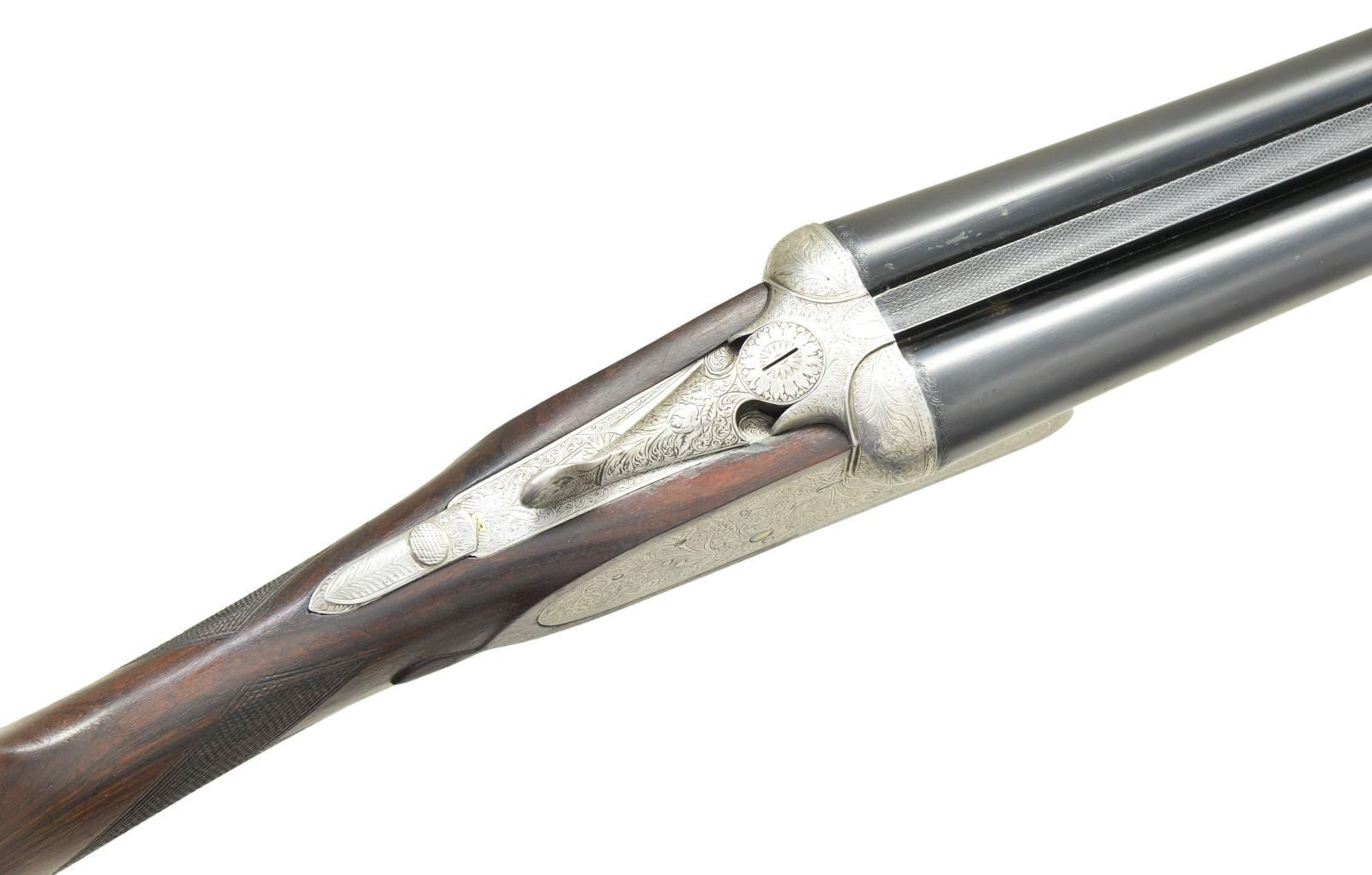 Cals. 12 Ga 2-3/4’’. S# 130955. 7 pin sidelock action w/ double under lugs, third fastener & cocking indicators. Selective ejectors. Double triggers, front trigger is hinged. Trigger guard has rolled right edge. Full coverage foliate scroll engraving that extends to forearm iron & breech end of bbls. Splinter forearm w/ Anson release. Straight hand stock w/ straight grained European walnut. Stock has point pattern hand checkering w/ tear drop points behind ears. LOP: 14-5/8’’ over an aftermarket thin brown ventilated pad. DAC: 1-3/8’’. DAH: 2-1/2’’. Neutral cast. (Bbl. No. 1) 27-3/4’’ w/ matted concave rid & red target front sight. Bore diameter: RT .721, LT .722. Choke constriction: RT .020, LT .039. Minimum wall thickness: RT .036, LT .037. (Bbl. No. 2) 29-1/2’’ w/ matted concave solid rib & white front sight. Bottom of bbls. are marked “Bristaratun”. Bore diameter: RT .726, LT .722. Choke constriction: RT .032, LT .035. Minimum wall thickness: RT .032, LT .034. Weight w/ 27-3/4’’ bbls: 6 lbs, 15 ozs. Mfg. before 1927. CONDITION: action has clean bright finish w/ sharp engraving. Bbl. No. 1 retains over 90% blue. Bbl. No. 2 has 70% lightly faded blue showing wear spots. Wood has moderately worn finish & checkering showing scratches & marks. All bores are sound & bright. Action is tight & on face. (23-698/DS). CURIO. $1,500-2,500.
