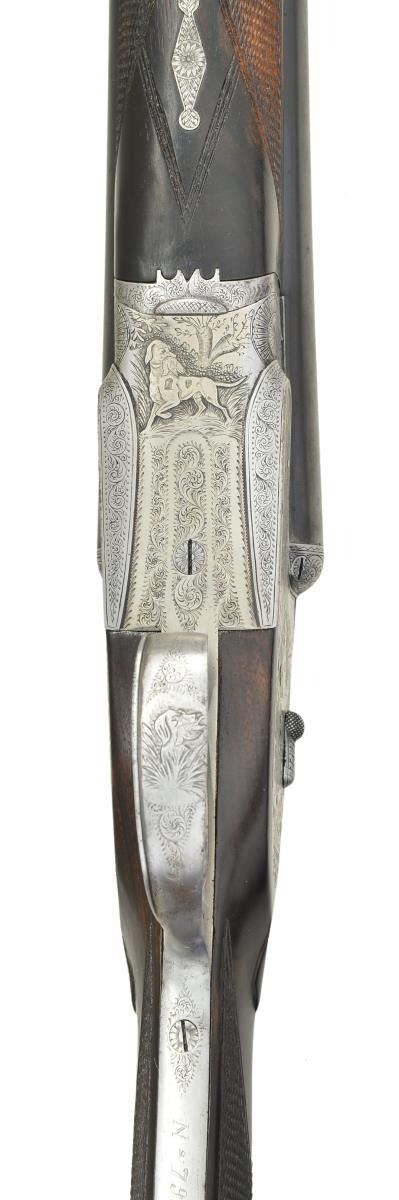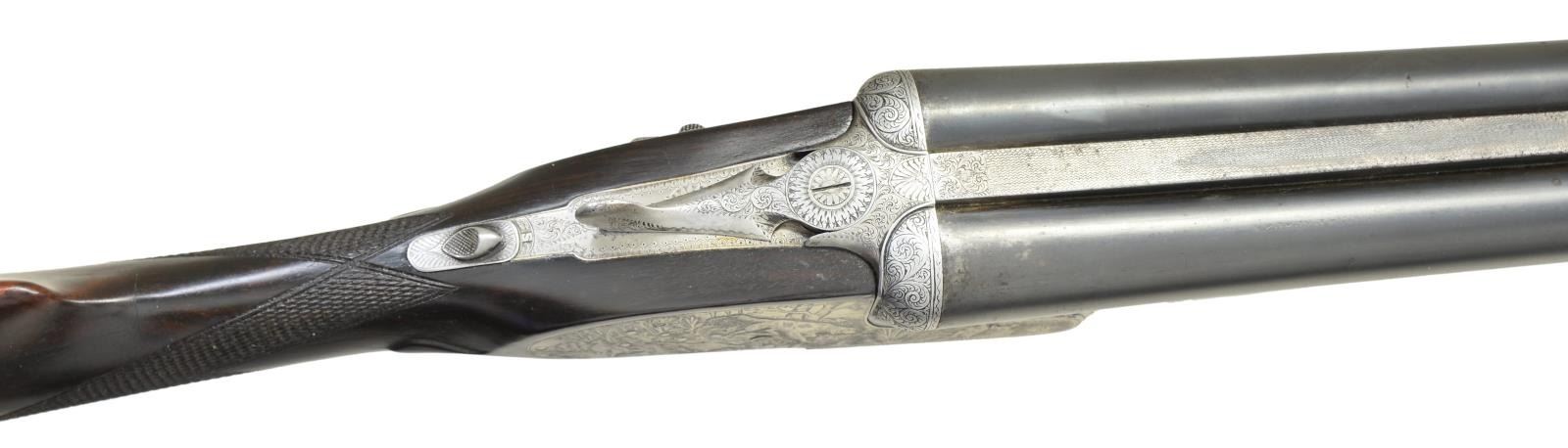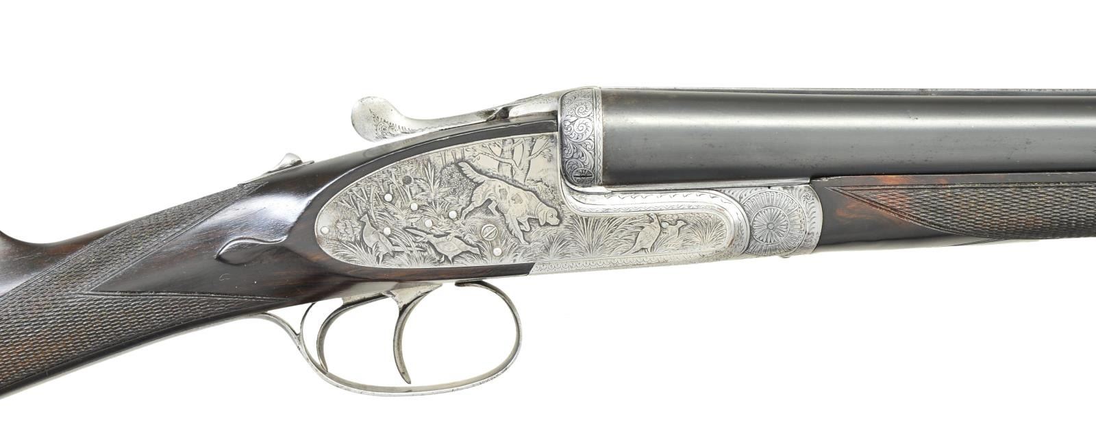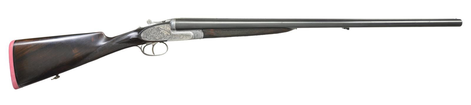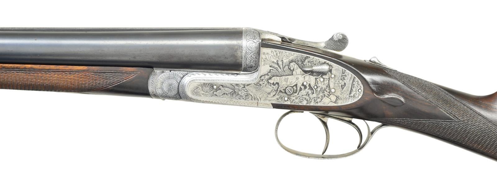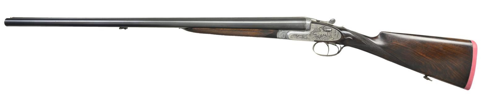 SHOTGUN. Cal. 12 Ga 2-3/4’’. S# 79779. Bbls. 27-1/2’’ w/ steel bead. Hand detachable sidelock action has full coverage of highly detailed game scene engraving. Right lock plate depicts a pointing setter w/ pheasants. Left lock plate shows 2 pointers w/ quail. Pointer w/ a bird in his mouth adorns the floorplate & another portrait of a pointer is found on the trigger guard bow. Balance of the action & forearm iron are covered w/ fine arabesque scroll. Features include double under lug & third bide locking, hand detachable locks, cocking indicators, hinged front trigger & ejectors. Trigger guard bow has a rolled right edge. Splinter forearm & straight hand stock of fine European walnut w/ point pattern hand checkering having tear drop points. Bbl. & stock have sling swivels. LOP: 14-1/8’’ over a solid red pad. DAC: 1-3/8’’. DAH: 2-1/8’’. Neutral cast. Bore diameter: RT .730, LT .726. Choke constriction: RT cyl. bore, LT .020. Minimum wall thickness: RT .028, LT .030. WEIGHT: 6 lbs, 13 ozs. Bbl. date code indicates 1945 mfg. CONDITION: bbls. retain 80% lightly worn blue showing spots of freckling. Action has a cleaned gray appearance. Stock has an added wood repair at the peak of the comb. Wood has good refinish showing small marks. Action exhibits slight looseness & is off face. Right bore shows scattered spots of very light pitting. Left bore is bright. (23-707/DS). CURIO. $1,500-2,500.