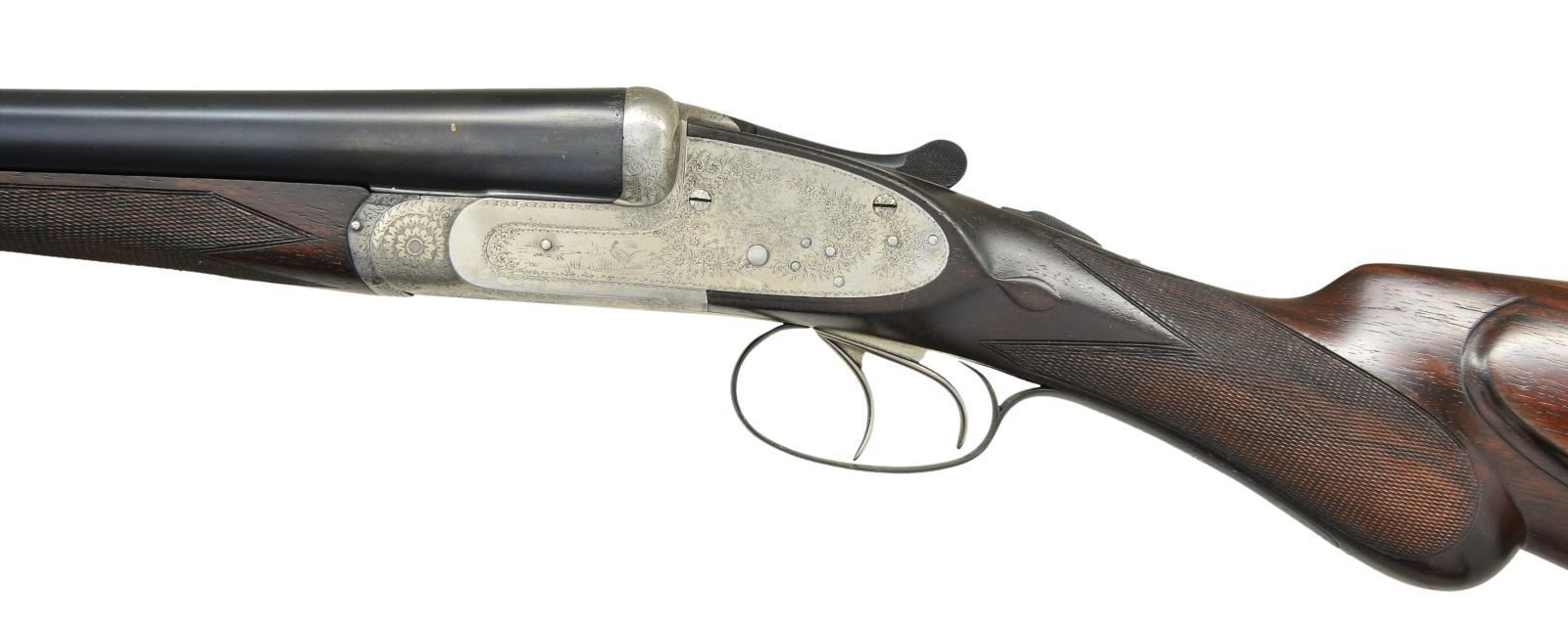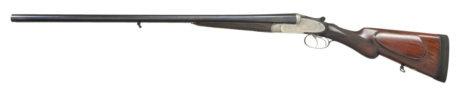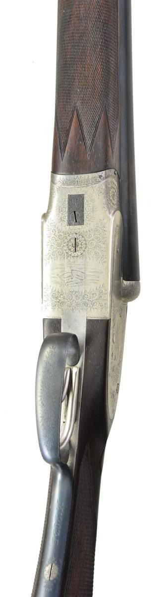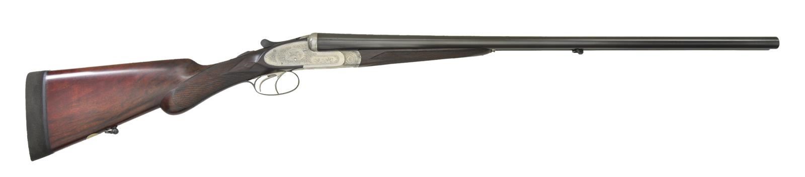 Cal. 12 Ga 2-3/4’’. S# 22523. Bbl. shortened to 28-1/2’’ w/ solid rib & brass bead. Rib is marked “Victor Sarasqueta, Eibar”. Sidelock action w/ double under lug & third fastener locking. Selective ejectors & double triggers. Action has fine arabesque scroll engraving surrounding game birds on locks & floorplate. Splinter forearm w/ Anson release & round knob stock of fancy European walnut w/ hand checkering & tear drop points. Toeline has German silver oval nameplate. Stock & bbl. have sling swivels. LOP: shortened to 14’’ over a thick black foam pad. DAC: 1-9/16’’. DAH: 2-3/8’’. Neutral cast. Bore diameter: RT .740, LT .738. Choke constriction: RT cyl. bore, LT cyl. bore. Minimum wall thickness: RT .026, LT .025. WEIGHT: 6 lbs, 13.2 ozs. Mfg. 1941. CONDITION: action is cleaned, bright & retains very good engraving. Bbls. have 98% reblacked finish. Trigger guard & fittings are reblued w/ good engraving. Refinished wood has freshened checkering. Bore shows scattered light pitting. Action is tight & on face. (23-689/DS). CURIO. $1,250-1,750.