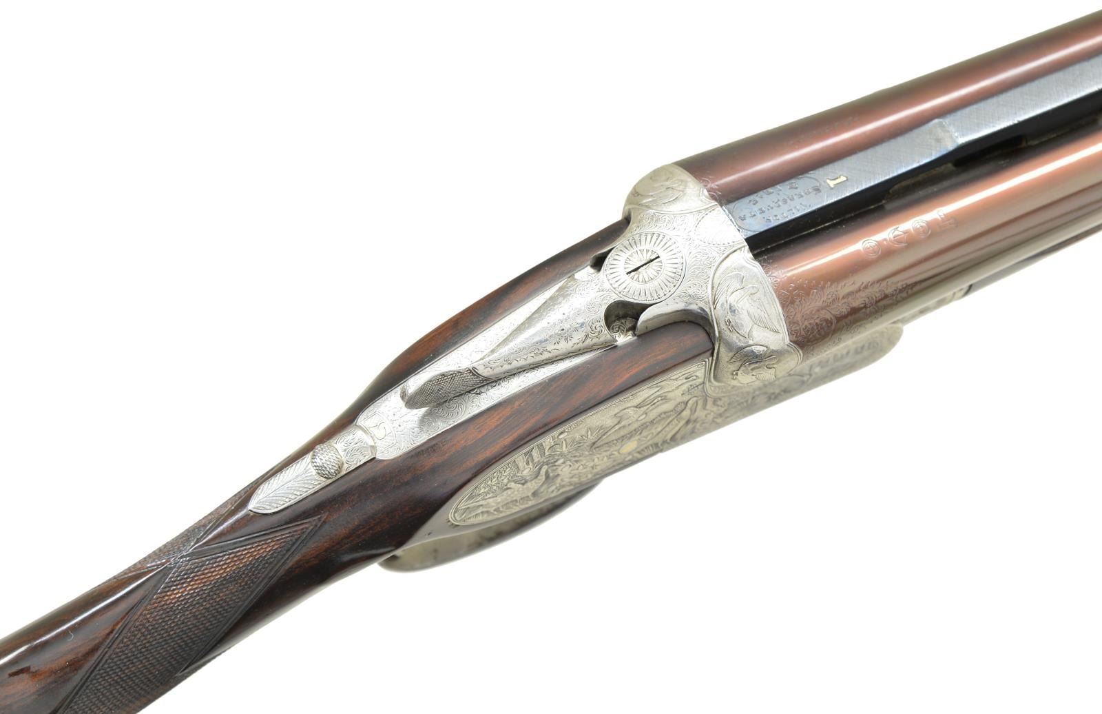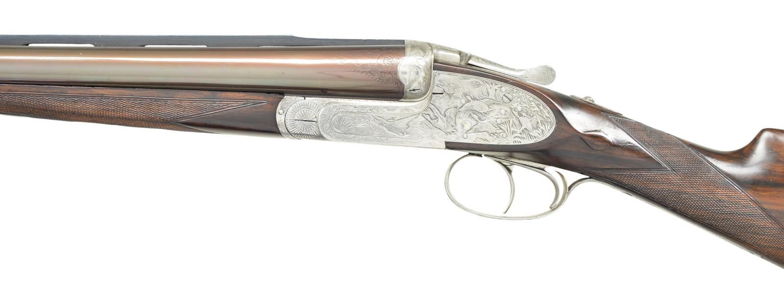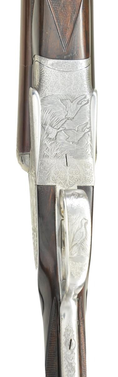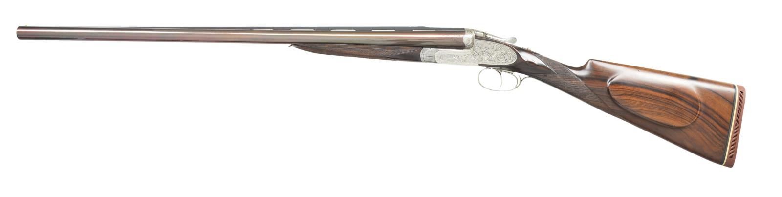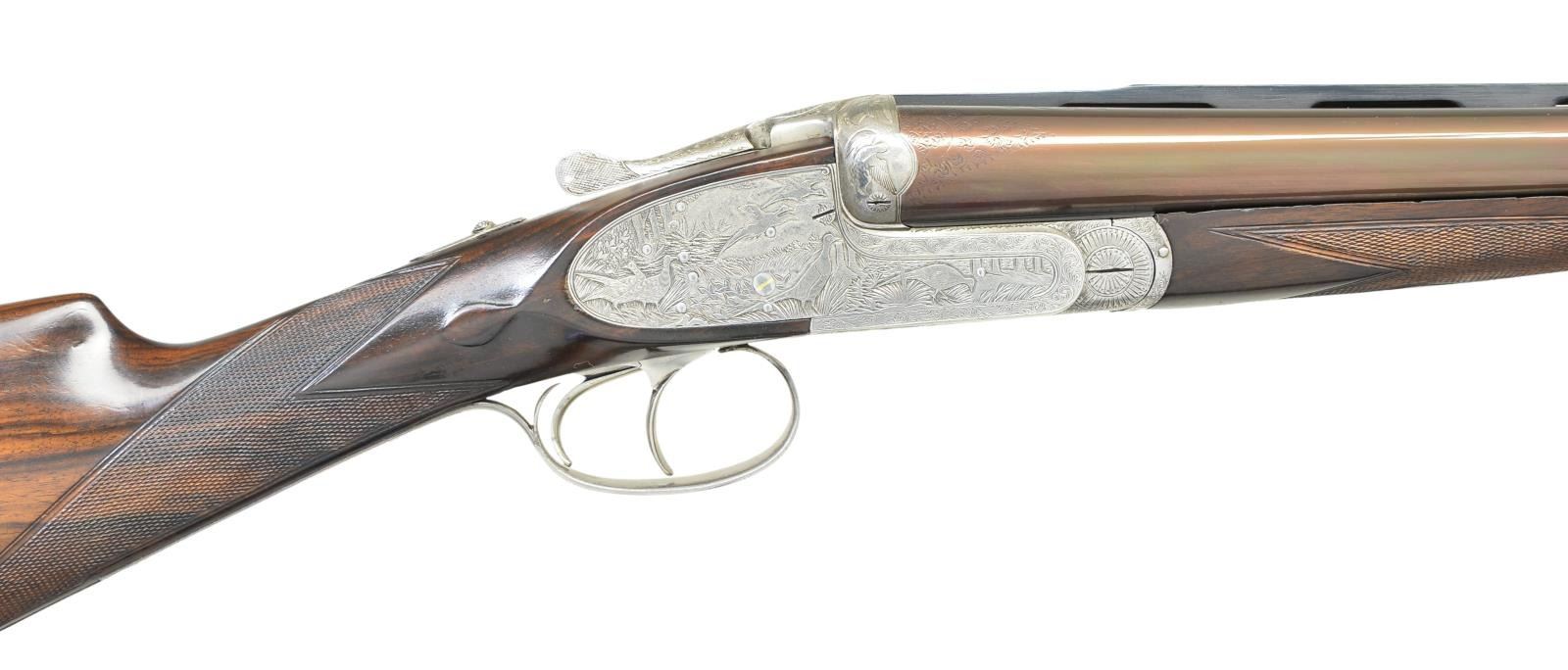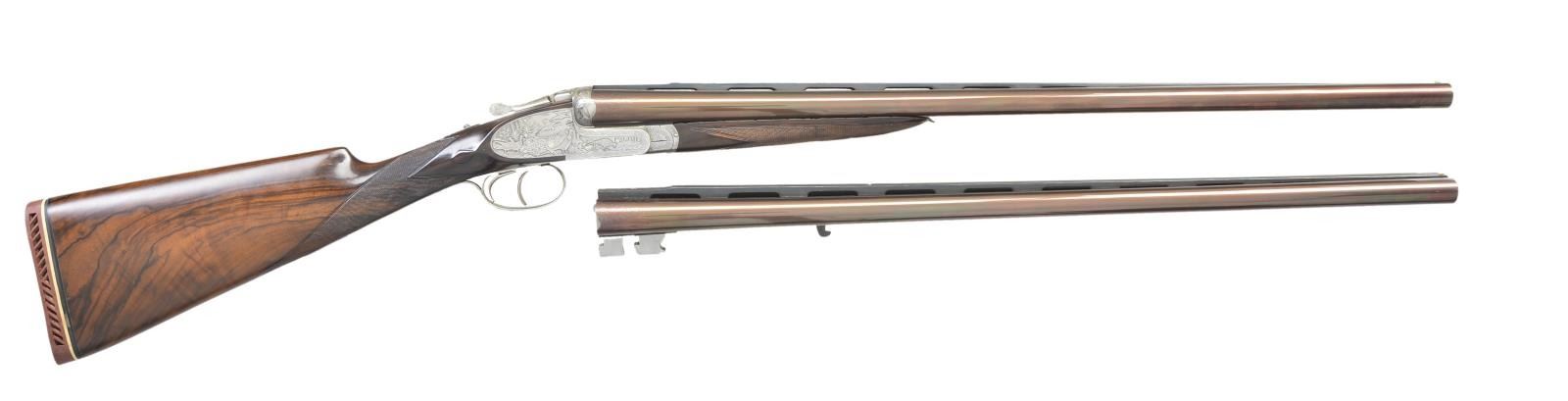 SET SHOTGUN. Cal. 12 Ga 2-3/4’’. S# 96517. 7 pin sidelock action w/ double under lugs, third fastener & side clips. Selective ejectors, gold bar cocking indicators & double triggers, front trigger is hinged. Full coverage game scene engraving. Right lock plate shows an upland scene w/ pheasants. Left lock & floorplate have marsh scenes w/ flying ducks. Trigger guard bow depicts a shore bird. Bolsters have deep relief carved flying woodcock. Balance of receiver has fine arabesque scroll that extends to long tang trigger guard & forend iron. Splinter forearm w/ lever release & straight hand cheek piece stock of fine European walnut. Stock & forearm have fine point pattern hand checkering w/ tear drop points behind ears. LOP: 14-1.2’’ over an aftermarket “IRUPE” ventilated pad. DAC: 1-7/8’’. DAH: 3-1/2’’. Near neutral cast. Both sets of bbls. are 26’’ w/ high hand matted ventilated ribs. Ribs are marked “Victor Sarasqueta Eibar”. Weight w/ bbl. set no. 1: 7 lbs, 6.4 ozs. (Bbl. No. 1) Rib has gold number “1” w/ white beads. Bore diameter: RT .724, LT .724. Choke constriction: RT .004, LT .203. Minimum wall thickness: RT .040, LT .035. (Bbl. No. 2) Rib has gold number “2” w/ white front bead & aluminum mid bead. Bore diameter: RT .724, LT .724. Choke constriction: RT .028, LT .040. Minimum wall thickness: RT .040, LT .036. Date code indicates 1950 mfg. CONDITION: refinished gun. Action has brightly cleaned finish showing some weakening of engraving. Both sets of bbls. are reblued. Ribs have proper dark bluing. Bbls. have acquired a plum color from caustic bluing. Rib matting & engraving show some weakening from polishing. Bbl. No. 1 bores show light pitting towards breech end. Bbl. No. 2 have very good bright bores. (23-697/DS). CURIO. $1,250-1,750.