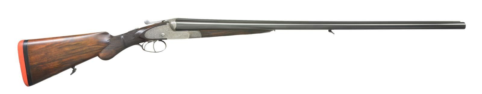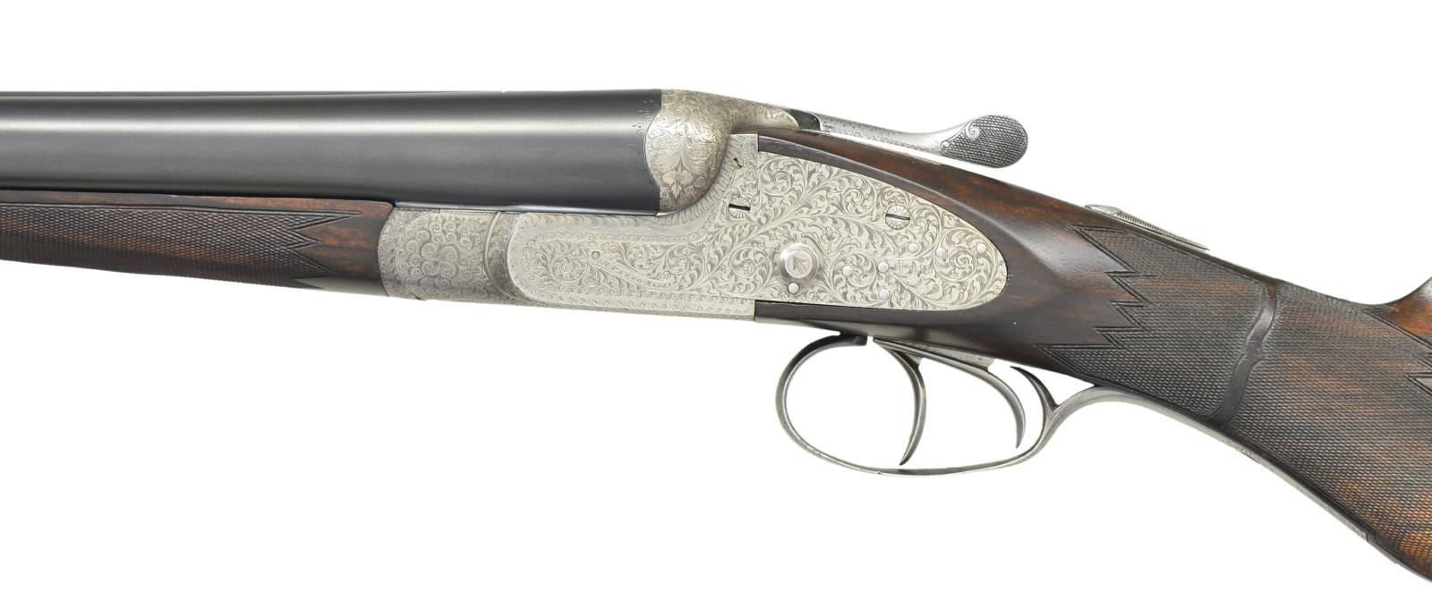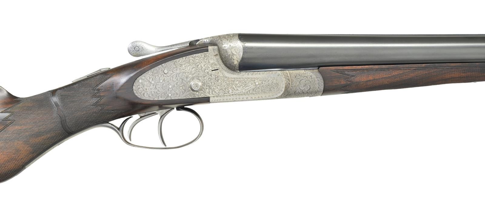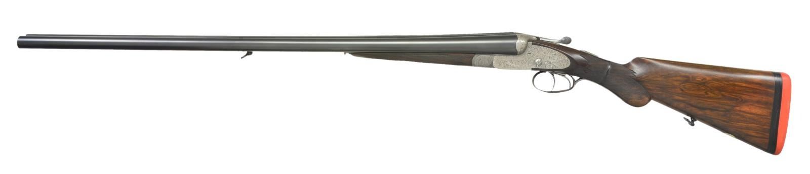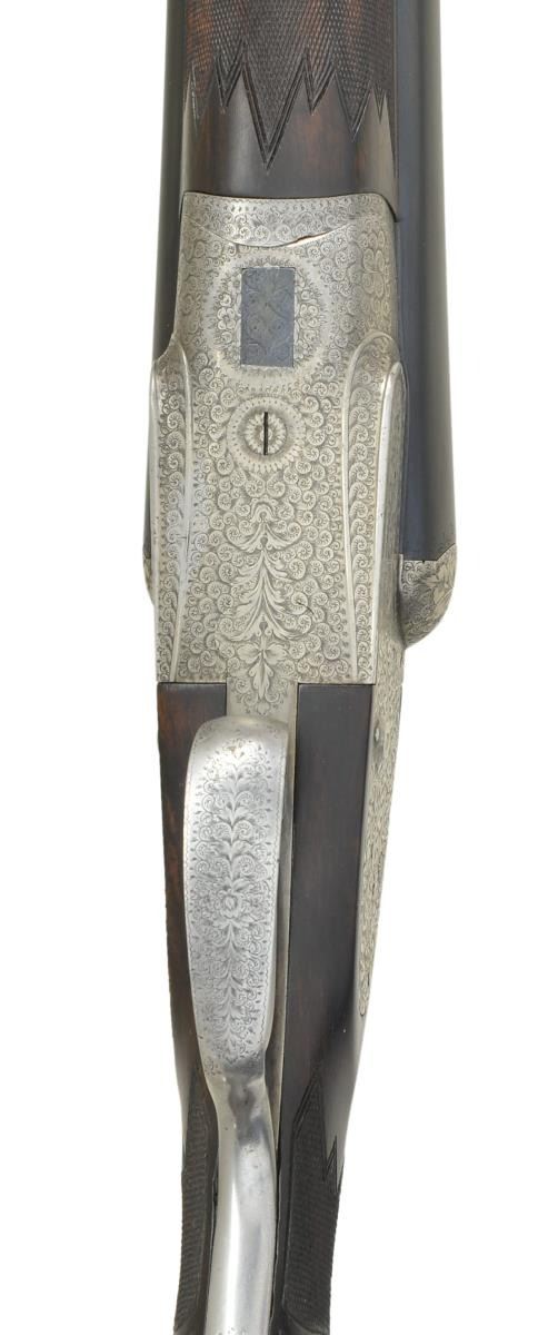 Cal. 12 Ga 2-3/4’’. S# 13724. Bbl. 29-5/8’’ w/ concave matted rib. Case colored sidelock action. Features include double under lug & crossbolt locking w/ side clips & raised pin type cocking indicators. Selective extractors & double triggers. Locks have full coverage of vine type foliate scroll hand engraving. Balance of action & forearm iron have fine arabesque scroll engraving w/ floral highlights. Lock plates are engraved “N. Pardo Madrid”. Splinter forearm w/ Anson release & round knob stock of fancy European walnut. Forearm has fine point pattern checkering. Stock has ribboned point pattern hand checkering. Bbl. & stock have sling swivels. Stock has oval nameplate in toeline. LOP: altered to 14-1/2’’ over a London style solid pad & 1/4’’ spacer. DAC: 1-1/2’’. DAH: 2-3/4’’. Stock has approx. 1/8’’ cast off. Bore diameter: RT .727, LT .727. Choke constriction: RT .014, LT .037. Minimum wall thickness: RT .038, LT .035. WEIGHT: 7 lbs, 6.6 ozs. Bbl. date code indicates 1954 mfg. CONDITION: action has soft gray cleaned appearance retaining sharpened engraving. Bbls. retain 98% reblackened finish. Bores show scattered very light pitting. Wood has very good refinish w/ freshened checkering. Action is tight & on face. (23-709/DS). CURIO. $1,250-1,750.