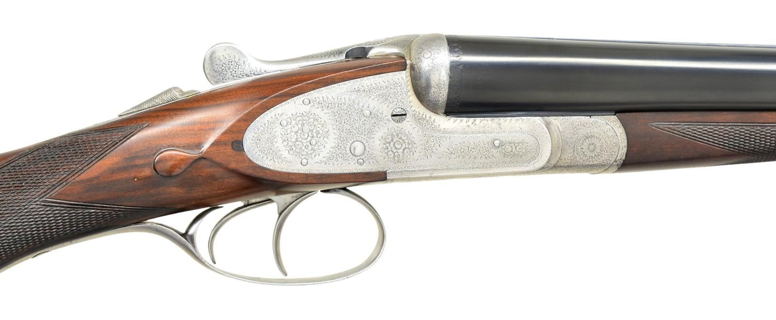 WITH TWO BARREL SETS; ONE WITH RIFLED BORE. Cal. 12 ga. 2 3/4". S# 2021. bbls. Made during the period when Victor Sarasqueta produced some very high quality guns, this gun has 2 sets of bbls.; set gold inlaid "1" measures 27 5/8", set gold inlaid "2" measures 26 1/4", both with concave game ribs engraved with maker's name and address and maker to King Don Alfonso the 8th information. Rear portions of ribs are also gold inlaid with Victor Sarasqueta "VS" running rabbit crowned trademarks. Bbl. flats are stamped with pre-1927 Spanish Nitro proofs for 12 ga. Right bbl. of set "2" has full length shallow rifling. Coin finished sidelock action features automatic safety ("SEGURO" inlaid in gold), hidden third fastener, gas vents and double triggers. Serial number is on water table. Action is engraved with near full coverage British style rose and scroll. Newly made high quality round knob pistol grip buttstock of dark well streaked European walnut measures 15" over red "Silver" type pad. Stock features drop points, point pattern checkering and silver oval engraved "JAG". Matching splinter ejector forend services both bbl. sets and has Anson release. MEASUREMENTS: BBL. SET "1": Bore Diameter: R .727", L .730". Restriction: R .012" (MOD), L .028" (IMOD). Min. Wall Thickness: R .020", L .029". BBL. SET "2": Bore Diameter: R .725" (RIFLED), L .729". Restriction: R 0" (CYL), L .029" (IMOD). Min. Wall Thickness: R .023", L .029". STOCK: DAH: 2 1/2". DAC: 1 9/16". LOP: 15". CAST: approx. 3/8" off. WEIGHT W/ BBL SET "1": 6 lb. 13 oz. UNATTACHED ACCESSORIES: extra bbl. set. CONDITION: good as reconditioned. Bbls. retaining nearly all of a good quality reblack with a few subsequent marks, engraving has softened a bit. Action is cleaned to coin finish. Engraving getting quite thin on bottom and trigger guard. New stocks retain nearly all of their oil finish with some minor subsequent marks. Bores are bright and shiny in bbl. set "1". Bbl. set "2" is lightly frosted throughout both bores. Action is tight. Bbls. are on face. (22-4518/MGM). CURIO. $2,000-3,000.