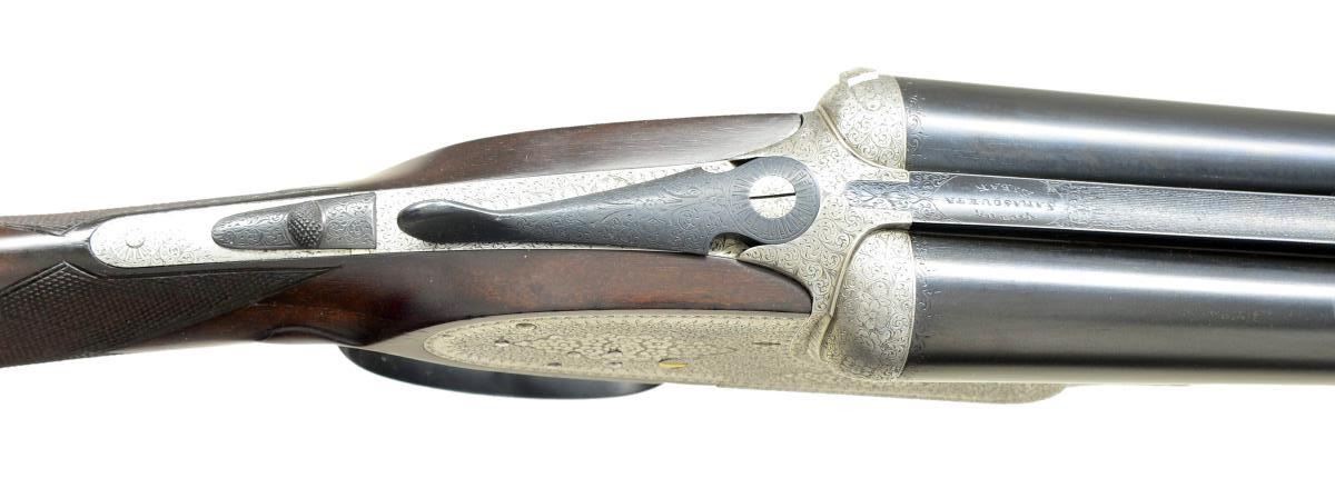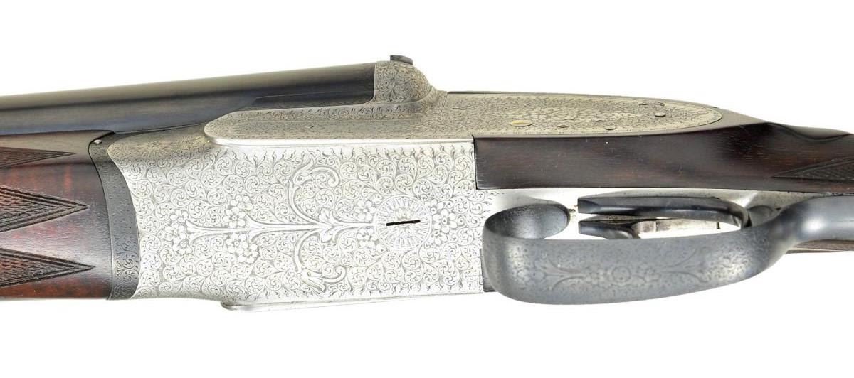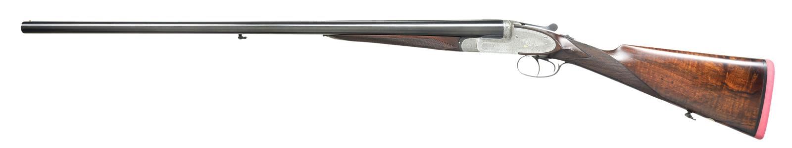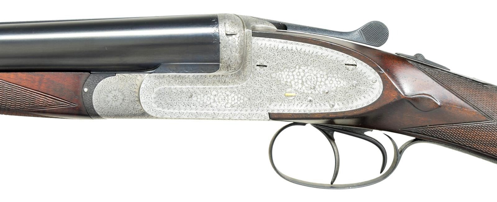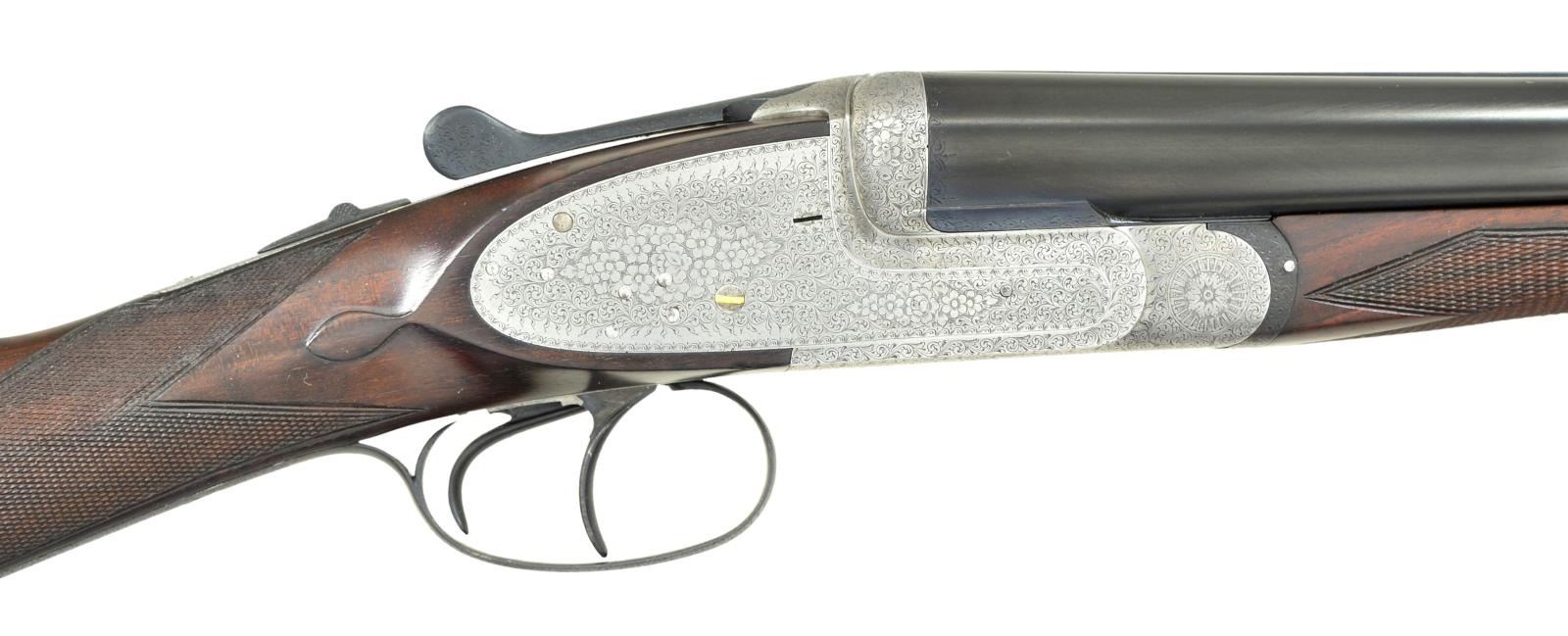 SIDELOCK EJECTOR HEAVY GAME OR PIGEON SHOTGUN. Cal. 12 ga. 2 3/4". S# 39833. Before WWII, Victor Sarasqueta was known for making some of the world's finest guns, many for royalty. This fine gun, made between 1929-31 has 29 3/4" well struck chopperlump bbls. Rear portion of concave matted rib is engraved "Victor" "Sarasqueta" "Eibar" in front of rib extension. Bbl. flats are stamped with Spanish Nitro proofs unique to the period between 1929 and 1931 for 2 3/4" chambers along with running rabbit "VS" logos. Robust coin finished sidelock action features automatic safety ("SEGURO" on silver rectangle), square crossbolt third fastener, vented strikers, gold band tumbler end cocking indicators, slight reinforce to action and double triggers (front articulated). Action is exceptionally well filed and is engraved with very fine full coverage British inspired rose and scroll on lockplates. Bottom of action has floral device superimposed on background of small shaded scroll. Trigger guard is marked "M209" on tang. Straight grip buttstock of fiddle figured and lightly marbled European walnut measures 14 1/2" over "Silver" type pad. Stock features drop points, point pattern checkering on semi diamond hand along with a sling loop and gold oval engraved with monogram "MJ"? on toeline. Matching splinter ejector forend has Anson release. MEASUREMENTS: BBLS: Bore Diameter: R .727", L .727". Restriction: R .035" (FULL), L .038" (FULL). Min. Wall Thickness: R .029", L .036". STOCK: DAH: 2 1/2". DAC: 1 1/2+". LOP: 14 1/2". CAST: neutral. WEIGHT: 7 lb. 9 oz. CONDITION: fine as lightly refinished. Bbls. retaining nearly all of a best reblack with a few minor scratches. Action with light polishing to maintain coin finish. Top lever, trigger guard and forend iron retain nearly all of a frosty reblue. Stocks with light oil refinish over a few marks. Checkering recut. Bores are bright and shiny with some very minor light frosting and evidence of minor dent removal about 10" behind muzzle in right bbl. Action is tight. Bbls. are on face. Ejectors are slightly out of time. (22-4520/MGM). CURIO. $2,000-3,000.