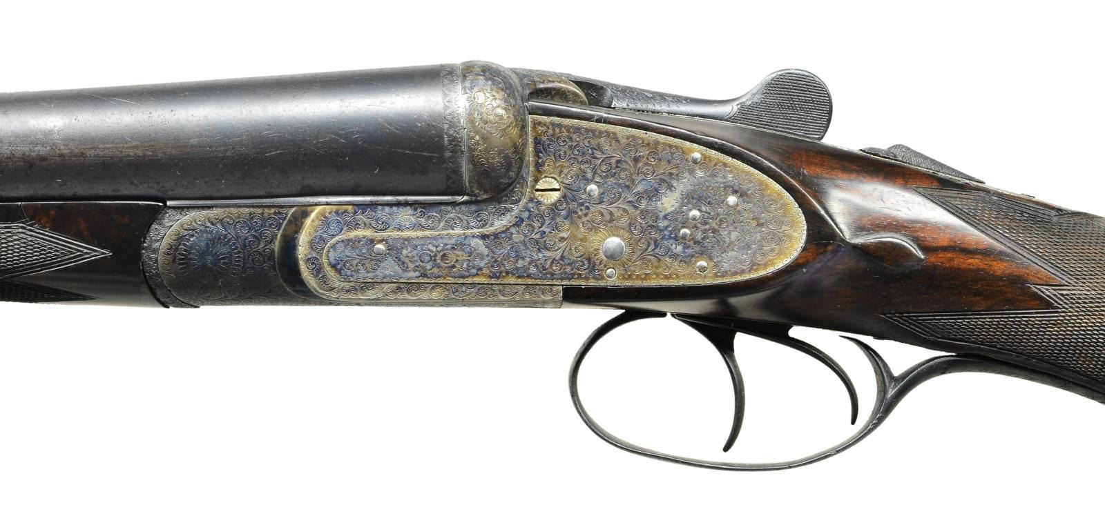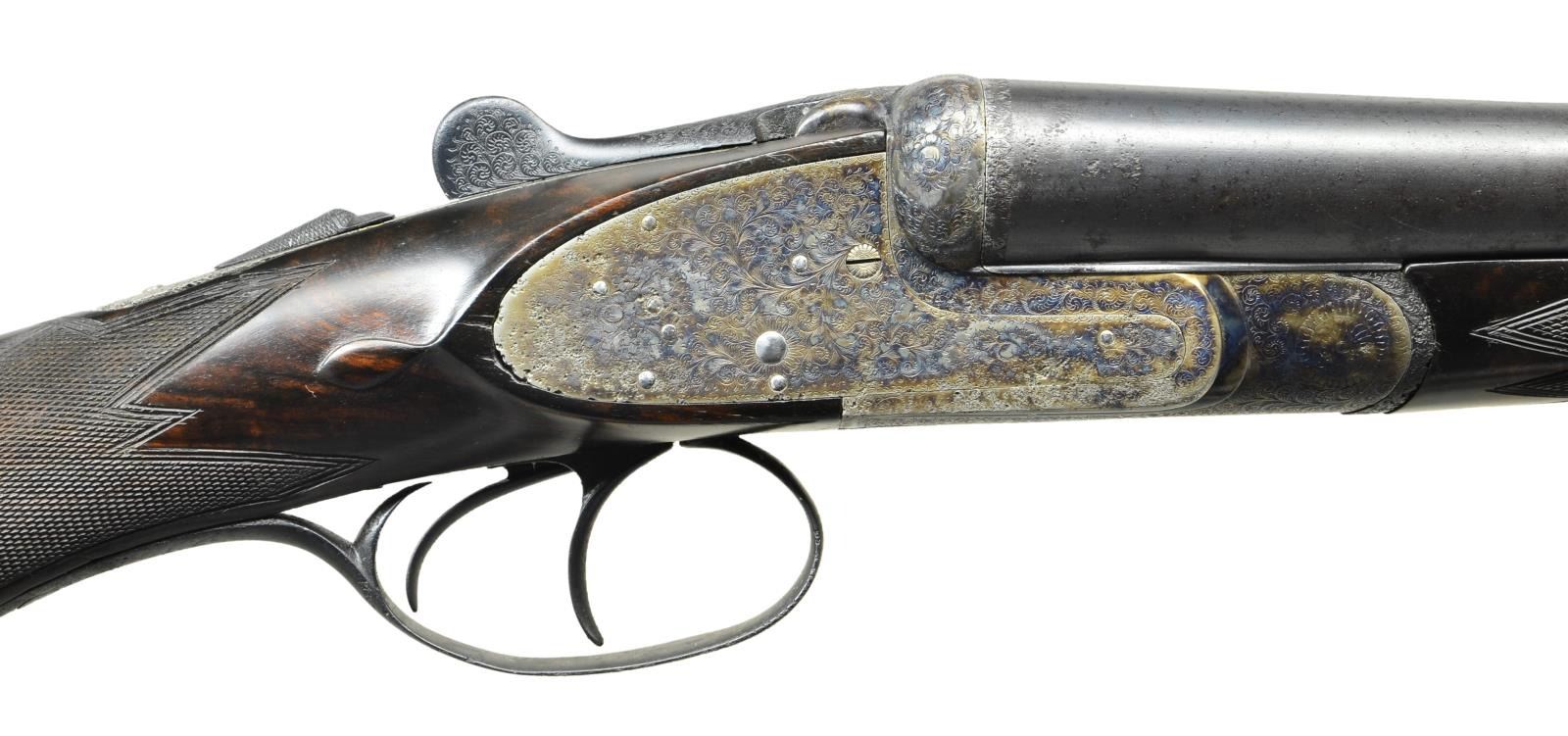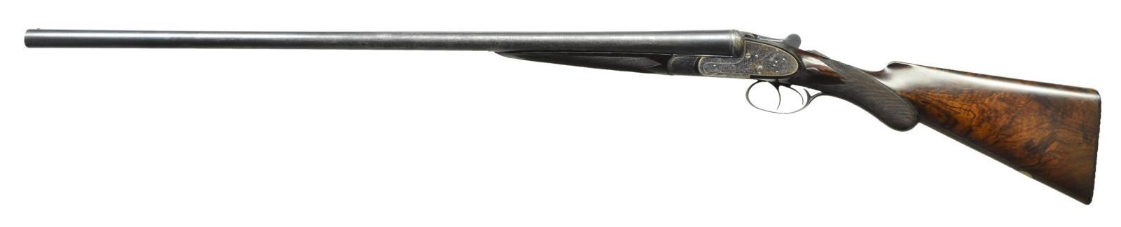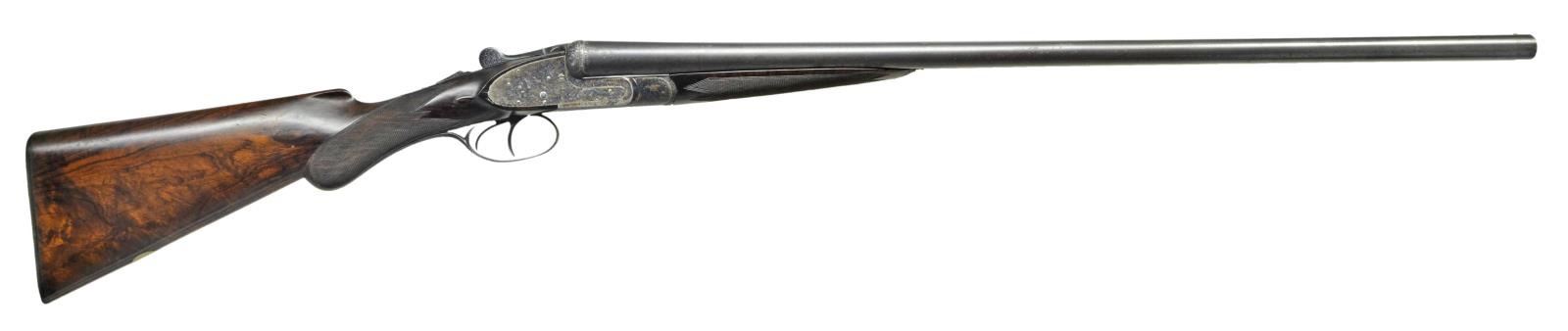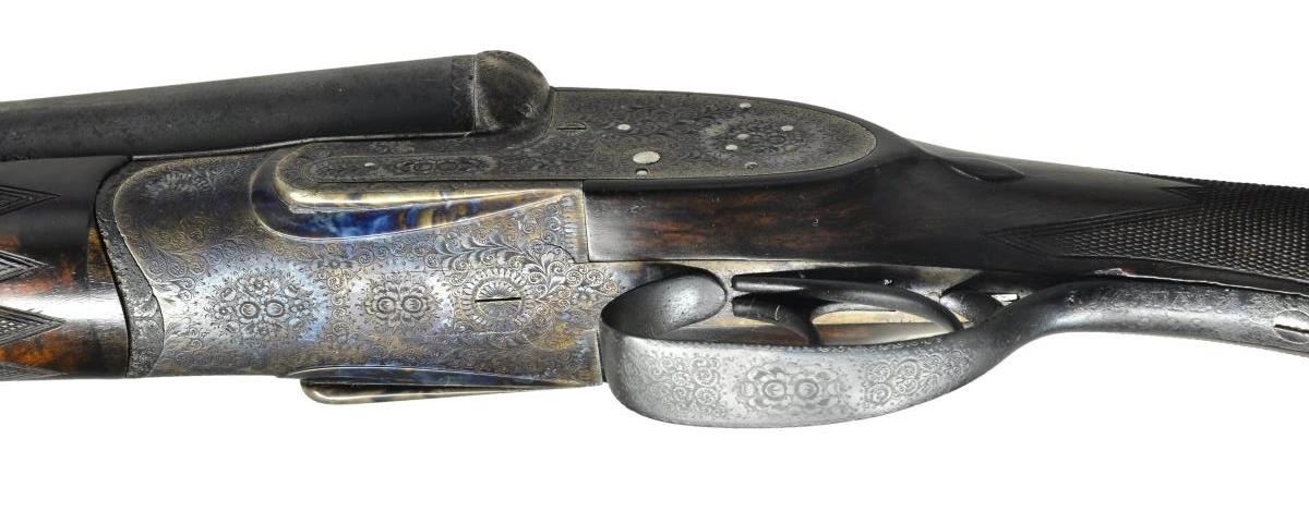 GUN. Cal. 12 Ga., 2 3/4". S# 1802. Bbls. 29 5/8" Chopperlump, engraved w/ maker's name & King Don Alfonso VIII info. along w/ "VS" running rabbit logo on matted game rib. Bbl. flats are stamped w/ pre-1927 Spanish Nitro proofs for 12 ga. Case hardened sidelock action is stocked to the fences & features automatic safety ("SEGURO" on platinum rectangle), hidden third fastener, vented strikers & dbl. triggers (Front articulated). Action is engraved w/ near full coverage hand cut rose & scroll, similar to post war model 8 pattern. Fences are engraved w/ rose bouquets. Trigger guard w/ scroll on bow has model engraved on tang. Rnd. knob pistol grip buttstock of dense well figured & nicely marbled European walnut measures 14 1/2" over ribbed horn buttplate w/ Sarasqueta trademark. Stock also features drop points & point pattern checkering along w/ a vacant silver oval. Matching splinter forend has Anson release. MEASUREMENTS: BBLS: Bore Diameter: R .737", L .736". Restriction: R .028", L .028" (IMOD). Min. Wall Thickness: R .025", L .029". STOCK: DAH: 2 1/2+". DAC: 1 5/16". LOP: 14 1/2". CAST: neutral. WEIGHT: 7 lb. 8 oz. CONDITION: good as refinished. Bbls. retaining most of an old reblack over considerable, very deep pitting, mostly on side of left bbl. which extends under wood of forend, most likely the result of prolonged contact w/ blood. Action retains nearly all of a recolor hardening w/ considerable pitting on right side of action & rear of right lockplate. Trigger guard is also deeply pitted under its reblue. Stocks retain most of a good oil refinish w/ a few subsequent marks. Checkering recut. Forend iron & tip also show considerable pitting at juncture of wood. Forend has repaired wood near juncture w/ forend iron tip at rear. Bores are bright and shiny w/ some light striations. There is a slight unmeasurable bulge behind choke in right bbl. Mechanically good. Action is very stiff & tight. Bbls. slightly off face. (22-4519/MGM). CURIO. $1,200-1,800.