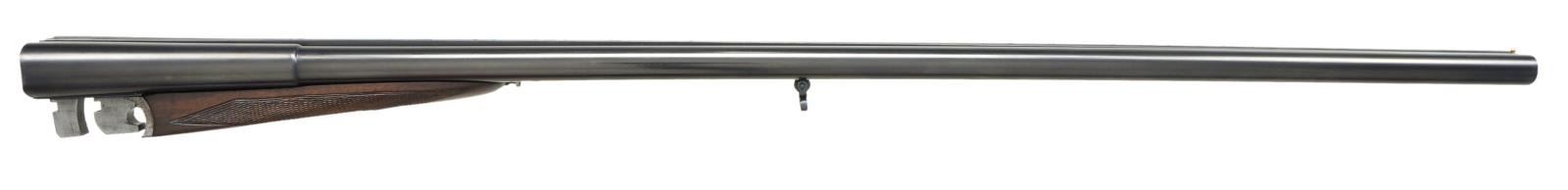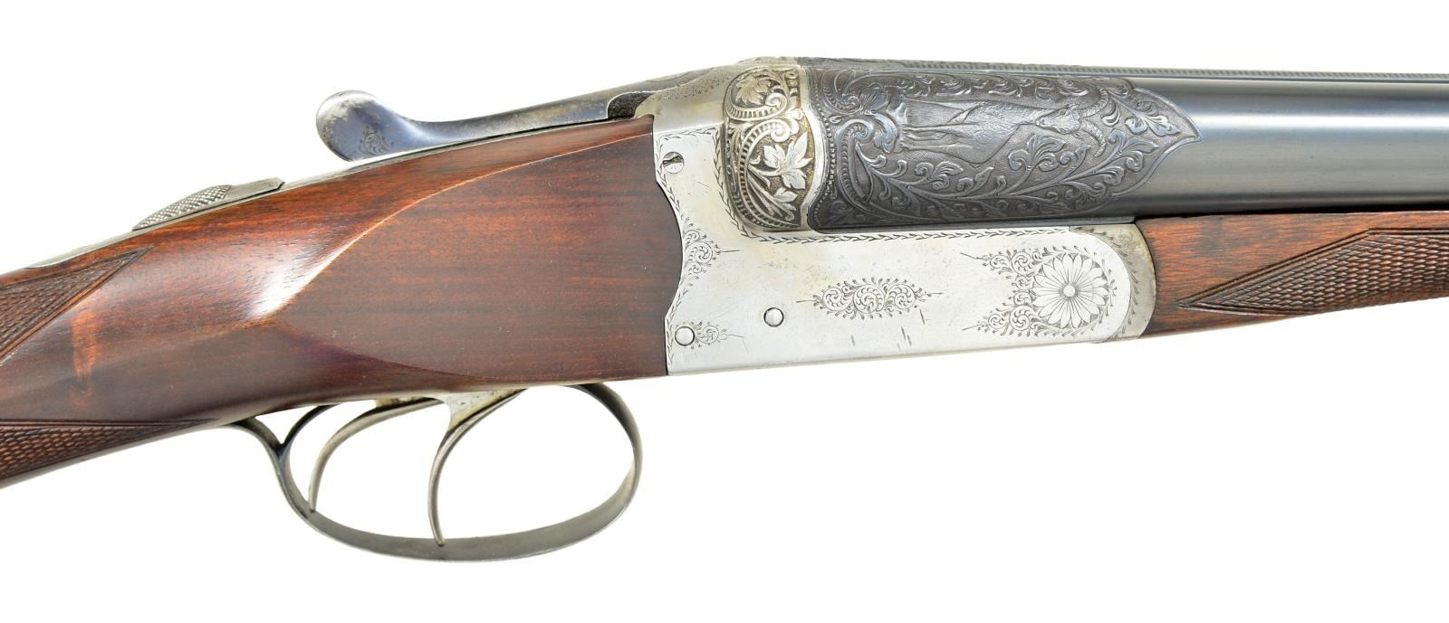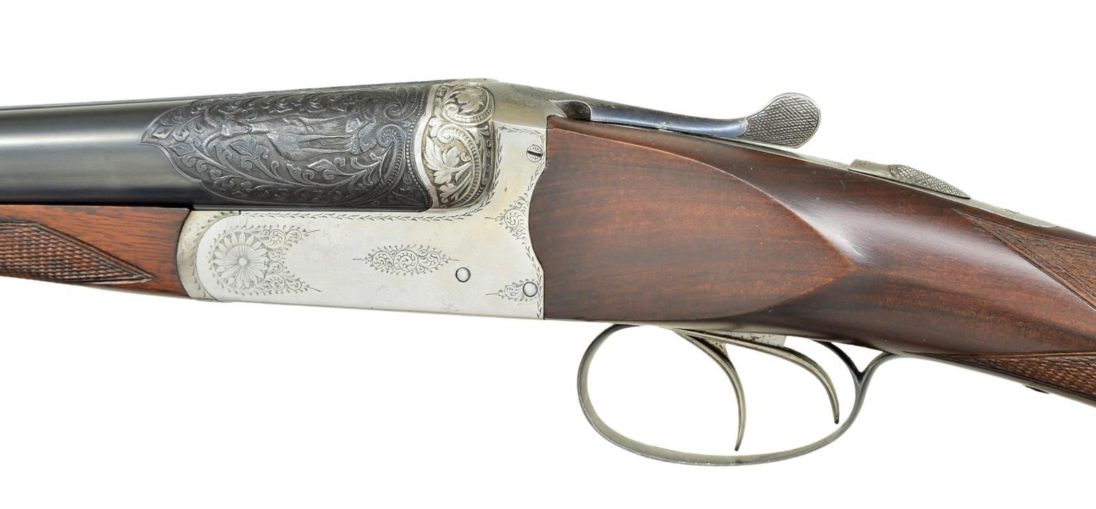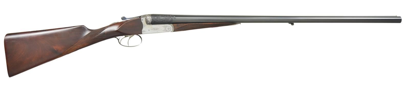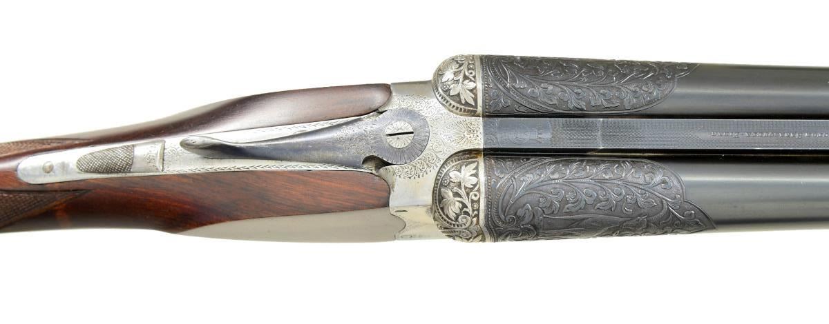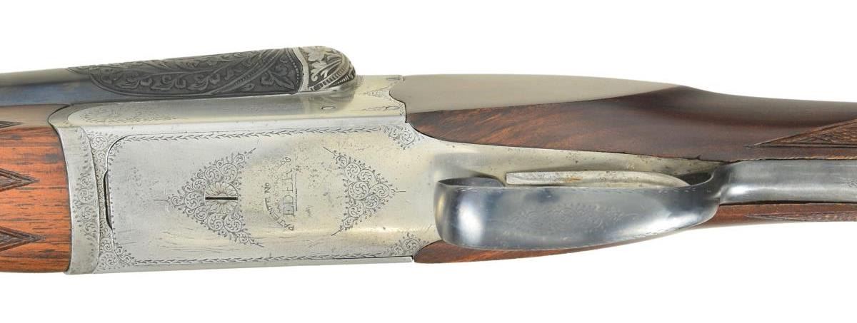 BOXLOCK GAME GUN WITH DEEP RELIEF ENGRAVED 12 GA. BBLS. & EXTRA 20 GA. BBLS. Cal. 12 Ga., 2 1/2" / 20 Ga., 2 3/4". S# 13957. 27 3/8" Dovetailed 12 ga. bbls. are marked with maker's name and crowned logo on matted game rib. Rear portions of bbls. are relief engraved for the first 2 1/2" with large arched acanthus surrounding scenes of standing ibex. Bbl. flats are stamped with pre 1927 Spanish Nitro proofs. A sling loop is soldered to bottom rib. The 31 5/8" 20 ga. bbls. with maker's name and logo marked on rib, have heavy 12 ga. size, 5 1/2" breech section, bbl. flats are stamped with 1927 Spanish proofs for 20 ga. 2 3/4". Coin finished boxlock action features automatic safety, hidden third fastener, sideclips, vented strikers and double triggers. Action is engraved with sprays of scroll. Triggerplate is stamped "Patent No. 46255" "EDER". Fences are deep relief carved with acanthus and scroll. Trigger guard with scroll on bow is marked "MD 214D" on tang. Newly made straight grip buttstock of relatively plain European walnut measures 14 1/4" over checkered wood butt. Point pattern checkering is on semi diamond hand. Each bbl. set has its own matching splinter forend with Anson release. MEASUREMENTS: 12 GA. BBLS: Bore Diameter: R .734", L .731". Restriction: R .019" (MOD), L .030" (FULL). Min. Wall Thickness: R .021", L .030". 20 GA. BBLS: Bore Diameter: R .619", L .619". Restriction: R .020" (MOD), L .020" (MOD). Min. Wall Thickness: R .031", L .029". STOCK WITH 12 GA. BBLS.: DAH: 2 3/8". DAC: 1 1/4". LOP: 14 1/4". CAST: approx. 1/4" off. WEIGHT WITH 12 GA: 6 lb. 14 oz. WEIGHT WITH 20 GA.: 7 lb. 10 oz. UNATTACHED ACCESSORIES: extra bbl. set. CONDITION: very good as refurbished, both bbl. sets retaining nearly all reblack. Action cleaned to coinfinish. Engraving slightly softened. Newly made buttstock retains nearly all of its original finish with a few minor marks. Checkering remains sharp. Original wood of forends has been refinished to match. Checkering recut. 20 ga. bbls. are bright and shiny. 12 ga. bbls. with very minor light dent about 13" from muzzle in right bbl. Action is tight. Bbls. are on face. (22-4526/MGM). CURIO. $1,000-1,500.