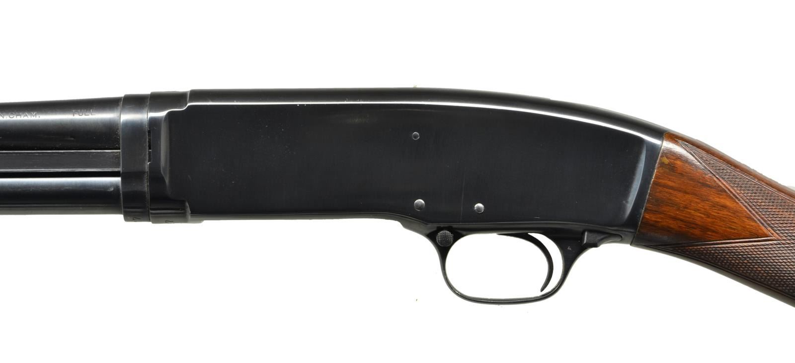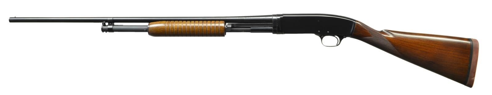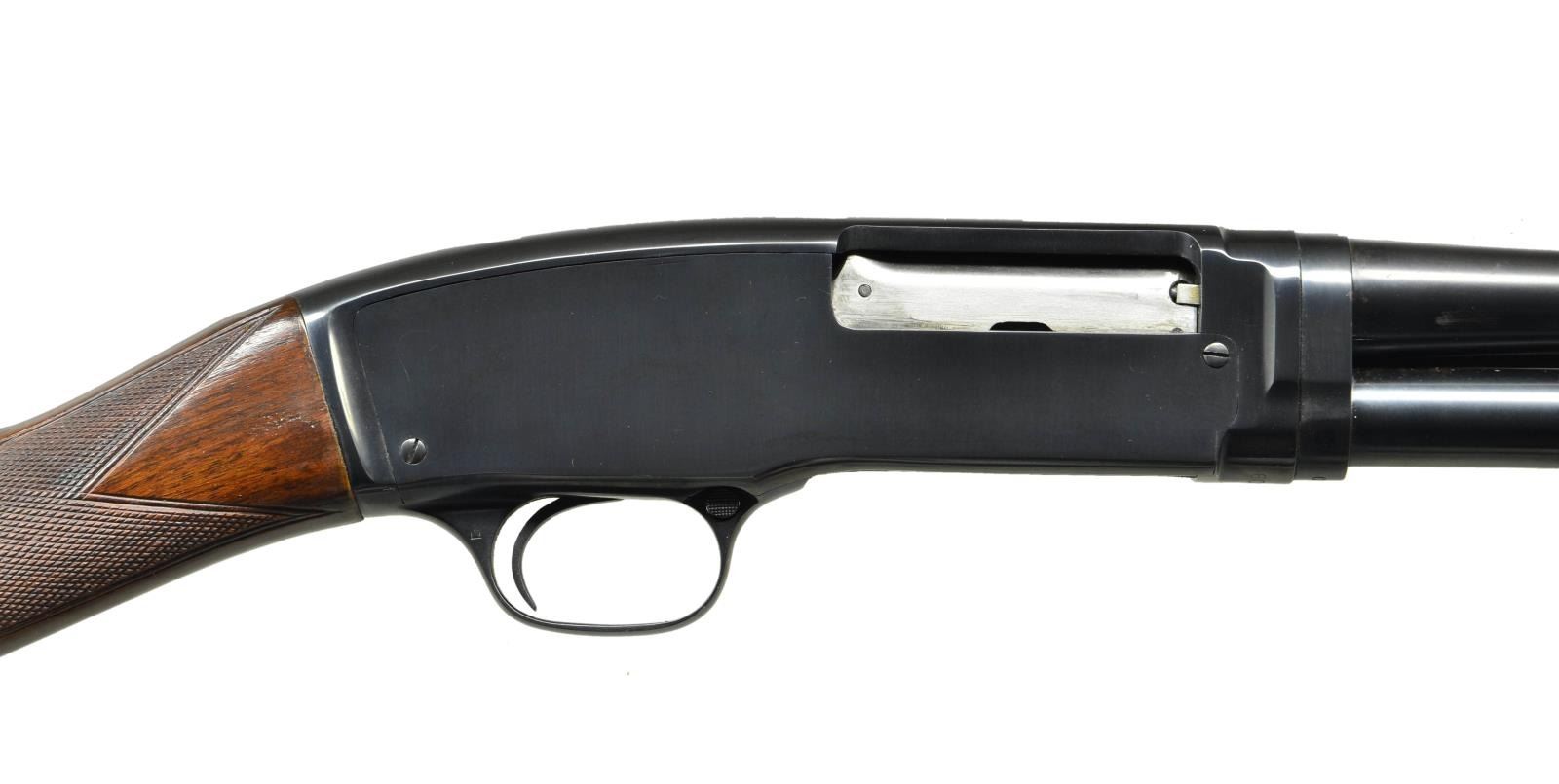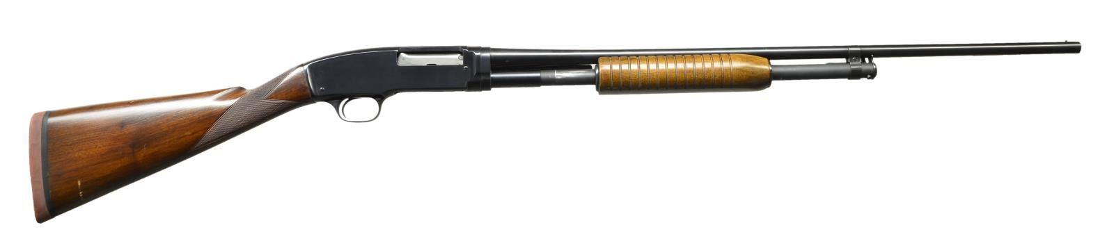 Cal. 410, 3". S# 60147. Bbl. 26" plain with fixed full choke. Flat bottom grooved field forend. Straight grip skeet style stock with factory hand checkering. LOP. 13 1/8" over and added solid red Winchester pad. 1947 mfg. CONDITION: over 97% original blue showing slide wear. Wood has good original finish showing a few handling marks. Very good bright bore. (21-4154/DS). CURIO. $1,000-1,500.