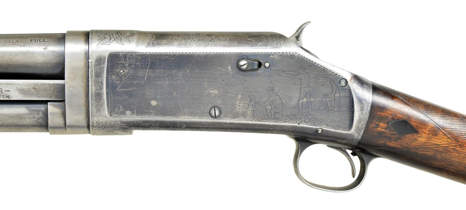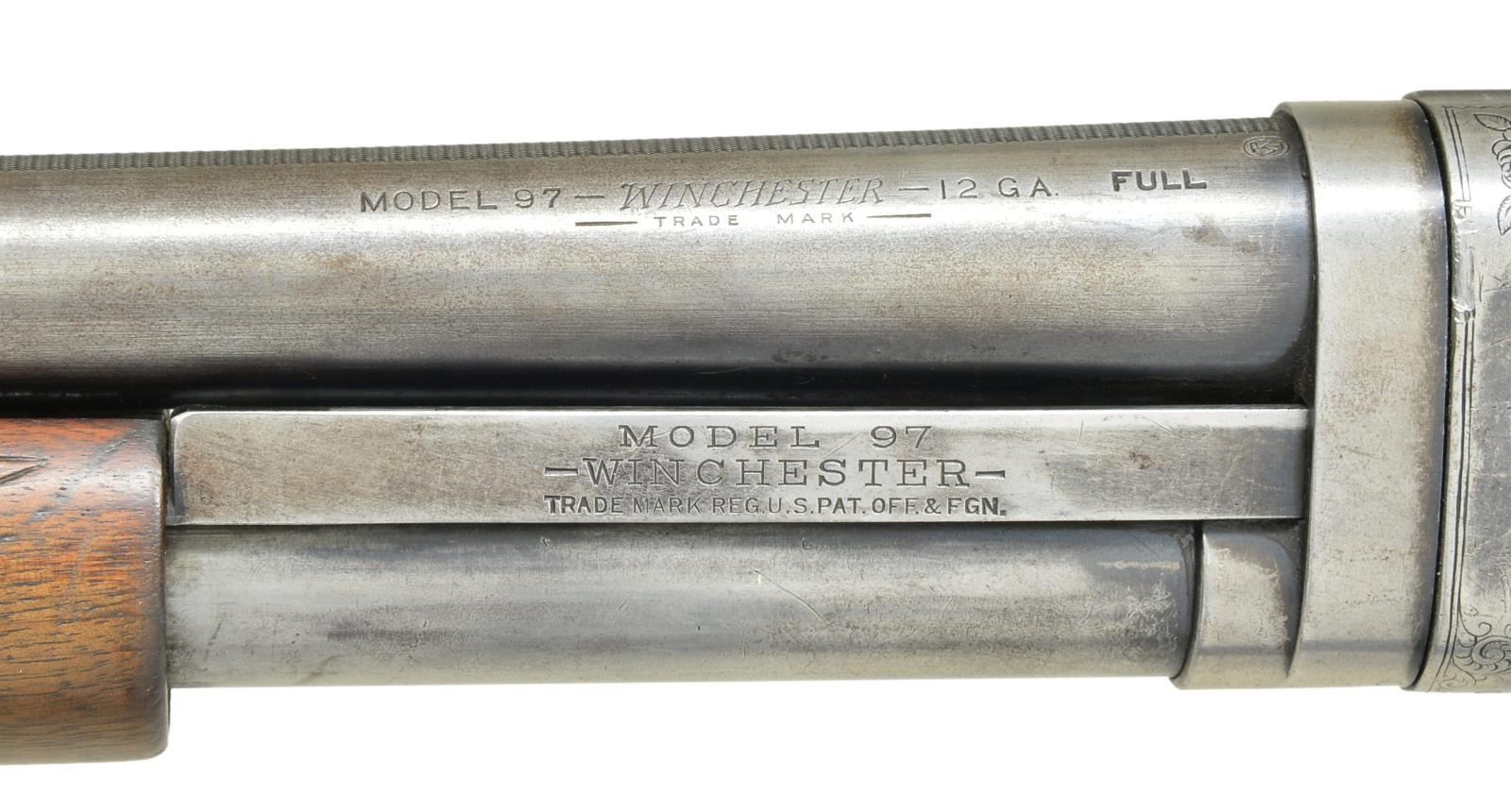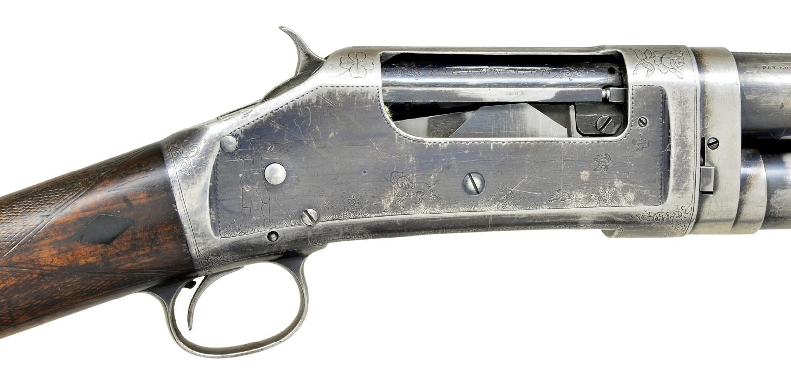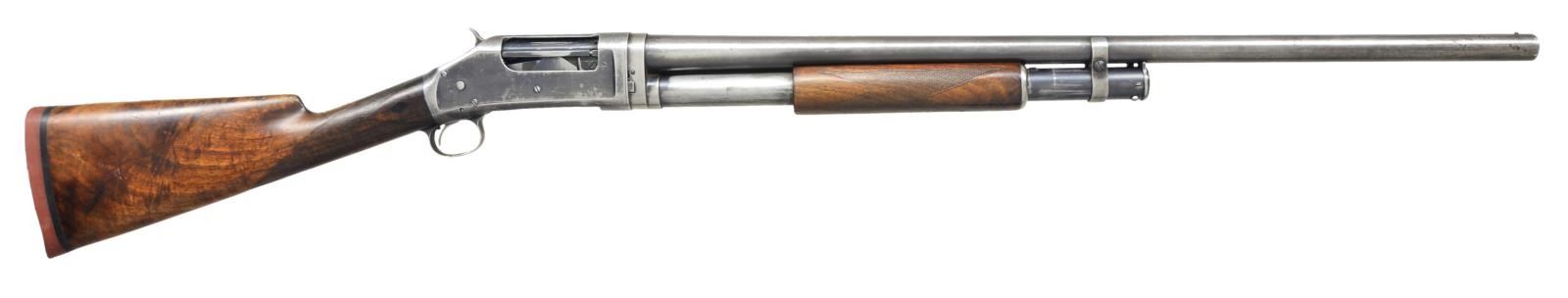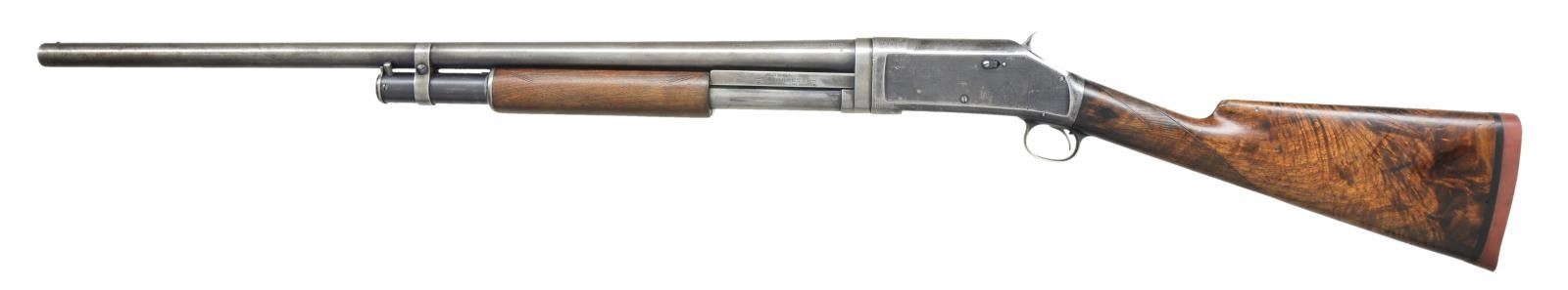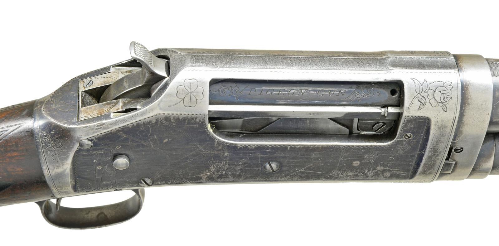 Cal. 12 ga. S# 291990. Bbl. 28" w/ matted top that extends over receiver. Full choke & steel bead. Factory engraved action has trap shooting scene on left side. Right side has hunter & dog w/ falling bird scene. Both sides of receiver top have 4 leaf clover & rose engraving. Complementing scroll continues to lower receiver areas & trigger guard bow. Breech block is marked "PIGEON GUN". Small round slide handle & straight grip stock of fancy walnut w/ Pigeon grade wrap around checkering having black diamond inlays at wrist. LOP: shortened to 13-5/8" over reproduction solid red Winchester pad. Mfg. 1905. CONDITION. Over 25% dull faded original blue shows scratches & handling marks. Wood has worn finish & checkering showing numerous scratches & marks. Sound action. 1 notch on adjustment ring is taken up. Very good bright bore. (21-2410/DS). CURIO. $ 2,500-4,000.