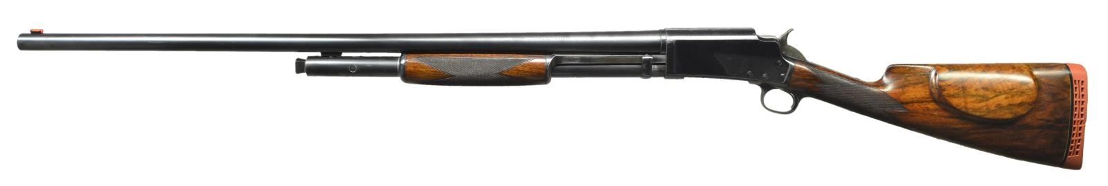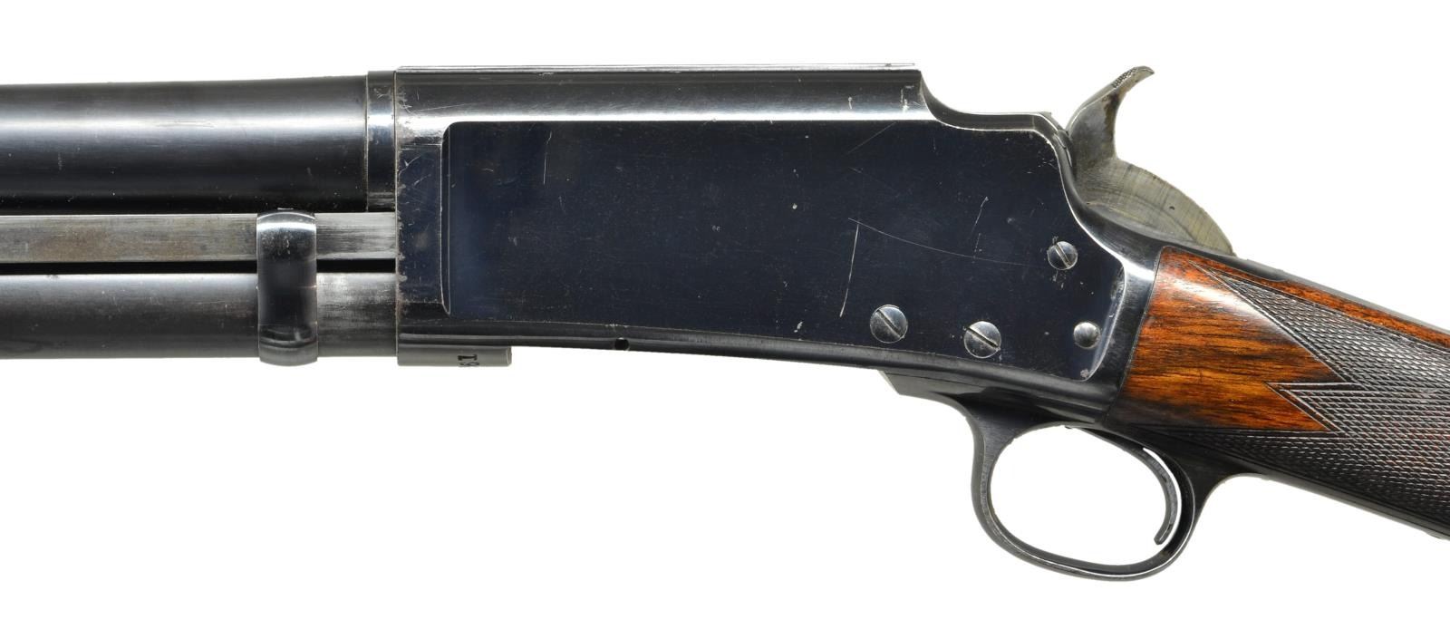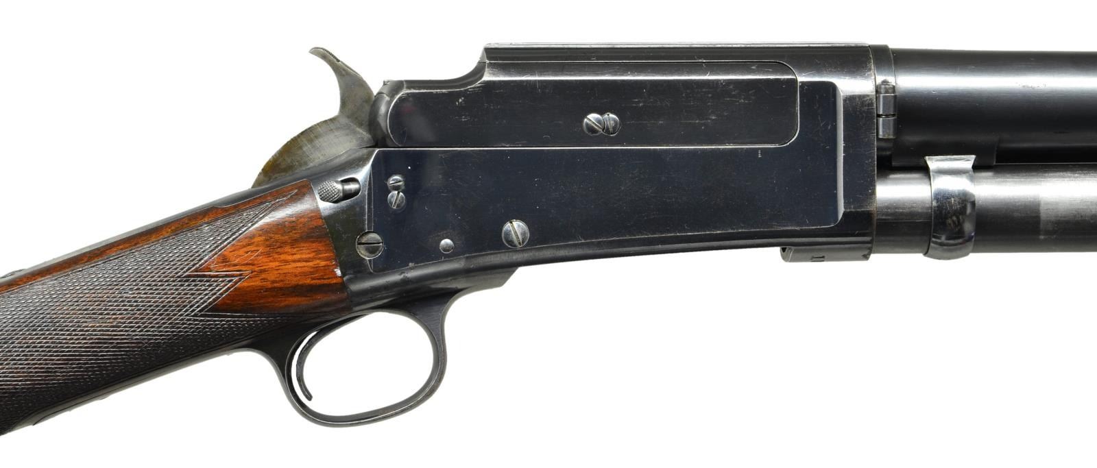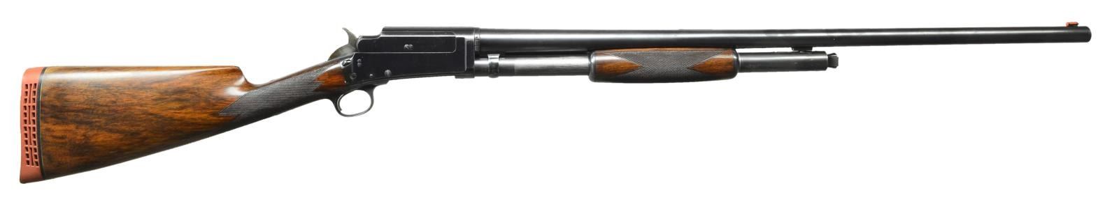 Cal. 12 Ga. S# 106961. Bbl. 30" plain with fixed full choke. Exposed hammer takedown action. Top tang is marked “Marlin Trap Gun”. Small round forearm and straight grip cheek piece stock of fancy thin shell walnut with point pattern hand checkering. LOP: 14” over an old “Field Trial” red ventilated pad. As produced 1909-1913 the Trap Gun stands alone as the only Marlin shotgun that did not have a numeric model designation. CONDITION: fine. Over 90% original blue showing slide and carry wear with small marks. Original wood finish shows scattered scratches and marks. Sound action. Replacement Raybar front sight. Very good bright bore. PROVENANCE: Estate collection of Thomas F. Wolfinger. (22-6100/DS). CURIO. $800-1200.