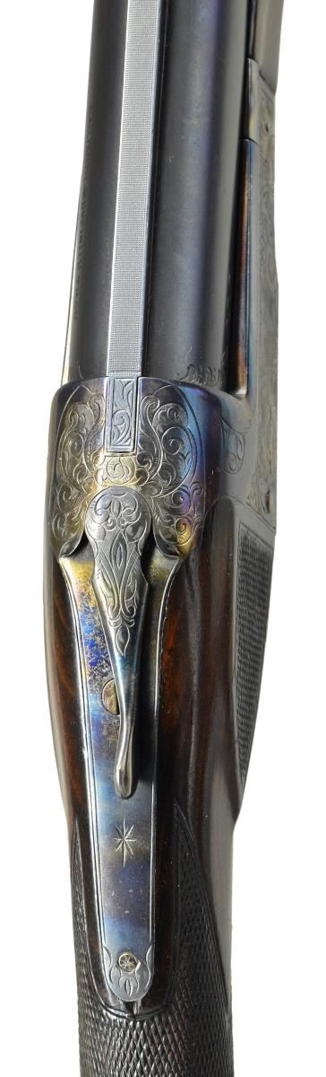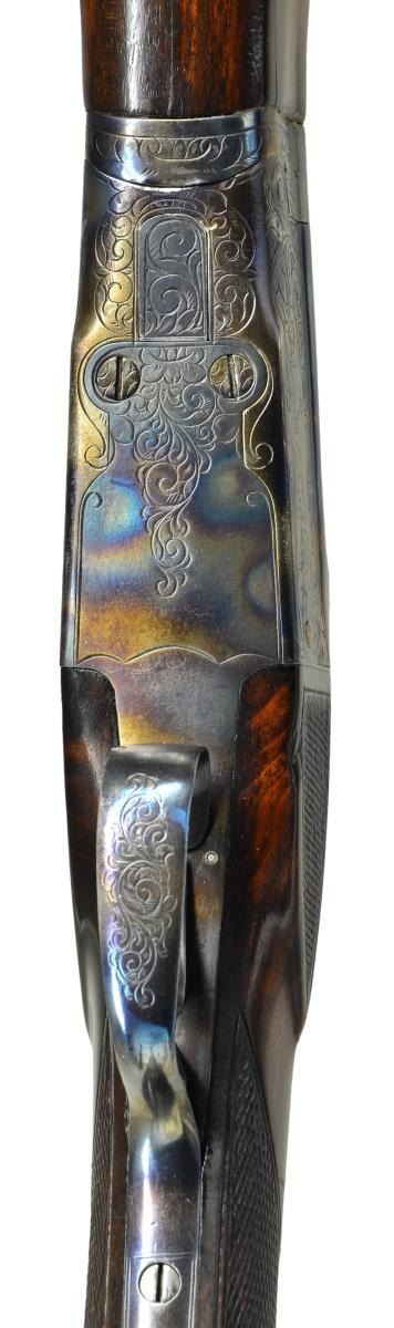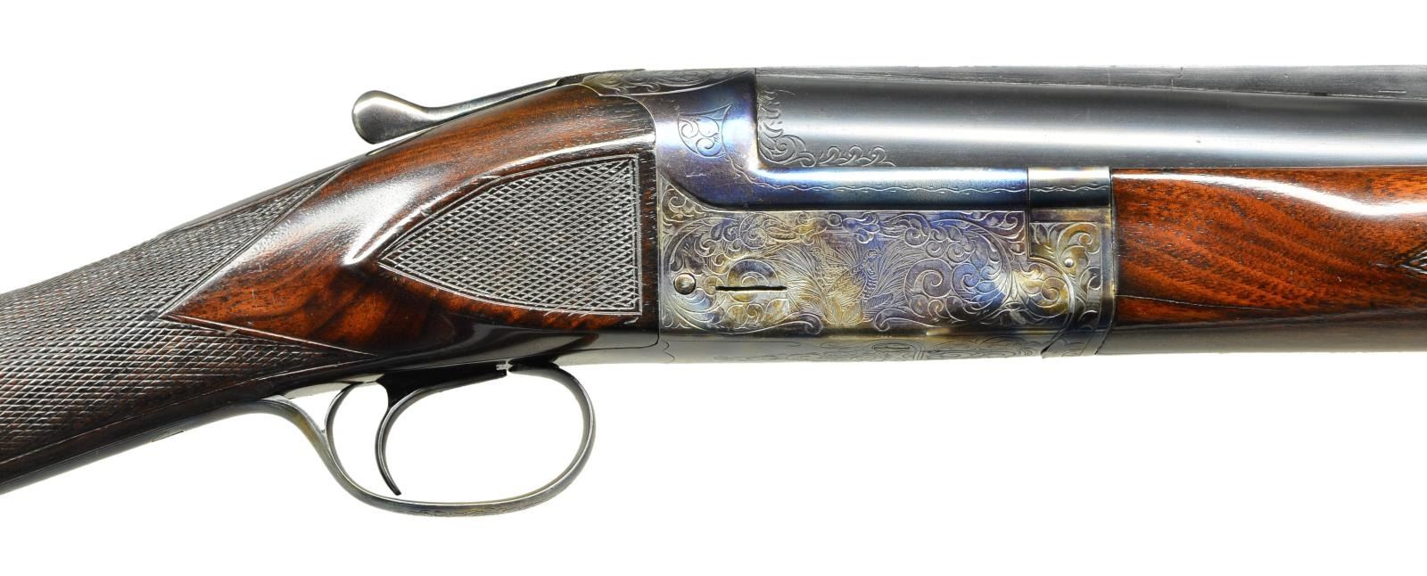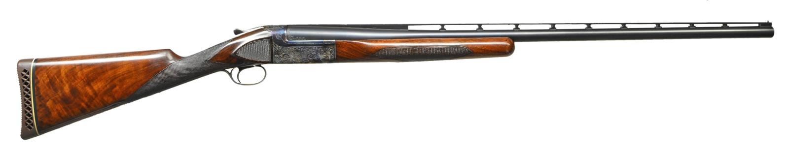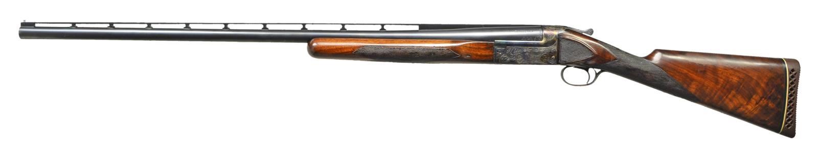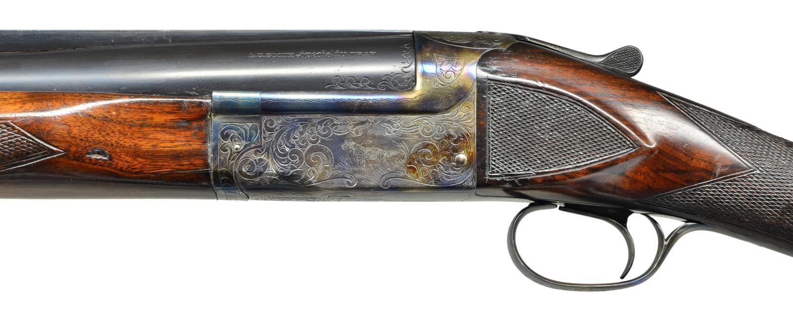 SHOTGUN. Cal. 12 Ga., 2 3/4". S# S12730. The 32" barrel with narrow matted ventilated rib holding steel front and white mid bead is marked "L.C. SMITH Specialty TRAP" on top left. There is some scroll engraving on breech end. Boxlock type action is engraved with 80% coverage, large simple scroll surrounding game scenes on sides; pointing setter on left and two quail hiding in grass on right. Straight grip buttstock of dense lightly crotch figured American walnut measures 14 1/8" over ribbed Pachmayr trap pad. Side panels are checkered and point pattern checkering is at grip. Matching target forend has "J" spring release with knurled button secondary release in guitar shaped escutcheon. MEASUREMENTS: BBL: Bore Diameter: .744". Restriction: .042". Wall thickness: .030". STOCK: DAH: 2". DAC: 1 7/16". CAST: neutral. LOP: 14 1/8". WEIGHT: 8 lb. 5 oz. CONDITION: good as refinished. Barrel retaining nearly all of a rust reblue. Action retaining nearly all torched colors over bright repolish. Stocks retain most of an old oil refinish worn through at comb. Checkering considerably worn and dirty. Shiny bore. Ejector does not fire. (23-17/MGM). CURIO. $800-1,400.