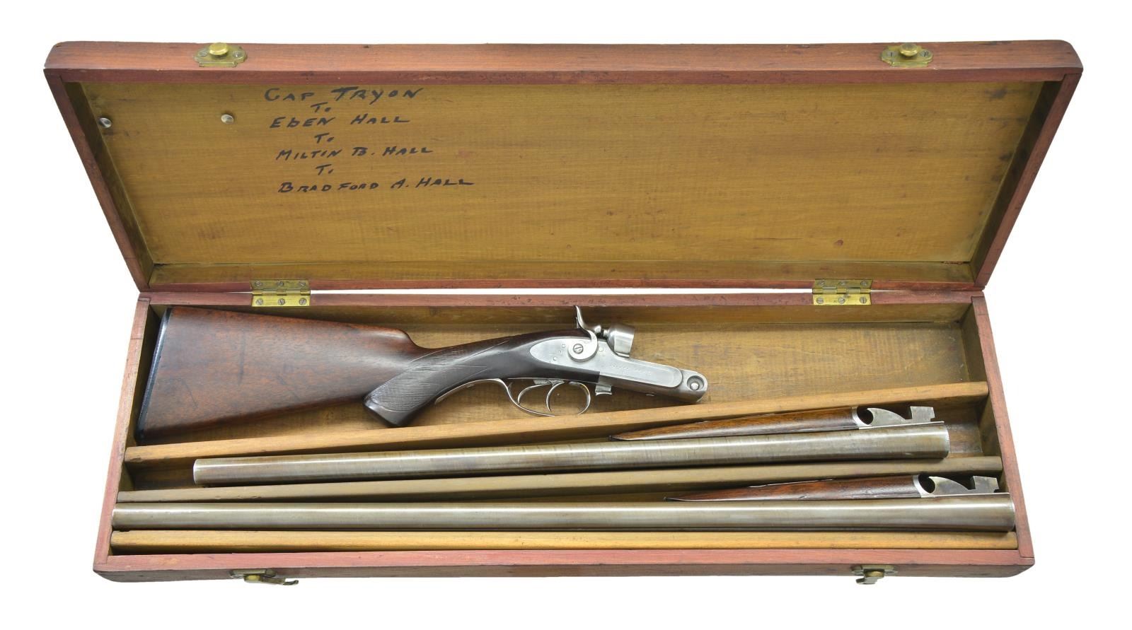 Cal. 12 Ga., 2 5/8". S# 11002. Barrel #1 - 28" of damascus steel. CHOKE CONSTRICTION: right - .005, left - .004. Barrel #2 - plain twist shortened to 24". Plain grade Lifter action is unengraved. Lockplates are marked "PARKER BROS". Double triggers. Extractors. Both barrels have individual splinter forearms. Hard rubber capped pistol grip walnut stock. LOP: 13 1/4" over a replacement buttplate. Stock and forearms were hand checkered. S# indicates production 1877-1879. UNATTACHED ACCESSORIES: shooter made wood box with brass hook latches. Inside of lid has black marker written "Cap Tryon / To / Eben Hall / To / Milton B. Hall. / To / Bradford A. Hall". CONDITION: action has a bright cleaned appearance showing some light pitting. Barrel #1 has gray coloration from touch up finish. Bores are pitted. Left barrel has a small dent 13 3/4" from muzzle. Barrel #2 has gray coloration from touch up finish and has evidence of resoldered lower rib. Bores shows spots of light pitting. Left barrel is dented 11 1/2" from muzzle. Sanded and refinished wood has weakened checkering with oil darkening showing scratches and marks. (01-23146/DS). ANTIQUE. $700-1,000.