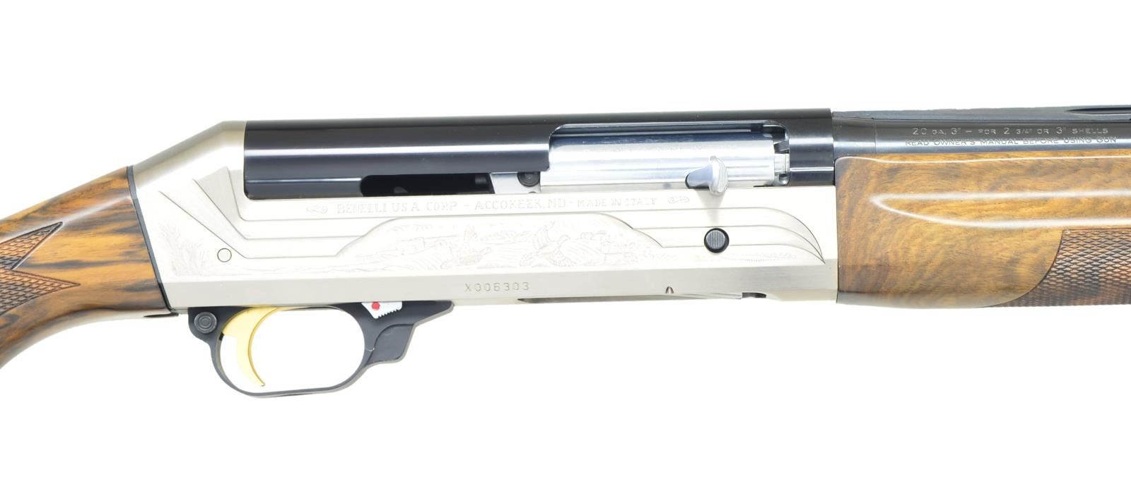 Cal. 20 Ga 2 3/4" & 3". S# X006303. Bbl. 26” vent rib w/ red fiber optic front sight w/ steel mid bead. Interchangeable chokes, full set of five tubes included. Inertia operated. Nickel finished alloy lower action w/ game scene ornamentation. Gold finished trigger. Satin finished forearm & pistol grip stock of select AA grade walnut w/ cut checkering. LOP: 14 1/4” over original thin black pad. WEIGHT: 5 lbs, 14.6 ozs. Introduced in 1999 to commemorate 30 years of Benelli shotgun mfg. Discontinued 2015. UNATTACHED ACCESSORIES: gray molded case containing spare chokes, choke wrench, stock shims, Benelli lubricant, registration card & owner’s manual. CONDITION: near excellent showing only minor handling marks. Bright near excellent bore. (22-5930/DS). MODERN. $1,500-2,250.