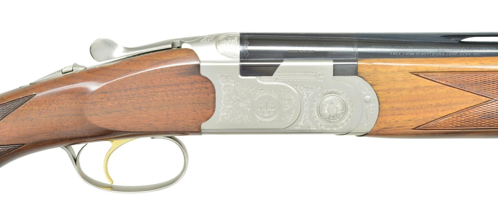 Cal. 28 Ga., 2 3/4". S# L87292B. Bbl. 26" vent rib with MobilChokes, Mod & Full tubes included. Satin nickel finished boxlock action has scroll ornamentation. Gold plated SST. Ejectors. Schnabel tipped forend and pistol grip stock of satin finished walnut have cut checkering. LOP: 14 1/2" over original thin black Beretta pad. UNATTACHED ACCESSORIES: original blue box w/ matching S# label. Box contains instructions, warranty papers & hang tag. CONDITION: over 98% metal finish. Stock has series of small dents on toeline. Near Excellent bore. (22-5939/DS). MODERN. $1,500-2,250.