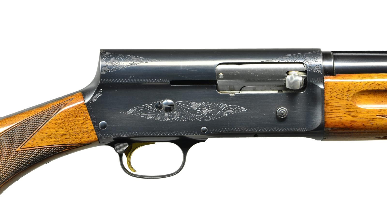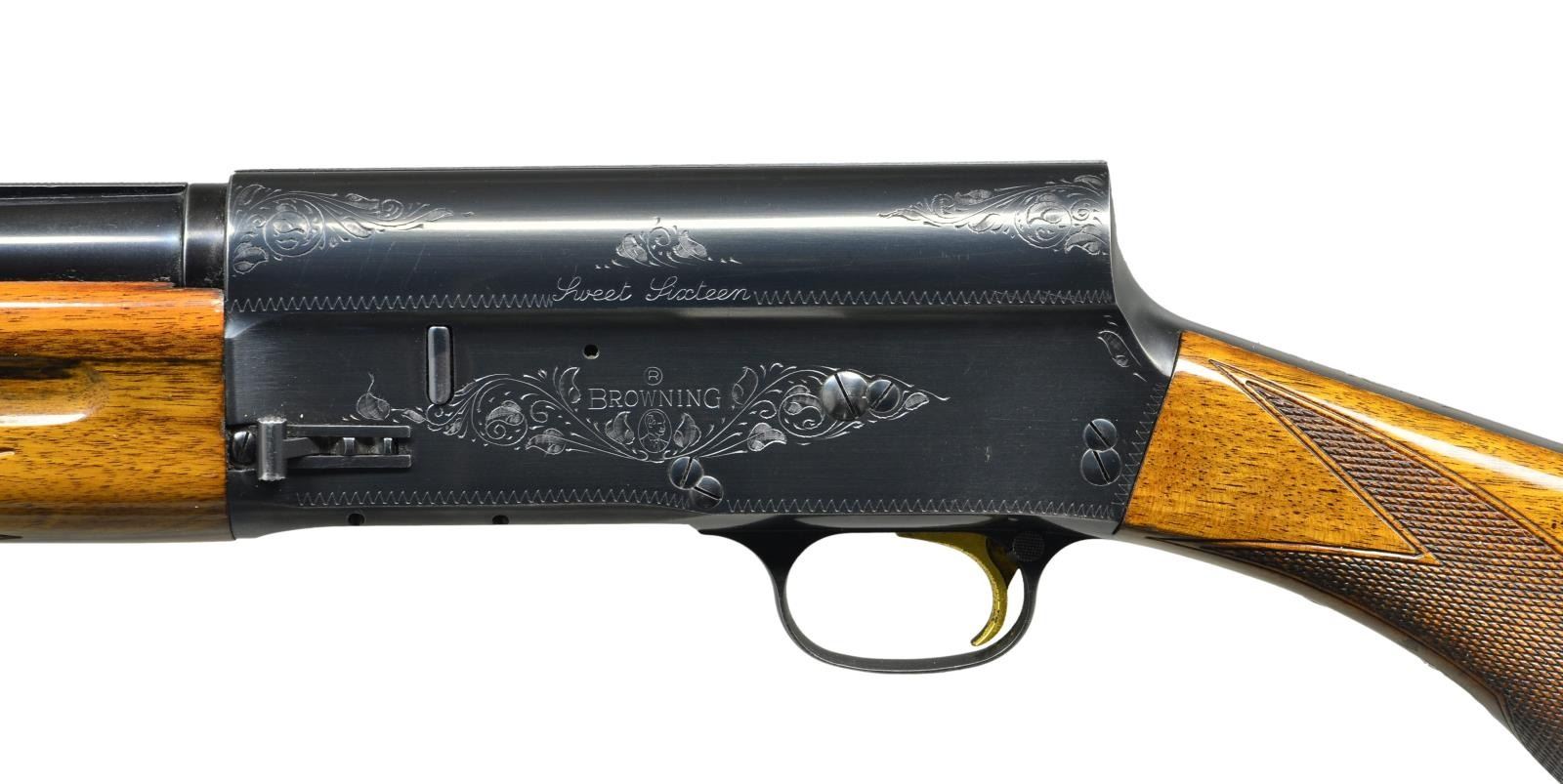 Cal. 16 ga. 2 3/4". S# 5S34277. Bbl. 25 1/2" vent rib with fixed IC choke. Recoil operated square stern action has grade 1 engraving. Left side is marked "Sweet Sixteen". Gold finished trigger. Finger groove forend and round knob stock of gloss finished checkered walnut with original buttplate. 1965 Belgian mfg. CONDITION: Over 95% original blue showing edge wear with carry wear on action tangs. Original wood finish shows a few small marks. Very good bright bore. (22-5922/DS). CURIO. $1500-2000.