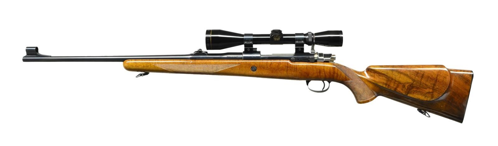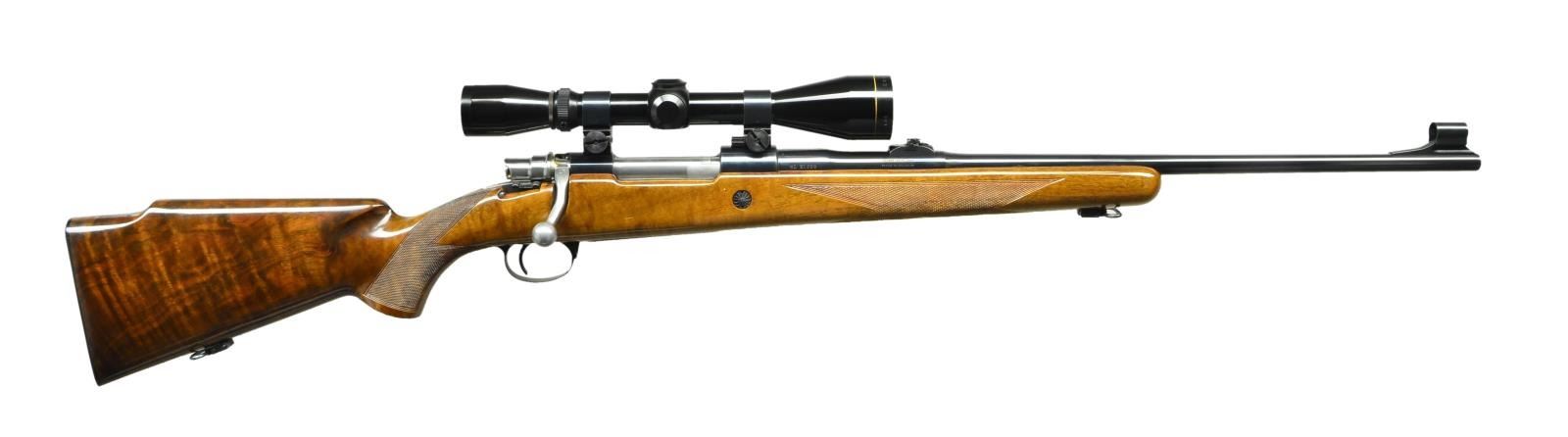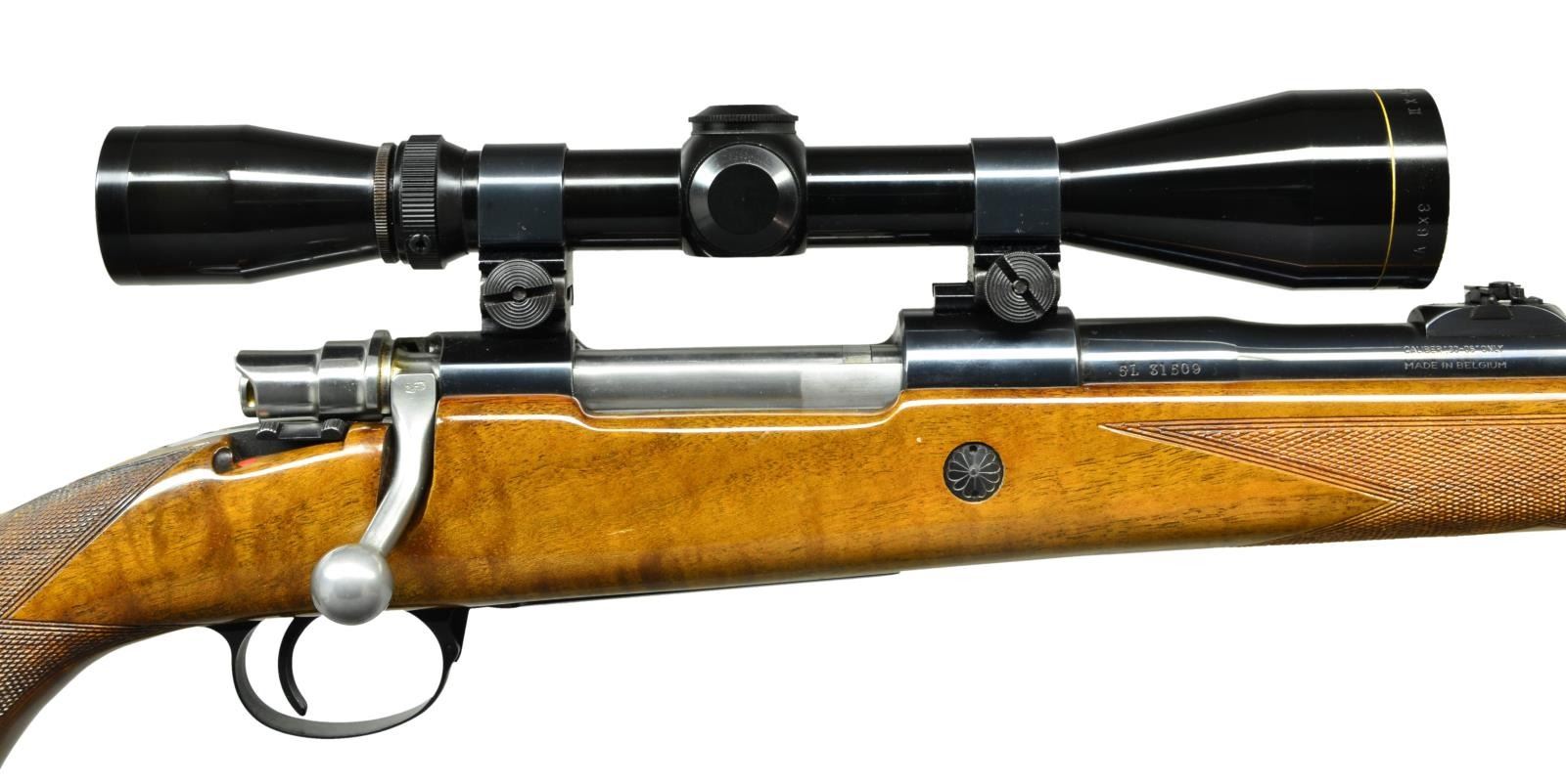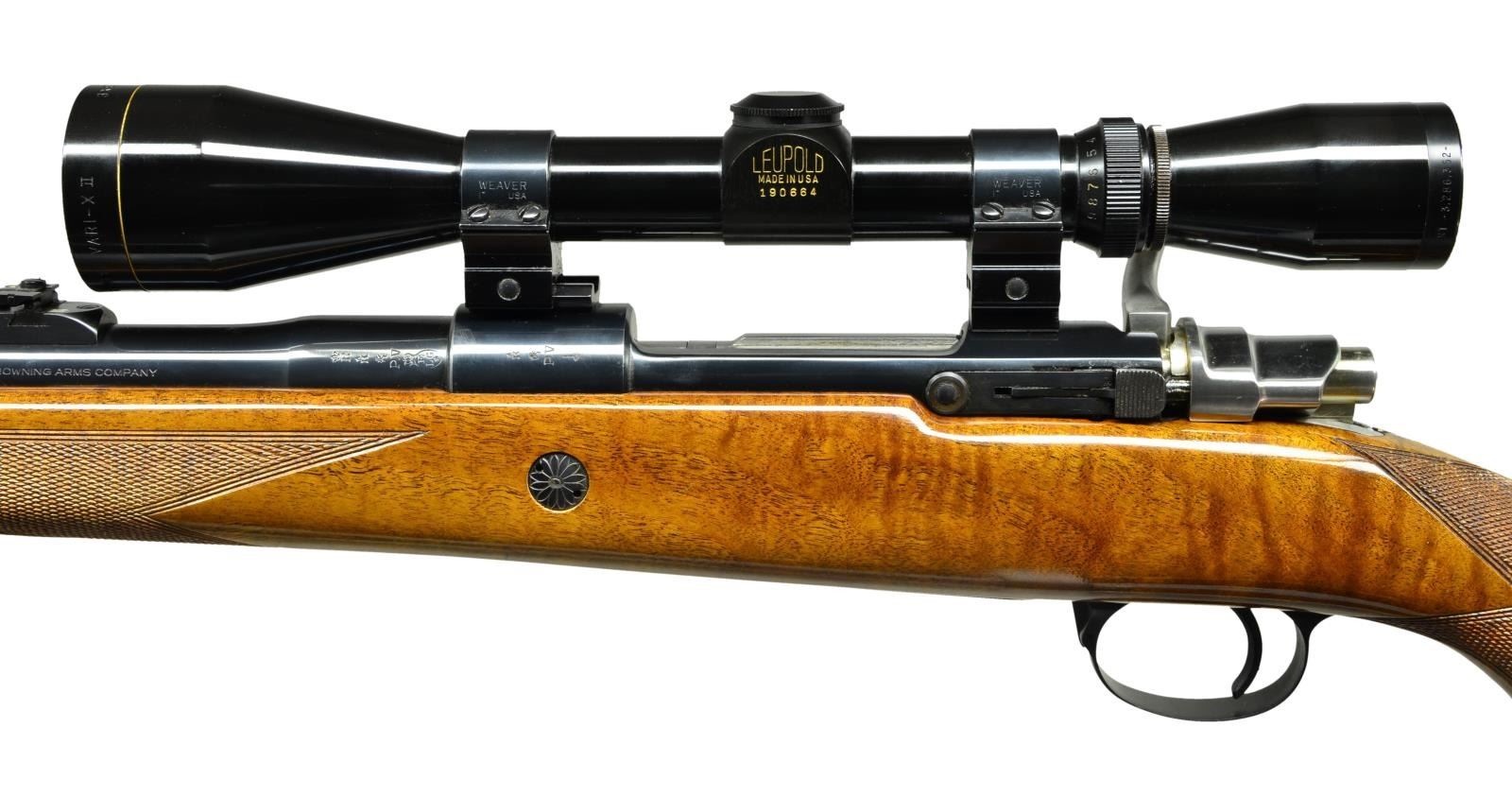 ACTION RIFLE. Cal. 30-06. S# 5L31509 (1965). Bbl. 22" w/ hooded ramp bead front & flip up rear sights. Leupold 3x9 VARI-X II scope w/ duplex reticle on Weaver 1" rings & bases. Long Mauser type action w/ claw extractor. Floorplate & triggerguard bow have light gold colored scroll. Monte Carlo Sporter pistol grip stock w/ checkering, sling swivels, roll over cheekpiece & Browning buttplate. UNATTACHED ACCESSORIES: Browning black envelope containing manual & filler screws. CONDITION: near excellent metal finish w/ occasional scratches. Near excellent wood finish w/ a few gouges that pierce the varnish & light scratches. While bolt face shows little use w/ bore being near excellent & shiny, there is light pitting on lands. Scope has near excellent finish & clear optics being somewhat obstructed by front sight. (23-799/MD). CURIO. $900-1,200.