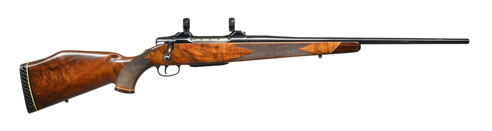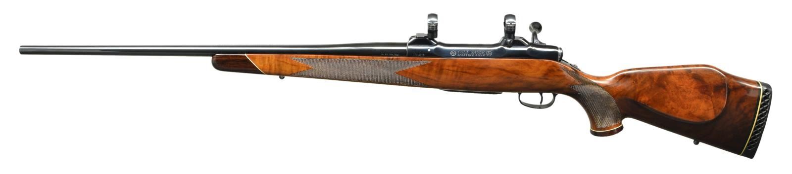 Cal. 300 Win. Mag. S# CR15012. Bbl. 24" w/ out provision for sights. Mfg. 1977 (1974-1985) by J. P. Sauer in Germany for Colt. Checkered walnut stock w/ cut checkering, Monte Carlo cheekpiece having pronounced forward slant to mitigate recoil, sling studs, Colt black ventilated recoil pad w/ white line spacer plus rosewood grip cap (has rampant Colt insert) & forend both having white line spacers. Very sleek modern stylized action having velvety smooth matching numbered bolt w/ minimal lift angle & unique cam locking. Tang safety, spring loaded mag. removal plus Leupold sculptured bases & 1" rings (extension front). One of the Cadillacs of production bolt action rifles seldom seen for sale, needing only to add a top quality scope. MAGS: 2 near excellent cal. marked factory 4 rd. UNATTACHED ACCESSORIES: European style sling w/ braided leather & Uncle Mike's detachable swivels. CONDITION: near excellent overall w/ hint of thinning finish at muzzle & from function wear. Couple of very faint stock marks that have to be searched for. Near excellent bore. (23-326/NW). MODERN. $2,000-2,750.