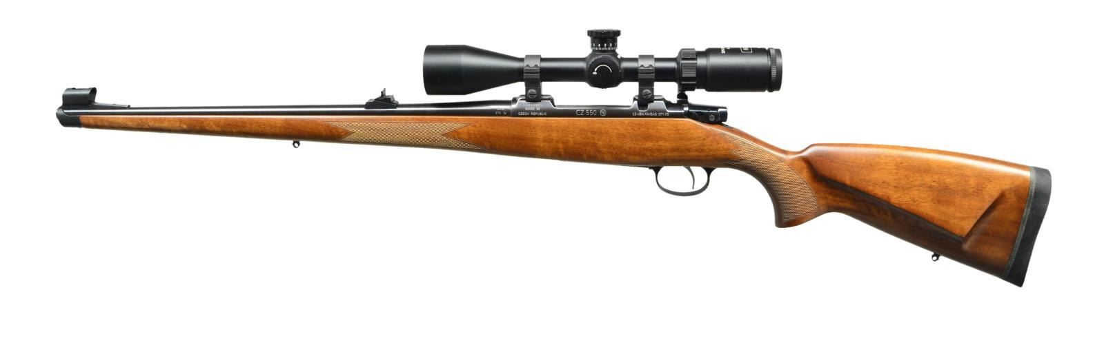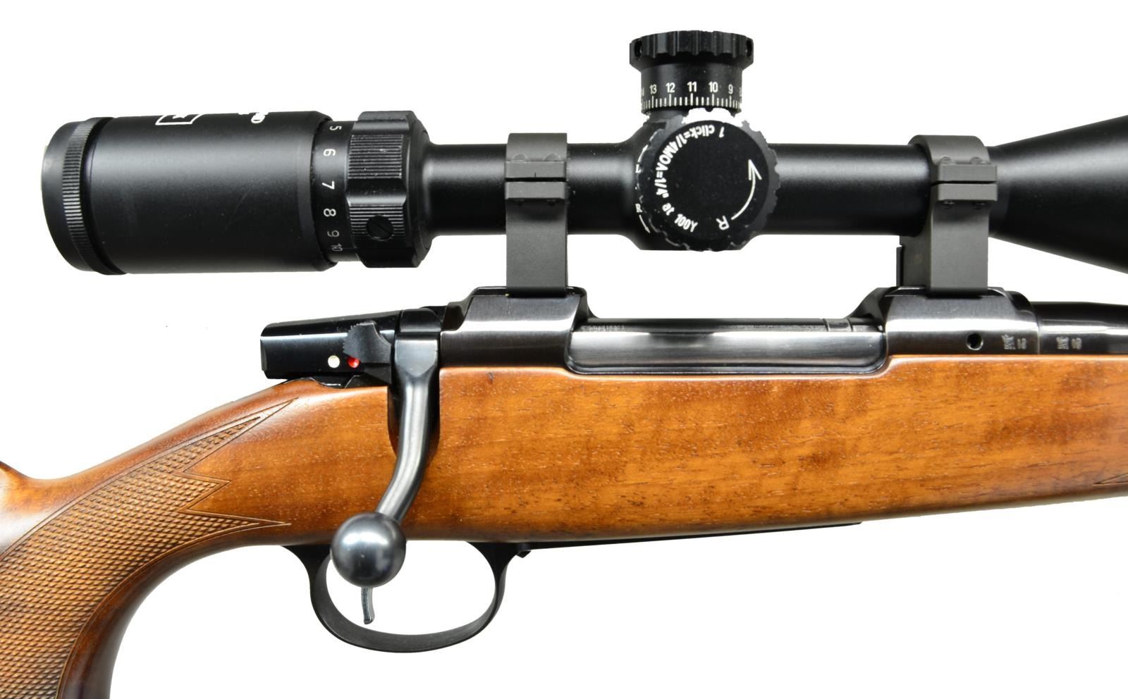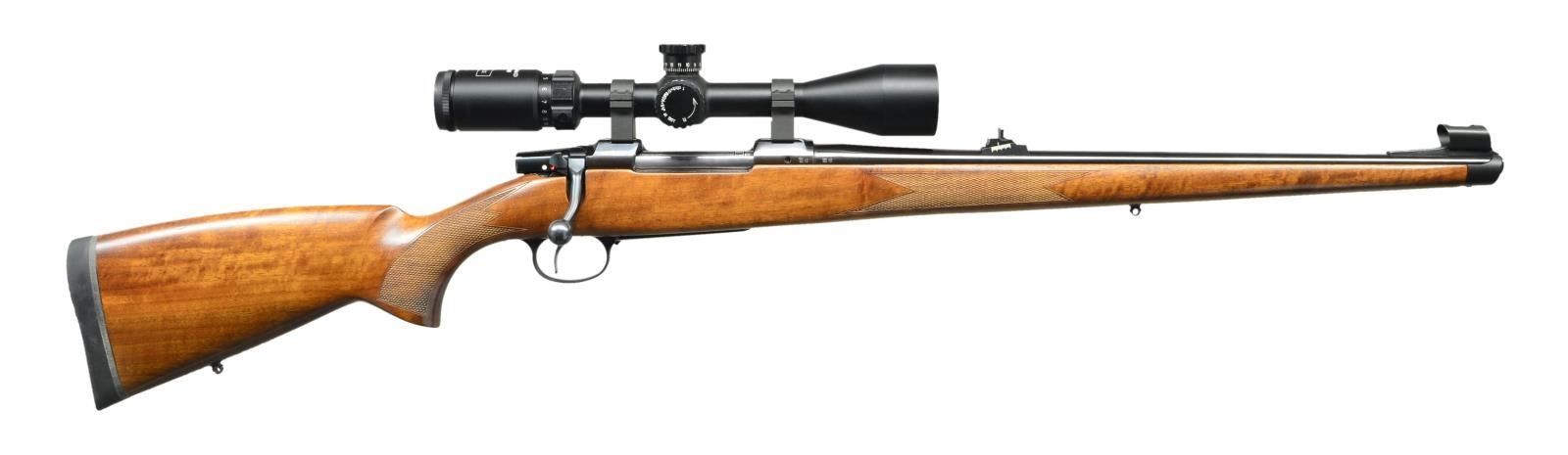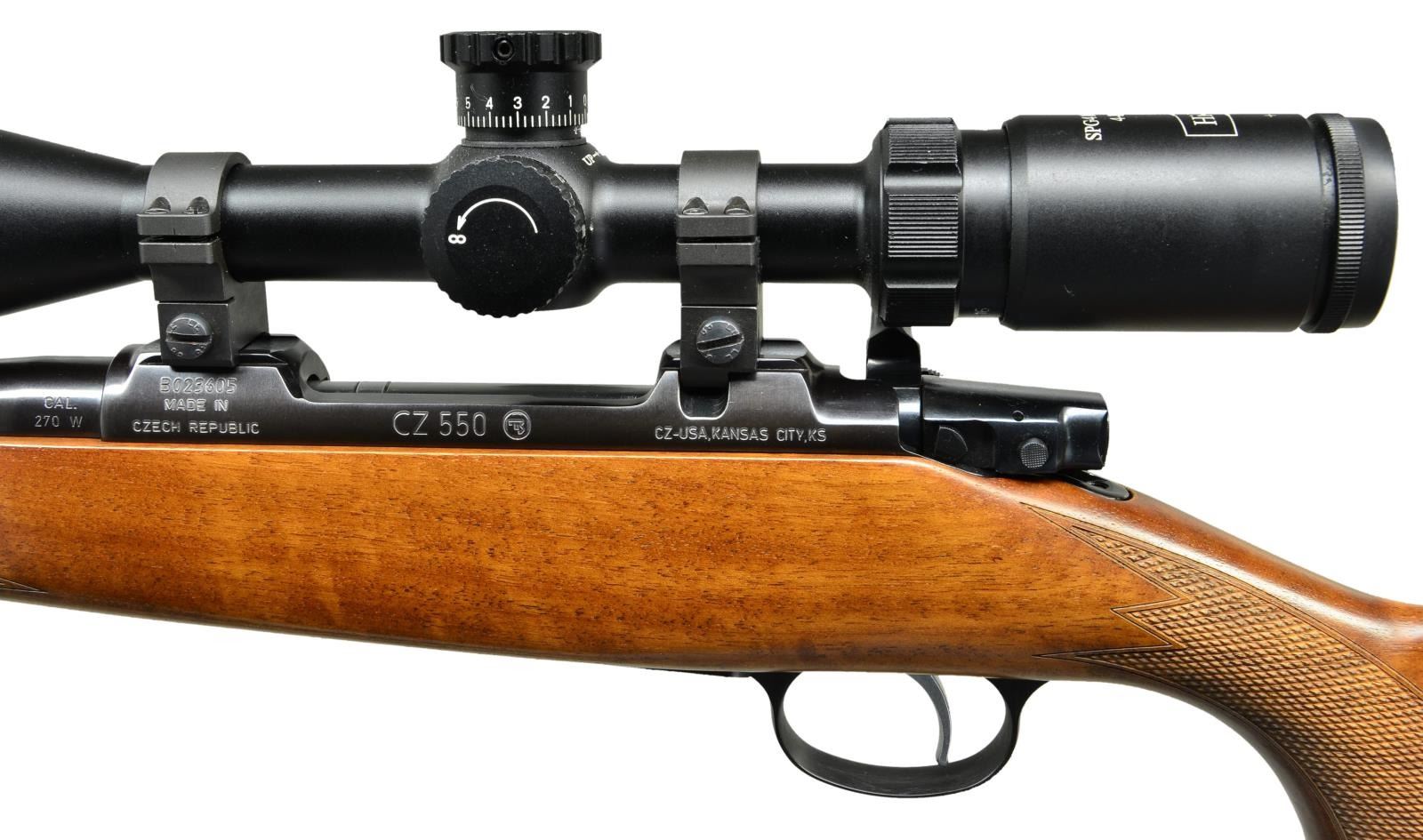 Cal. 270 WIN. S# B023605 (2012). Bbl. 20 1/2". Hooded ramp bead front & Williams style rear sights. Hi-Lux SPG 4-16x44 scope w/ range finding reticle on CZ tip off rings. Checkered Turkish walnut full length stock steel nosecap & CZ black recoil pad. UNATTACHED ACCESSORIES: scope caps. CONDITION: near excellent wood & metal finish w/ the occasional mark or scratch. Near excellent scope finish w/ clear, serviceable optics. Near excellent bore. (23-753/MD). MODERN. $1,000-1,500.