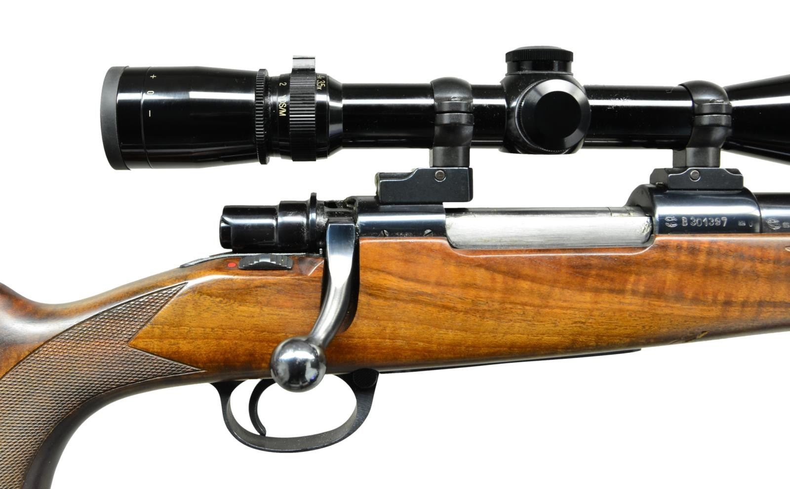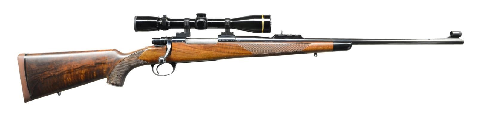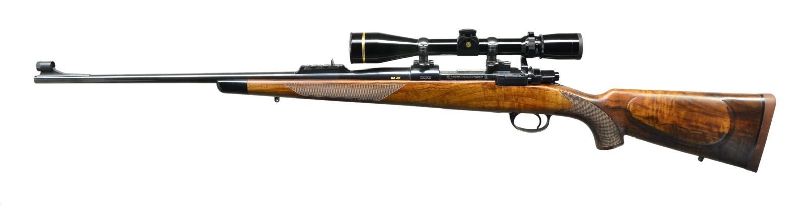 Cal. 308 Win. S# B301397. Bbl. 24" sporter weight w/ hooded ramp bead front sight. Island mounted express rear sight having 1 standing & 2 folding leafs. M98 action w/ claw extractor, right side safety & hinged floorplate. Leupold VX-III 3.5-10x40 gloss finished scope w/ duplex reticle on 2 piece QD mts. & rings. Straight comb sporter stock w/ shadow line cheekpiece of fancy thin shell walnut. Features include black forearm tip, case colored steel grip cap, swivel bases & cut checkering. LOP: 13 7/8" over original Whitworth solid brown pad. CONDITION: over 98% original blue. Stock has good satin finish showing a few sm. dents & marks. Scope has clear optics. Bright near excellent bore. (23-796/DS). MODERN. $700-1,000.
