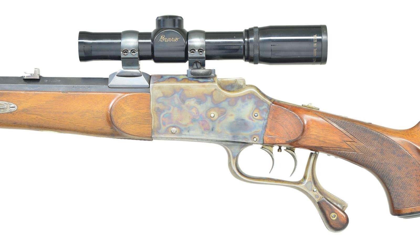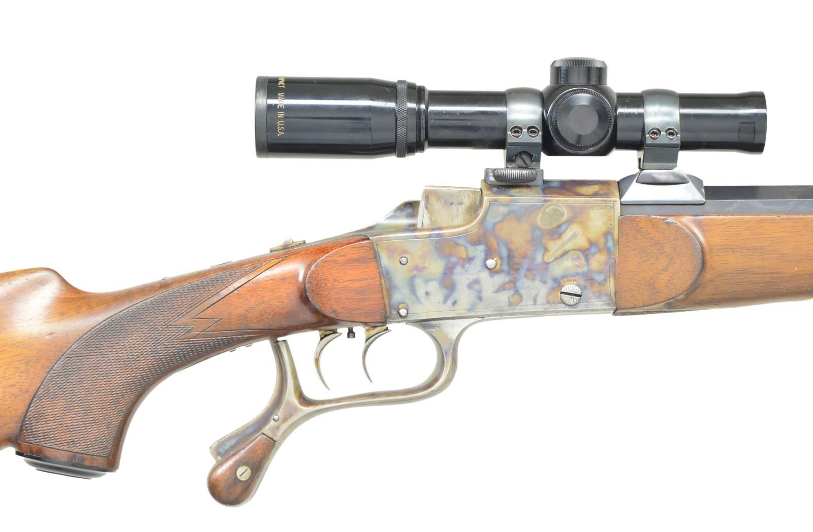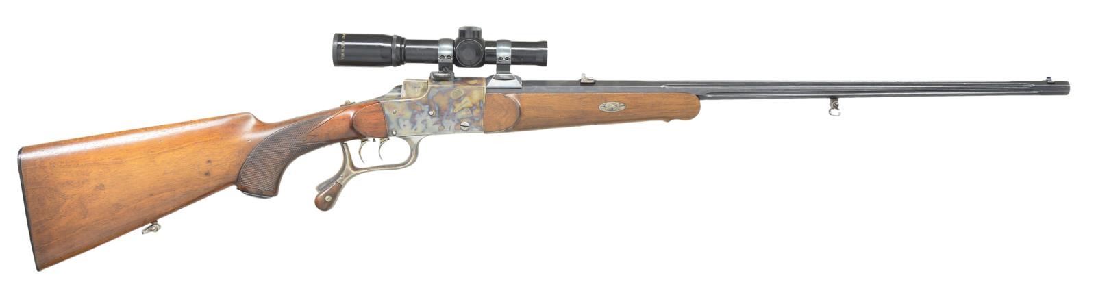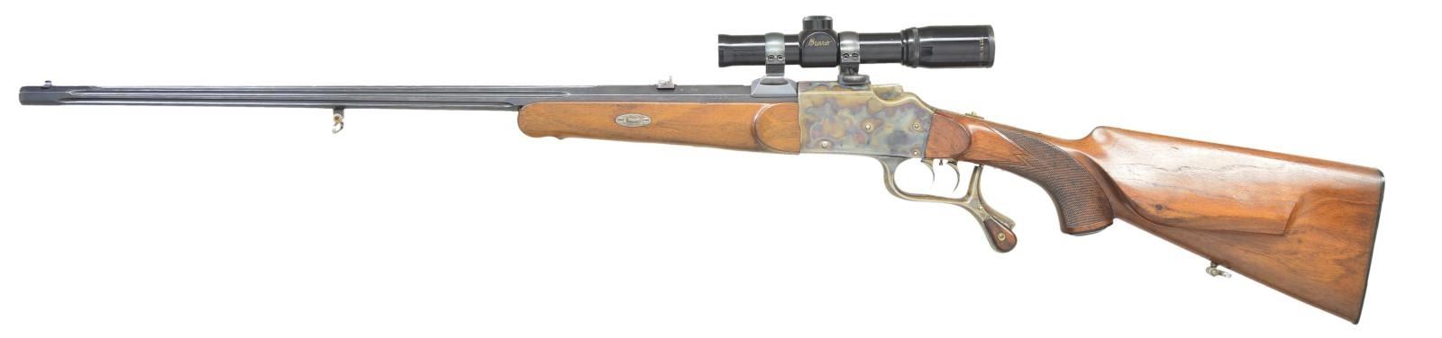 J. G. ANSCHUTZ WITH SCOPE. Cal. 8.15 x 46R. S# 12320. This rifle has 26 1/4" tapered octagon barrel with front portion fluted. Matted top flat holds front claw scope base, one standing one folding rear sight and gold bead front. S# is on left side. Bottom of barrel is stamped with December 1937 German nitro proofs for 8.15 x 46R. A sling loop is on bottom of barrel. Case hardened rotating dropping block single shot action has right side wall lowered to ease loading of cartridges and is line border engraved. Opening lever with catch has two wood panels on knob. Makers mark "JGA" in oval is on left side. Rifle is fitted with double set triggers and tang safety. Pistol grip buttstock of European walnut measures 14" over ribbed horn buttplate and features Bavarian right hand cheekpiece, point pattern grip checkering and a sling loop on toeline. Matching schnabled forend has German silver oval on bottom engraved with the monogram "HW" and attaches to barrel with sidebolt through oval steel escutcheons. Rifle is mounted with Burris 4x Compact scope with duplex retical in claw rings, rear with windage adjustment. CONDITION: very fine. Metal retaining nearly all original finishes with high edge wear and silvering on top tang which has a dent at rear. Stocks retain over 90% original oil finish with a good scattering of marks, checkering is lightly worn. There is a repaired crack at bottom of left side panel. Bore is bright and shiny throughout. Action is tight. Set triggers work. Scope is fine, optically clear. (23-304/MGM). CURIO. $1,500-2,500.