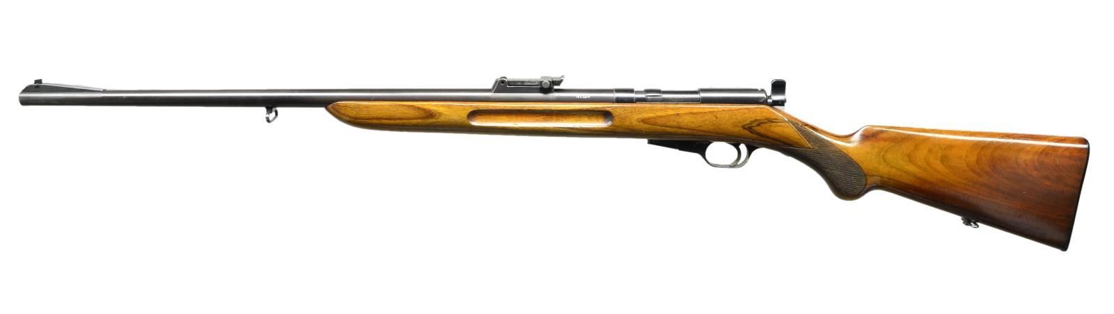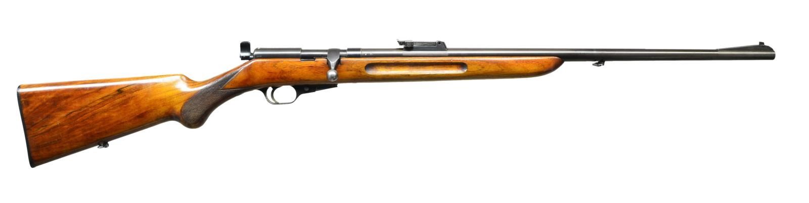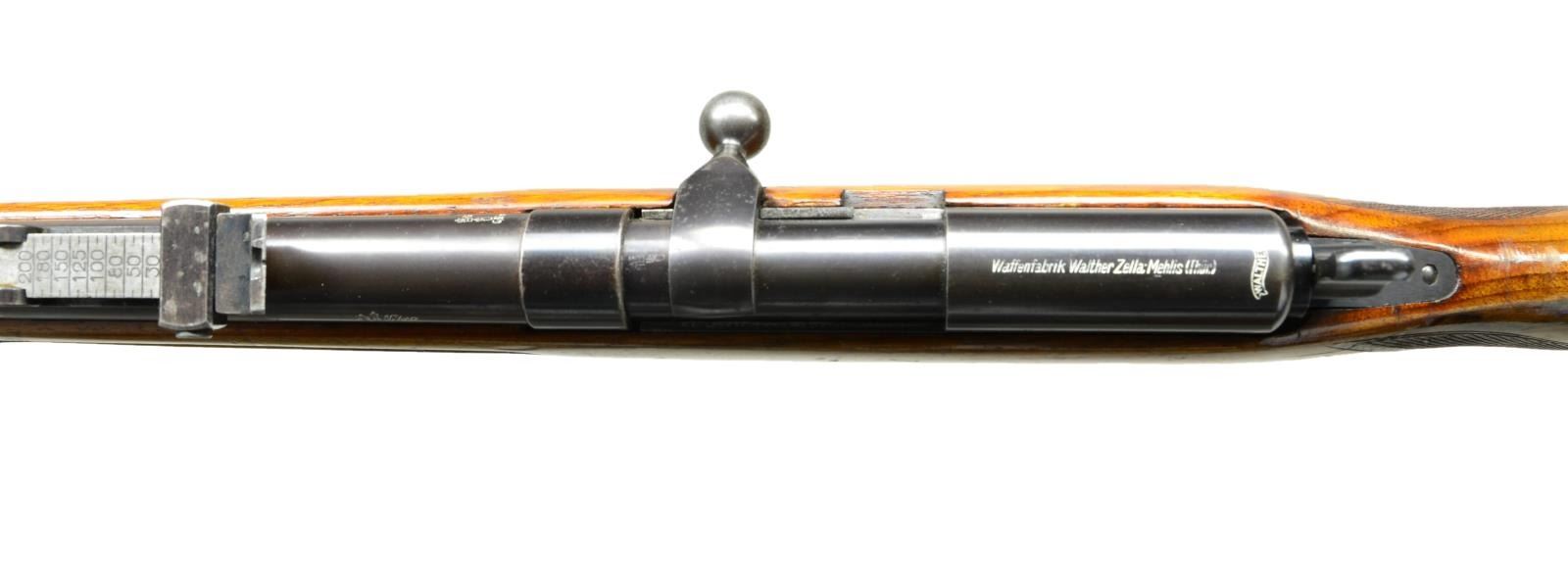 Cal. 22 LR. S# 31384. These high quality rifles from the 30's are fun to shoot. This rifle has 24 1/2" heavy weight barrel with windage adjustable tangent curve rear sight and square bead front in matted ramp. Unusual blowback action can be used either as a semi-auto, bolt action or single shot. Action takes a five shot detachable magazine. Top rear of receiver is marked with Walther info, flag safety has three positions. Round knob pistol grip stock of relatively plain European walnut is fitted with Walther buttplate, has checkering at grip and finger grooves at forend, sling loops are fitted. MAGS: (1-5 rd.). CONDITION: fine. Metal retaining about 85% original blue which is fading to brown on barrel. Bolt knob is considerably silvered. Stock retains over 80% original finish with many scratches and light marks. Bore is bright with some scattered pits. Mechanically fine. These rifles retailed for $87.50 in 1939. The same price as a Winchester Model 52 Sporter. (23-584/MGM). CURIO. $500-900.