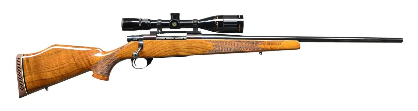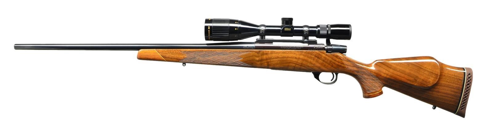 RIFLE. Cal. 7mm Rem Mag. S# VX46813. Bbl. 24" w/out provision for sights. Mfg. 1989-1993 in Japan w/ South Gate address. Features include: distinctive skip line checkering on walnut Monte Carlo stock having sling studs, brown ventilated factory pad w/ white line spacer plus rosewood grip cap & forend; both having white line spacers. Gloss finish throughout & guaranteed 1.5" accuracy at 100 yards. Redfield one piece base & Leupold rings holding Nixon Monarch UCC gloss finished 5.5X-16.5 X AO scope w/ capped target turrets & duplex reticle. CONDITION: 2 small chips in triggerguard finish by front screw. All other aspects near excellent appearing new including all of scope set & bore. Very slight plum hue to action. (22-5722/NW). MODERN. $700-1,000.