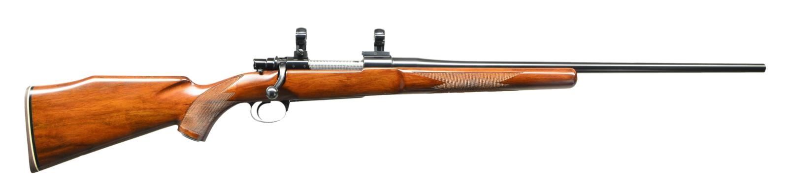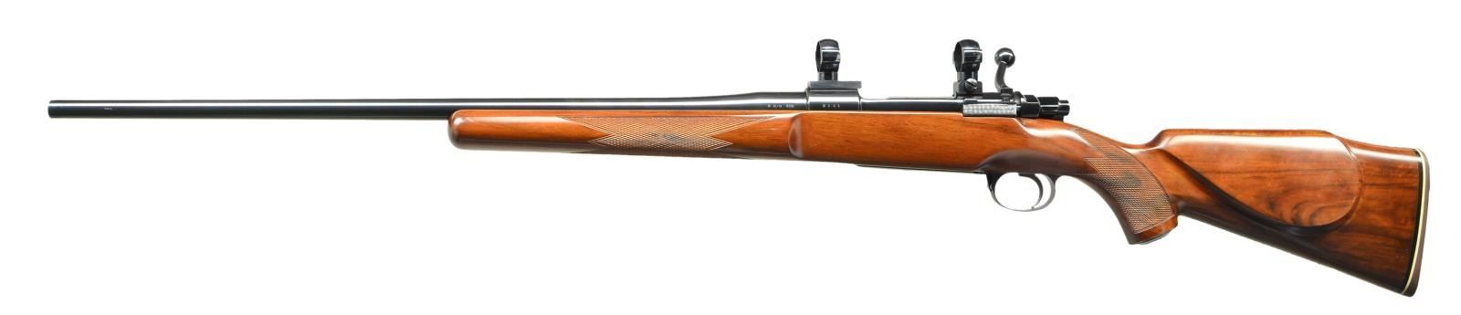 Cal. 6mm Rem. S# 2151. Bbl. 24 1/2" w/out provision for sights; marked "6 M/M REM." plus "PAUL JAEGER - JENKINTOWN, PA.". Mfg. December 1970 having "12/70" on bottom of bbl. over "XX" & additionally w/ circled "J", "DO" & "151". Bottom of receiver has blocked shape "S" in diamond plus Belgian lion over "PV" proof. Appears to be FN mfg. Commercial 98 Mauser style action having commercial trigger guard w/ hinged floorplate & Allen head screws. Additional points are Jaeger adj. trigger, right of shroud sliding safety, Redfield 2 piece base set, medium Redfield 4 top screw rings, provision for receiver sight on right of rear bridge plus jeweling on bolt body, extractor, floorplate & bolt stop. Checkered walnut stock set having semi-beavertail forend, shadow line Monte Carlo cheekpiece, steel grip cap, White Line brown buttpad, provision for sling swivels / studs (removed), European style thinning of stock near trigger plus 4 checkered panels; standard style in grip area plus almost wrap around on forend leaving 5/8" to 1/2" tapered uncheckered area between front panels. Bolt handle lightly swept back, fine checkering on flat bottom & pronounced distance from stock allowing positive operation w/ gloved hand. Glassed action to include recoil lug area, rear of action, trigger guard w/ steel pillars plus first 5" of bbl. w/ constant contact to forend tip. CONDITION: excellent example by well known custom gunsmith w/ all aspects including bore near excellent; just add swivels or studs. (23-248/NW). CURIO. $900-1,400.