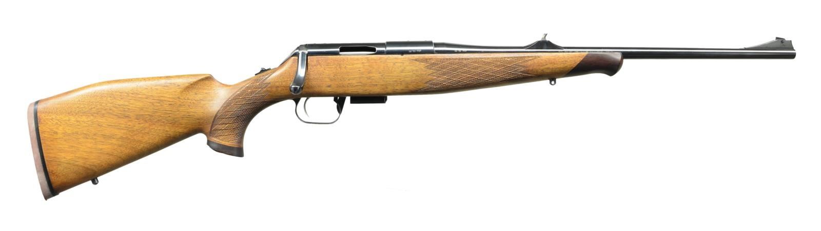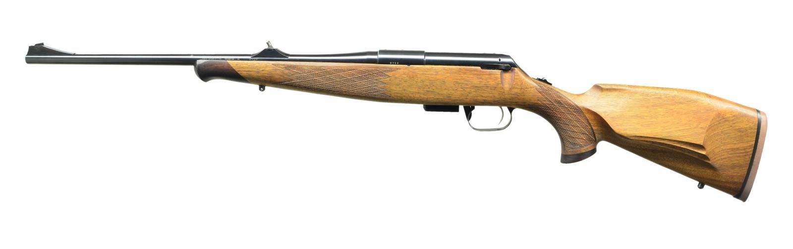 ACTION RIFLE. Cal. 5.7 UCC (Caseless) S# 0250. Bbl. 20.5". The Voere VEC91 claims to be the first mass produced caseless ammo hunting rifle. It utilizes an electronic ignition and has the potential for amazing accuracy due to the ignition rate of the nitrocelluloses charge, which is faster than traditional smokeless powders by a factor of 10. It also has no residue after burning, so no spent case to eject. It simply burns up completely making the chamber ready for another round. The electronic trigger is activated w/ the assistance of two 15 volt batteries located in the pistol grip. Blued finish steel. Ramped blade front & drift adjustable dovetailed rear sights. Walnut stock w/ Bavarian cheekpiece & Scottish Fish Scale Checkering on forend & pistol grip. MAGS: 1 factory 7 rd. UNATTACHED ACCESSORIES: Foam lined black plastic Gun Guard case, factory paperwork, 2 Varta 15v batteries & 2 boxes (24 rds. total) JagerSport 5.7 caseless ammo. CONDITION: All outward appearances as well as notes from consigner, indicate as new. No noticeable blemishing of any kind. Ammo appears serviceable though 1 rd. is missing priming compound. Bright bore w/ strong rifling. (23-66/JZ). MODERN. $1,500-2,500.
