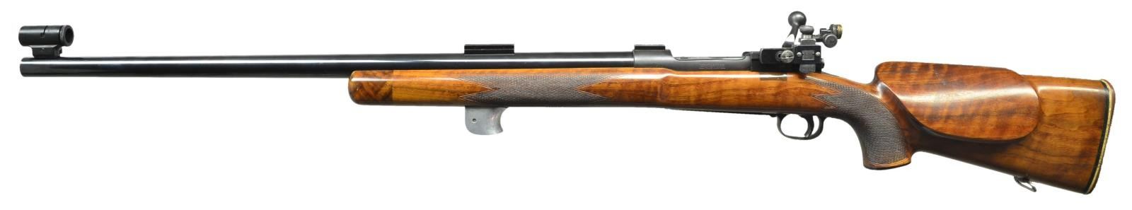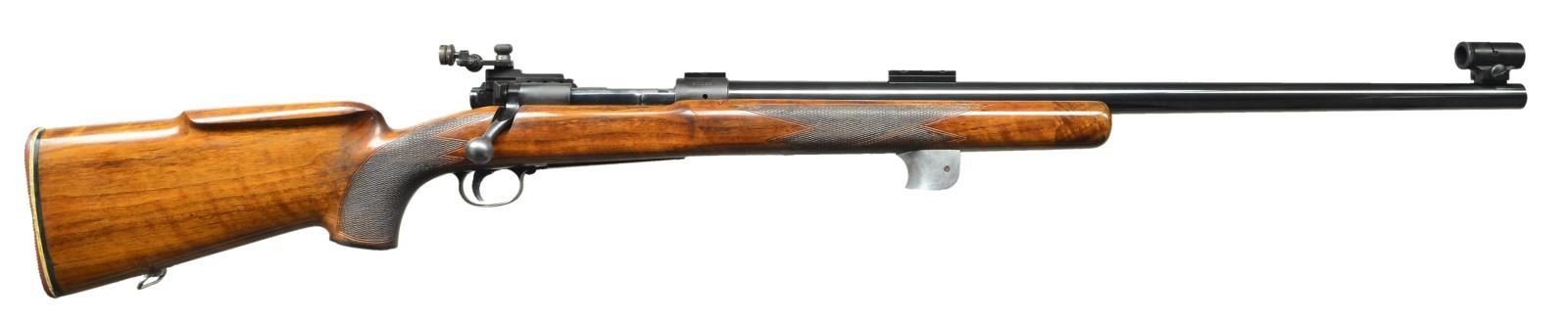 WINCHESTER PRE-WAR MODEL 70 ACTION. Cal. 30-06. S# 30239. Bbl. Unmarked 26" bull bbl. Pre-war action with clover leaf tang. Replacement bolt has 3rd type safety. Redfield Olympic receiver sight and globe front sight. Front ring of action and bbl. are fitted with scope blocks. Custom single stage target trigger with wide grooved shoe. Custom lightly figured Monte Carlo target stock with roll over cheekpiece & contrasting forend tip. Features include point pattern hand checkering, aluminum palm rest on acc. rail, plastic grip cap and inletted rear swivel. LOP. 13 1/8" over a thin rifle pad. Weight. 12 lbs., 15.2 oz, making this a pleasant rifle to shoot. UNATTACHED ACCESSORIES: 1 1/4" military style leather sling. CONDITION: bbl. retains over 90% custom high polish bluing. Action shows mild wear to original finish. There are 4 added holes with filler screws. There are two small spots, approx 1/4" each, on top of rear bridge that appear to have been by way of grinding. Floorplate shows moderate finish wear from use. Reblued trigger guard shows some thinning to finish. Very good stock shows some scattered light handling marks commensurate with use. Right side of stock has filler from previously installed receiver sight. Bright bore retains sharp rifling. Overall a very good rifle for anyone wanting to try their hand at long distance shooting! (22-6014/BH). MODERN. $800-1200.