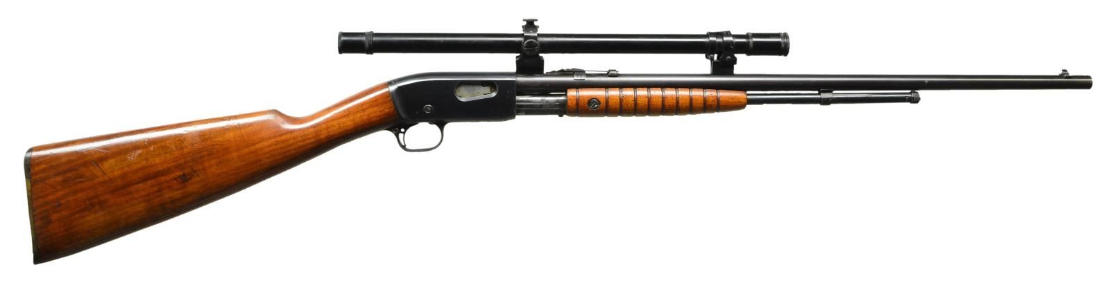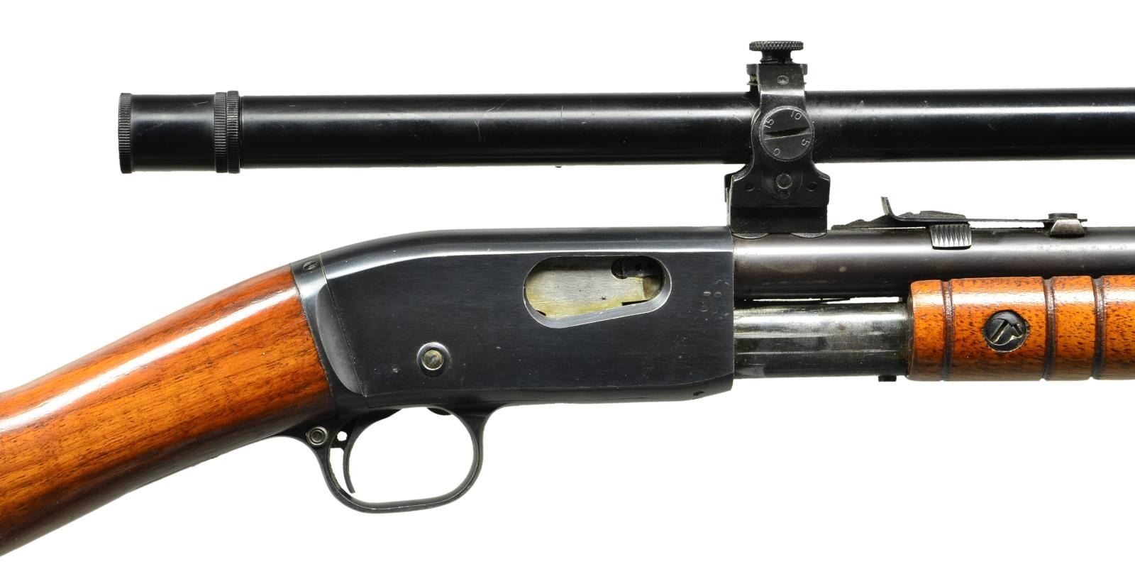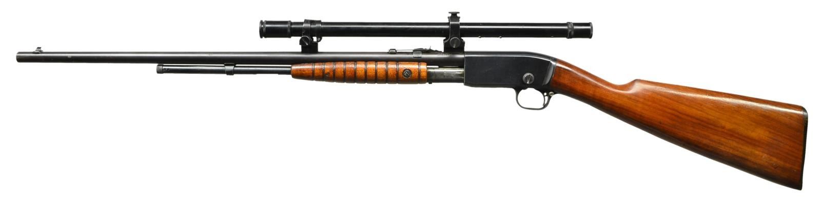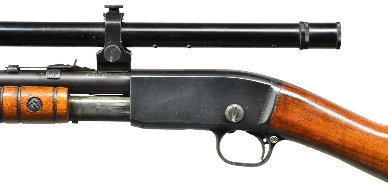 Cal. 22 S, L, LR. S# 483953. Bbl. 22" round with original sporting sights. Bbl. mounted Winchester scope with external adjustments as used on Winchester model 677 or 697 factory scoped rifles. Crosshair reticle; front bar numbered 3 & shimmed rear numbered 5. Tubular mag. Small round grooved forearm and straight grip walnut stock with checkered hard rubber buttplate. CONDITION: 70% lightly faded blue showing slide and carry wear with small dents and marks. Wood has added finish over light wear with scattered scratches and marks. Very good to excellent scope finish with near excellent optics. Very good bright bore. (21-4077/DS). CURIO. $500-700.