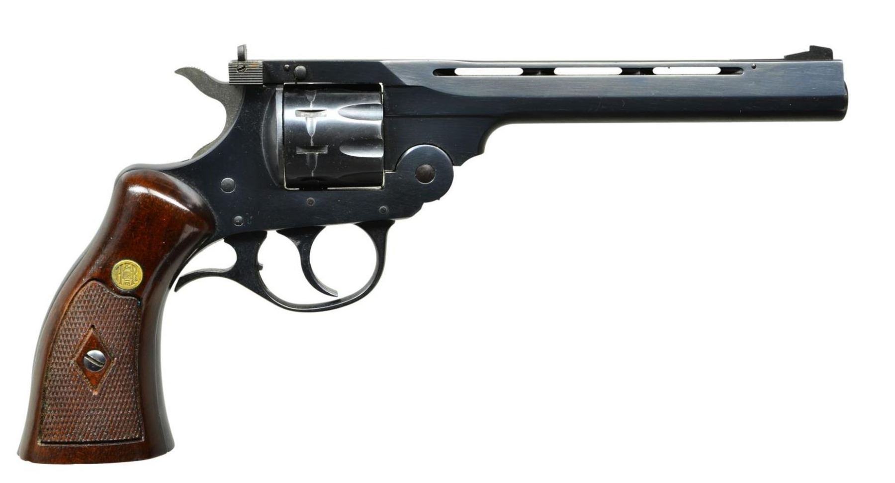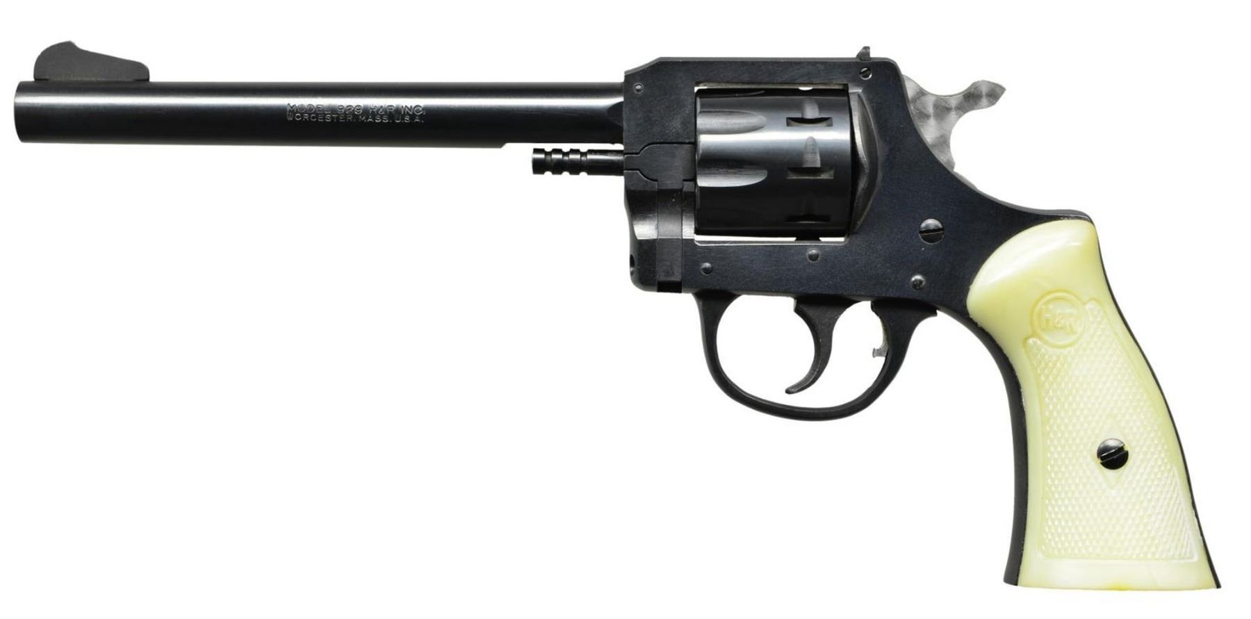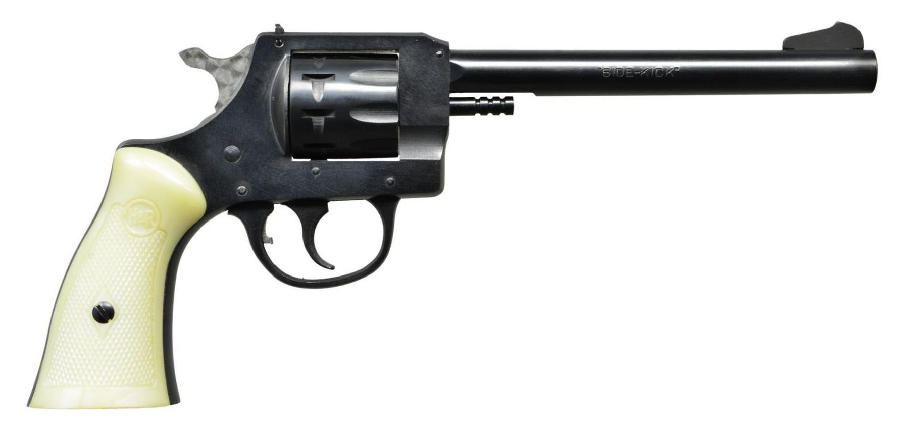1) MODEL 929 SIDE-KICK. Cal. 22 LR. S# W11930 ("W" = 1960). Bbl. 6" w/ open sights. Swing out 9 shot fluted cyl. Hammer has firing pin & engine turned on sides. Square butt frame w/ white plastic grips having H&R monogram. CONDITION: near excellent overall w/ light scuffs on bottom of grips & cyl. turn line. Near excellent bore. (22-5509/MD). CURIO.