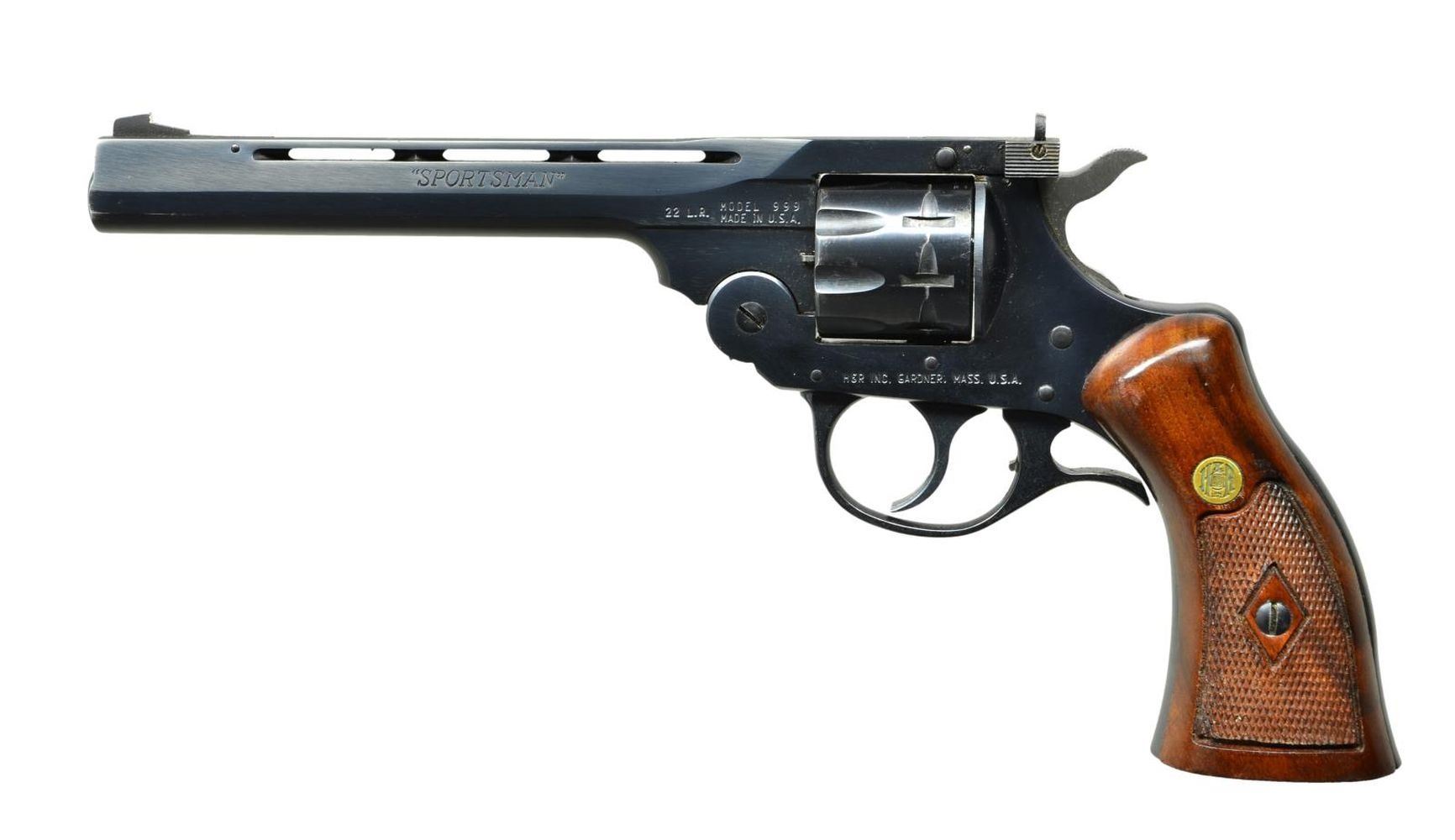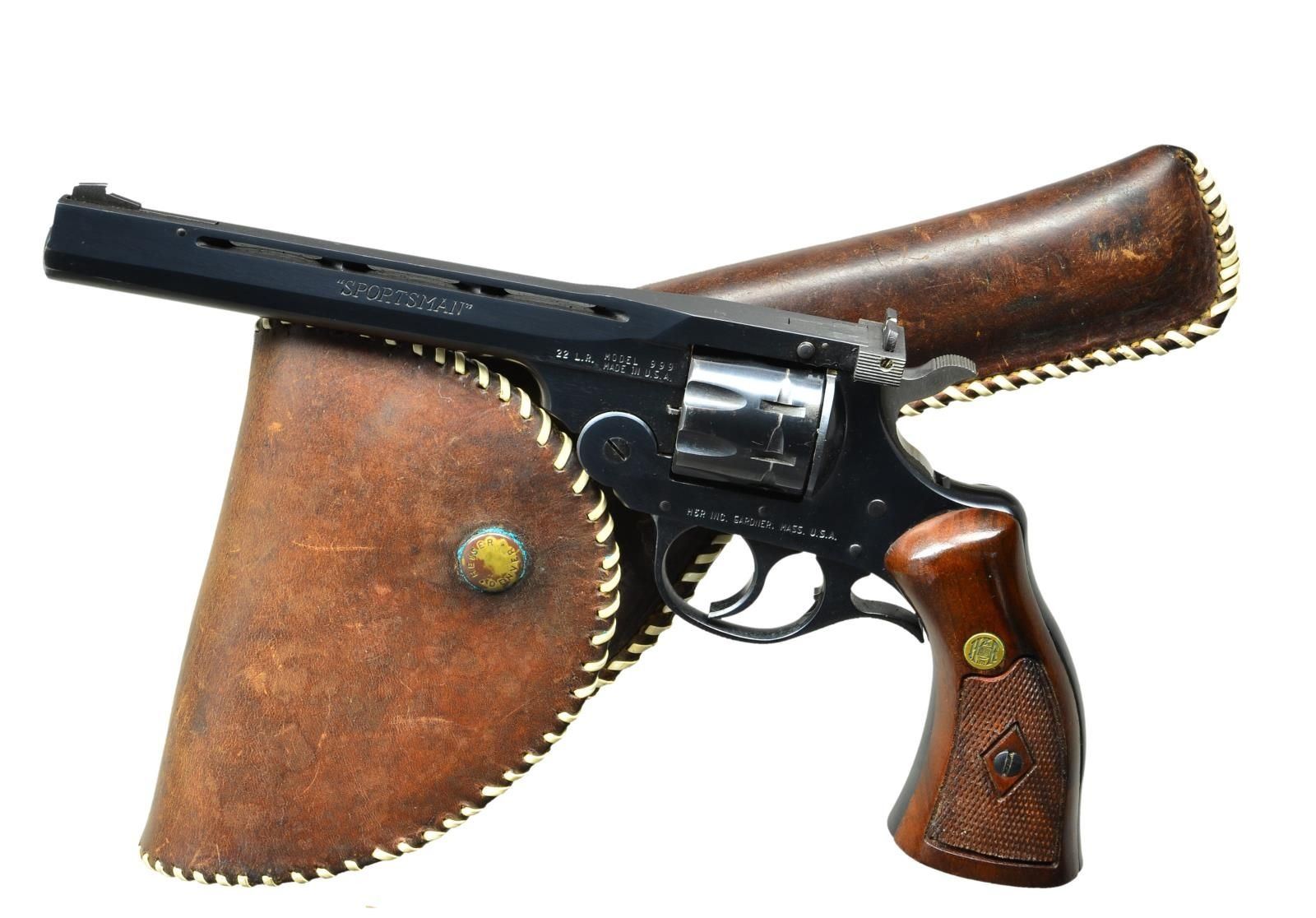 2) MODEL 999 SPORTSMAN THIRD MODEL TOP BREAK. Cal. 22 LR. S# AS33166 ("AS"= 1978). Bbl. 6" w/ VR, pinned Patridge front sight & adj rear sight (white paint added to sight profiles. 9 Shot fluted cyl.; matching numbered cyl. & extractor. Checkered bordered walnut grips w/ H&R medallions. UNATTACHED ACCESSORIES: HH Heiser "1435 / 10" holster in fair condition. CONDITION: very good to near excellent overall w/ light muzzle, cyl. turn line & occasional pinprick oxidation. Near excellent grips & bore. (22-5510/MD). MODERN. $550-900.